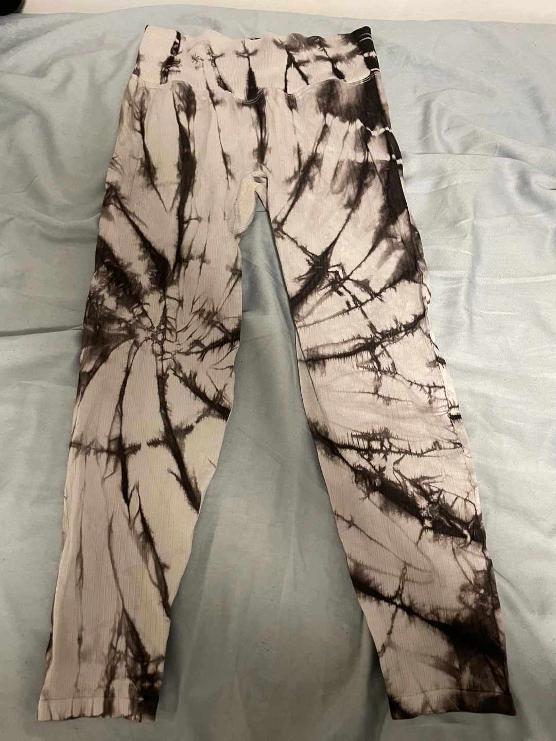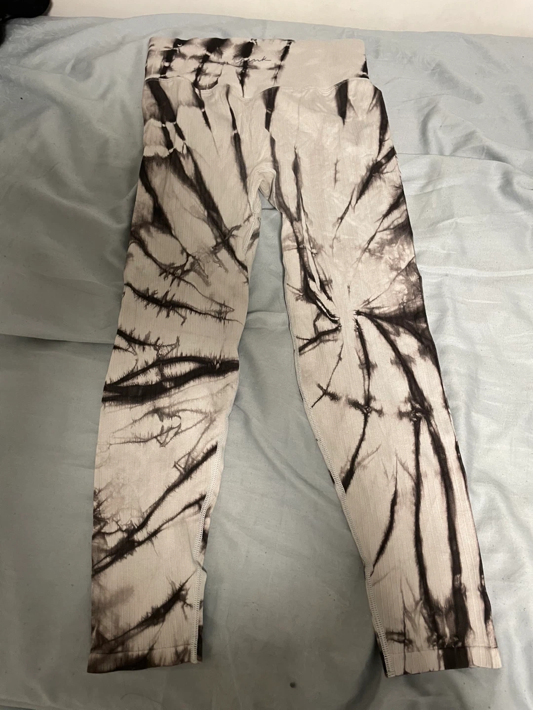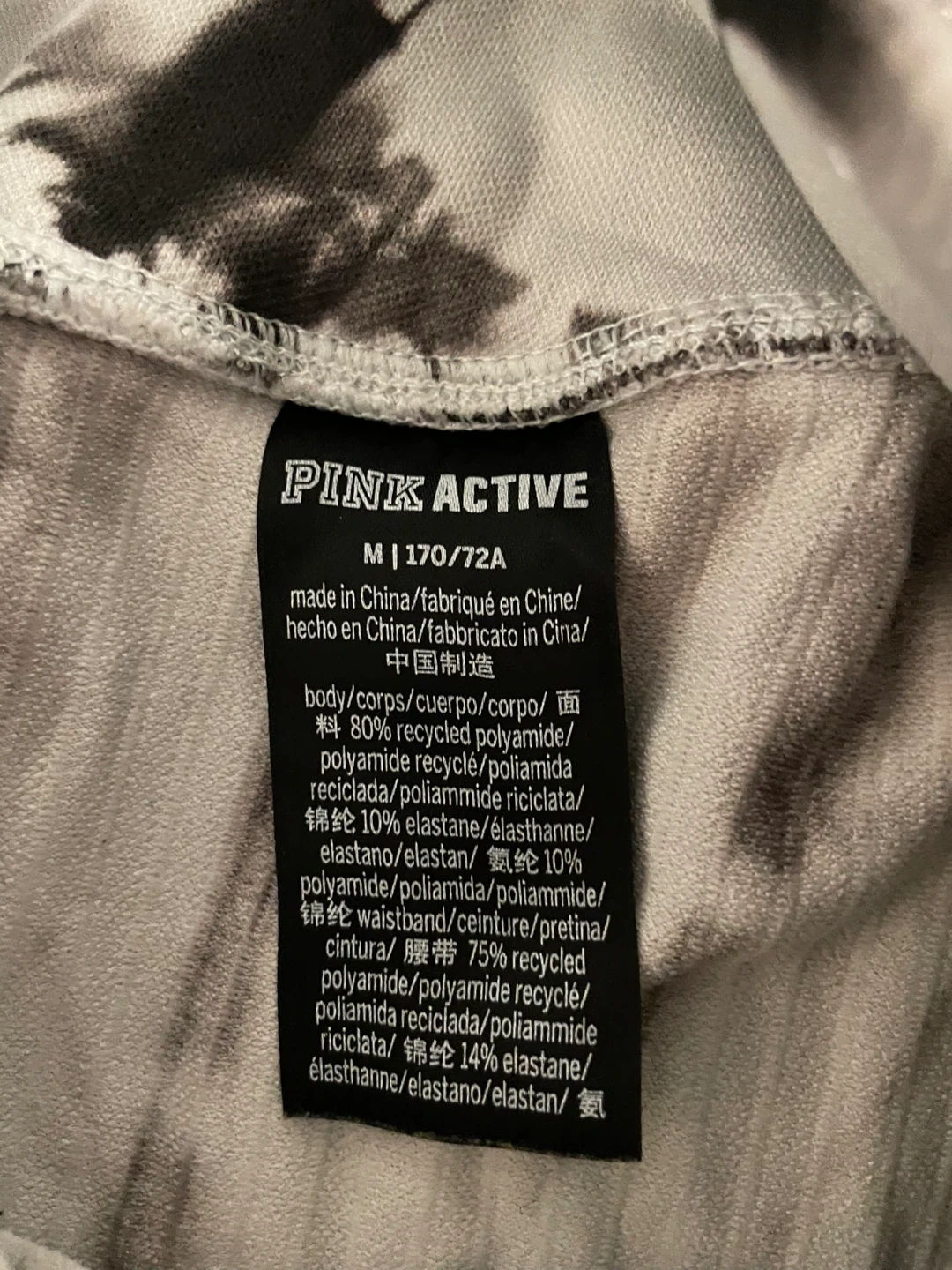 Selling a pair of Pink Active leggings in a cool tie-dye pattern. They are a size medium and made with a blend of recycled polyamide and elastane for a comfortable fit. Perfect for workouts or just lounging around!