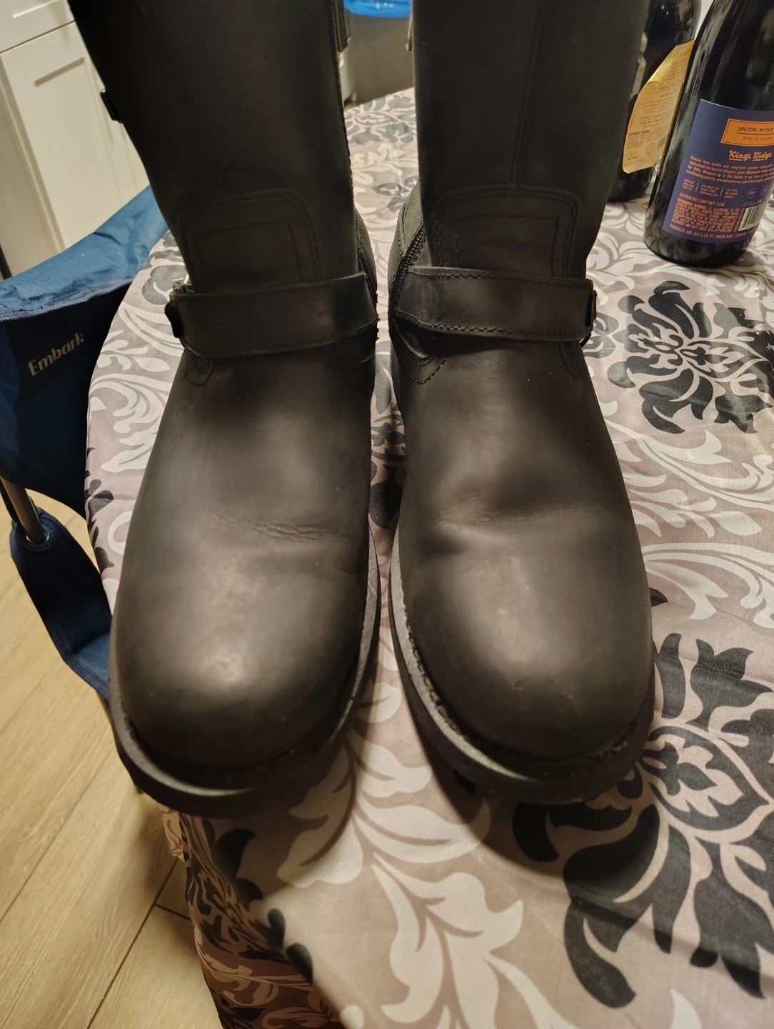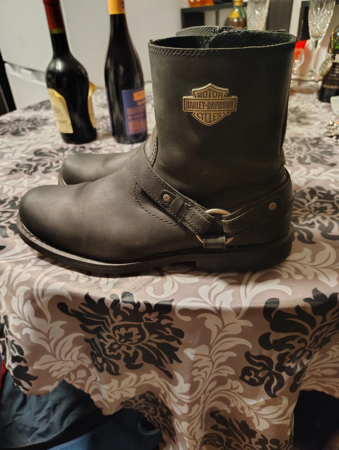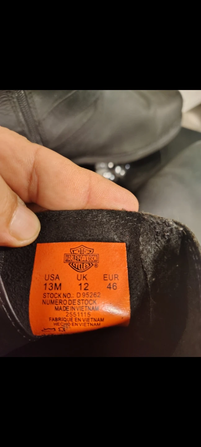 Black leather motorcycle boots from Harley-Davidson. These boots are size 13 US, 12 UK, and 46 EUR. They feature a buckle strap and zip closure.