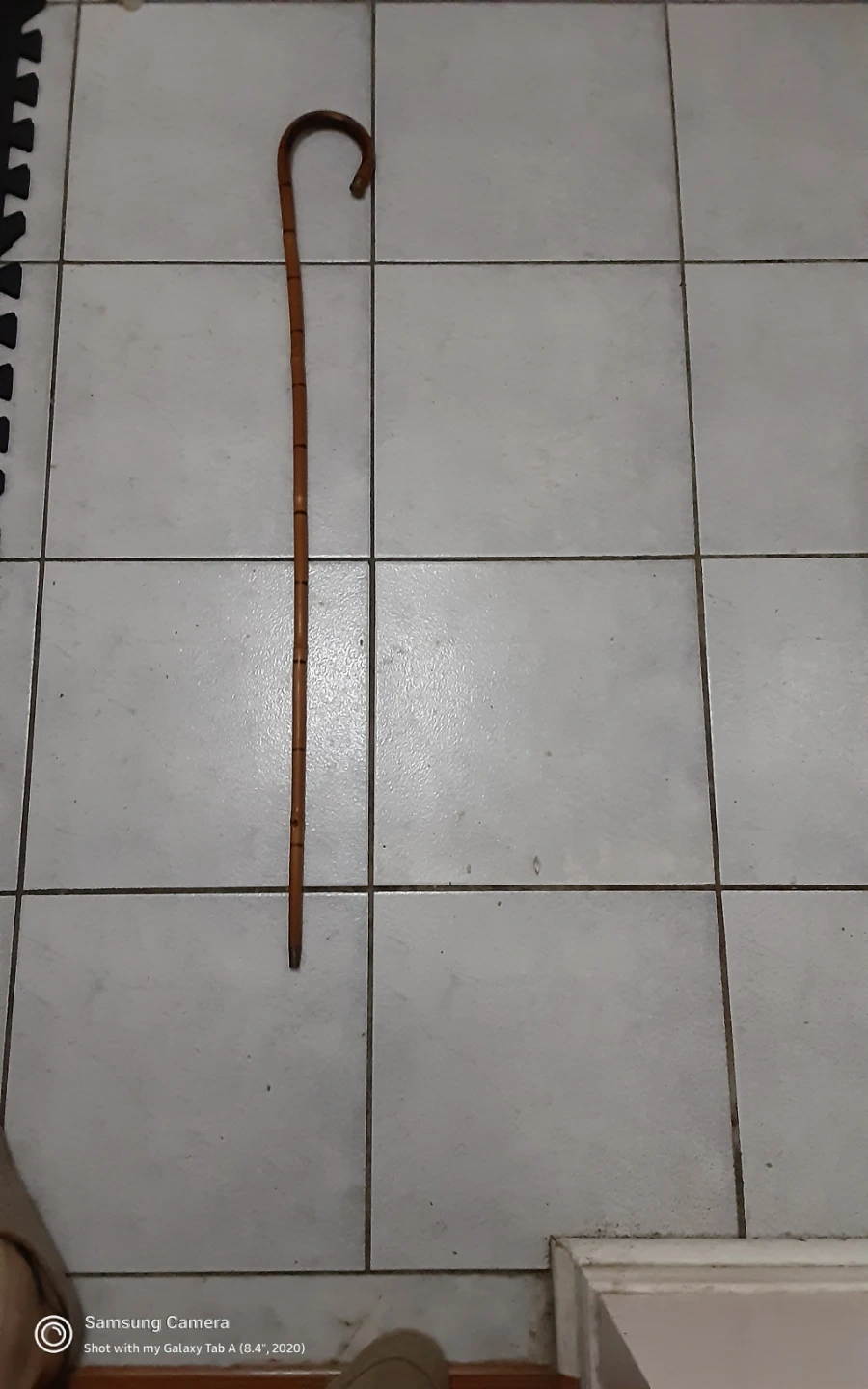 This is a vintage walking cane made from bamboo. It has a curved handle and a metal tip. It's lightweight and sturdy.