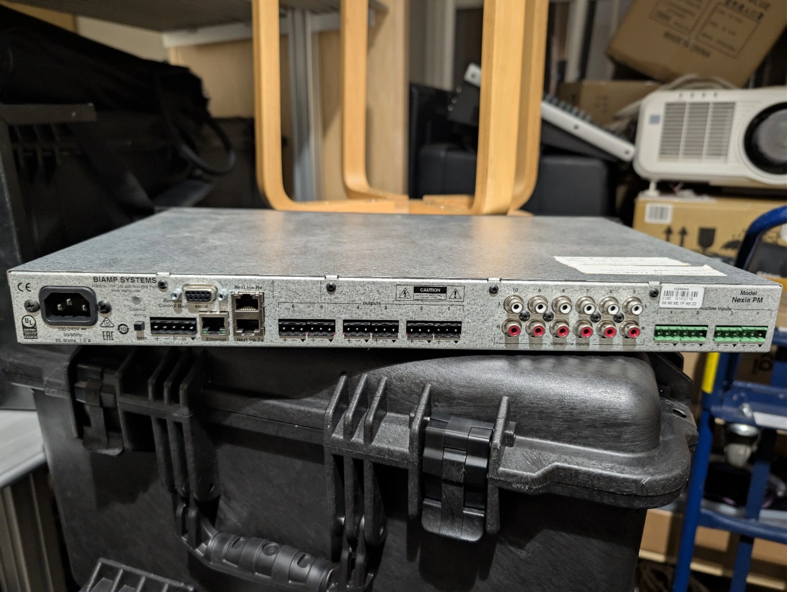 Used Biamp Nexia PM digital signal processor. Rack-mountable (1U) with 10 inputs and 6 outputs. Features include equalizer and various ports (Ethernet, RCA, mic/line, control, serial, VGA). Gray color.