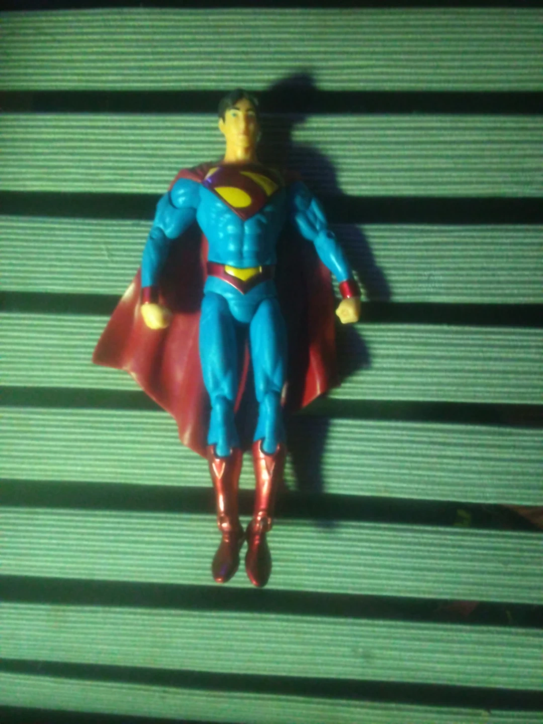 This is a Superman action figure. It's blue with a red cape and red boots. The figure's costume has the classic Superman 'S' shield on the chest.