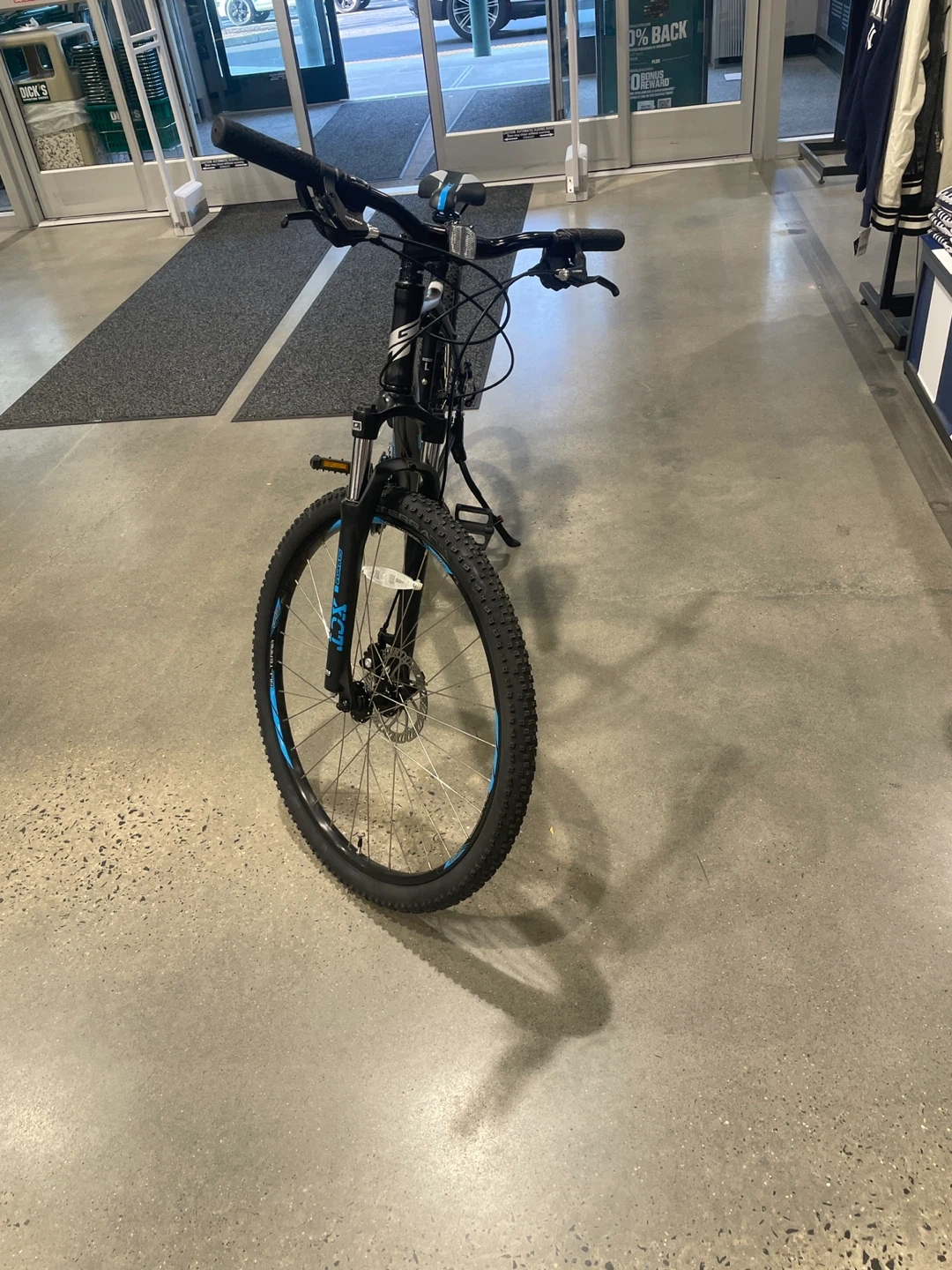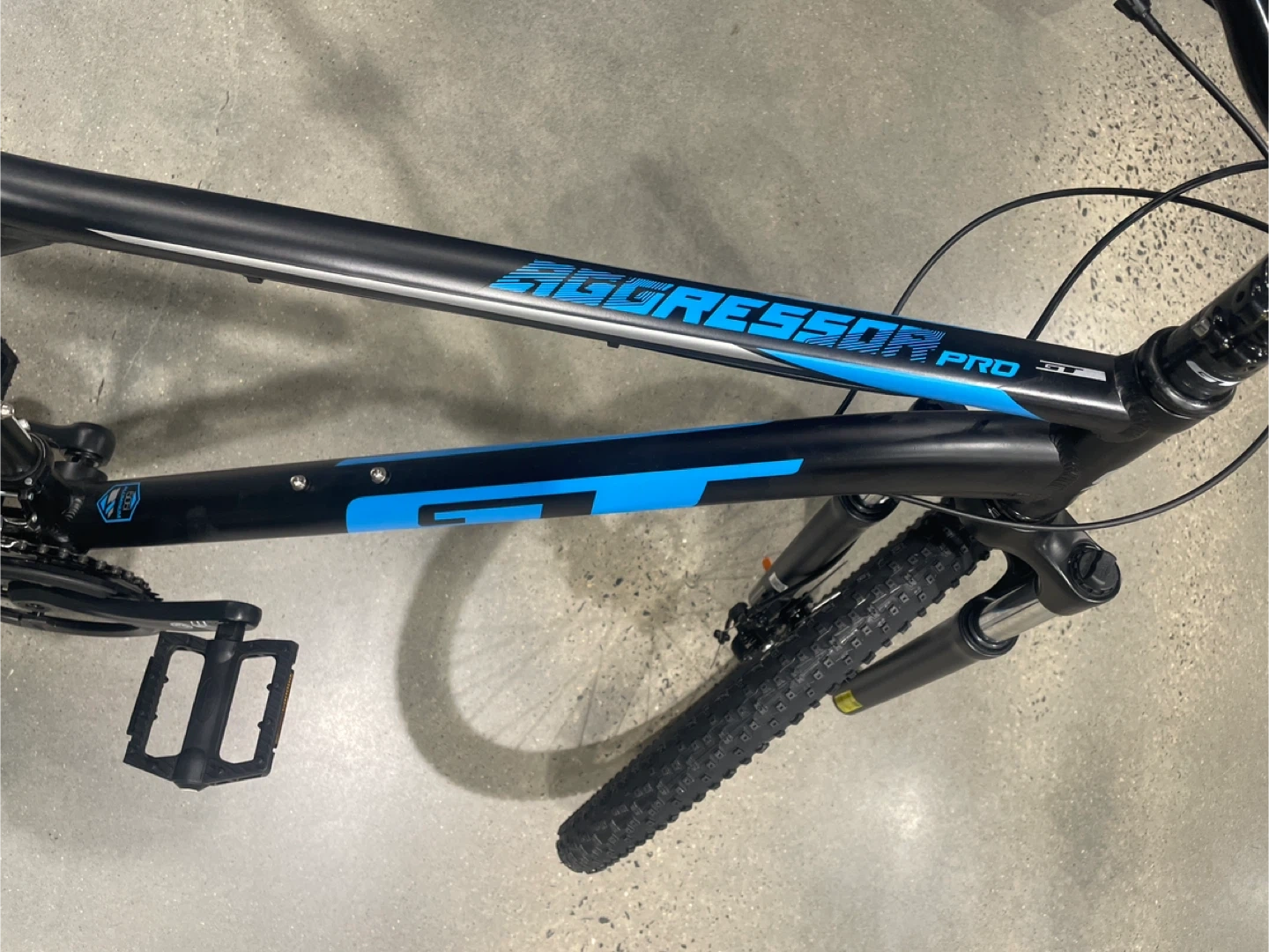This is a GT Aggressor Pro mountain bike with a black frame and blue accents. It features disc brakes and a front suspension fork. This bike is suitable for trail riding.