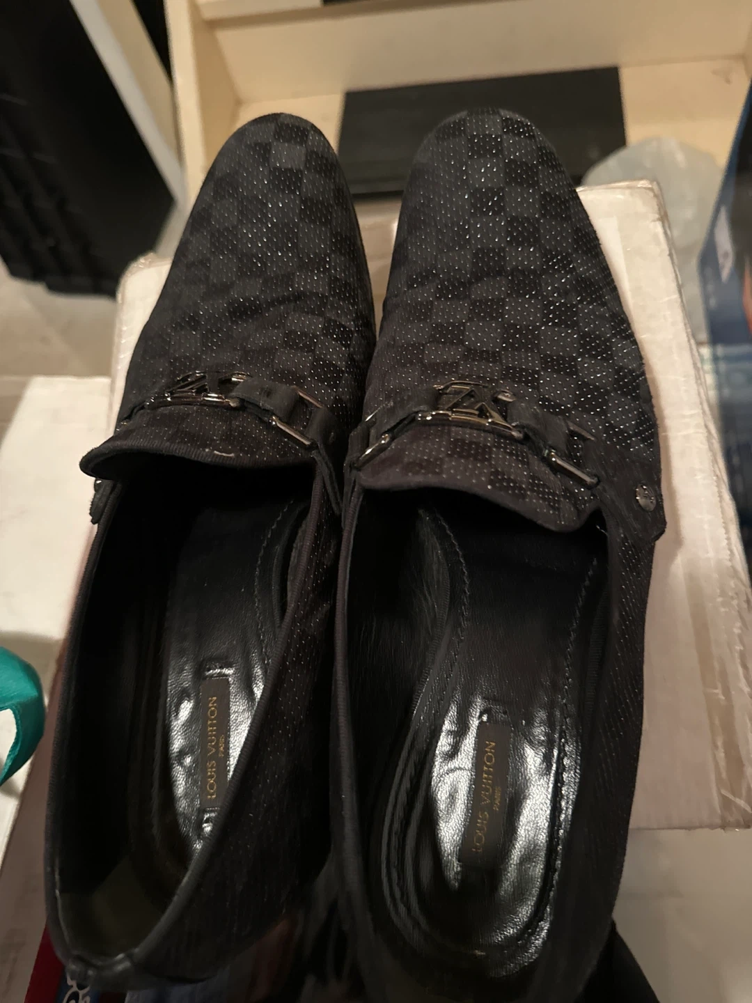 Black Louis Vuitton loafers for men. Features the iconic LV monogram pattern and a decorative buckle. These shoes are made of a textured material. A stylish addition to any outfit!
