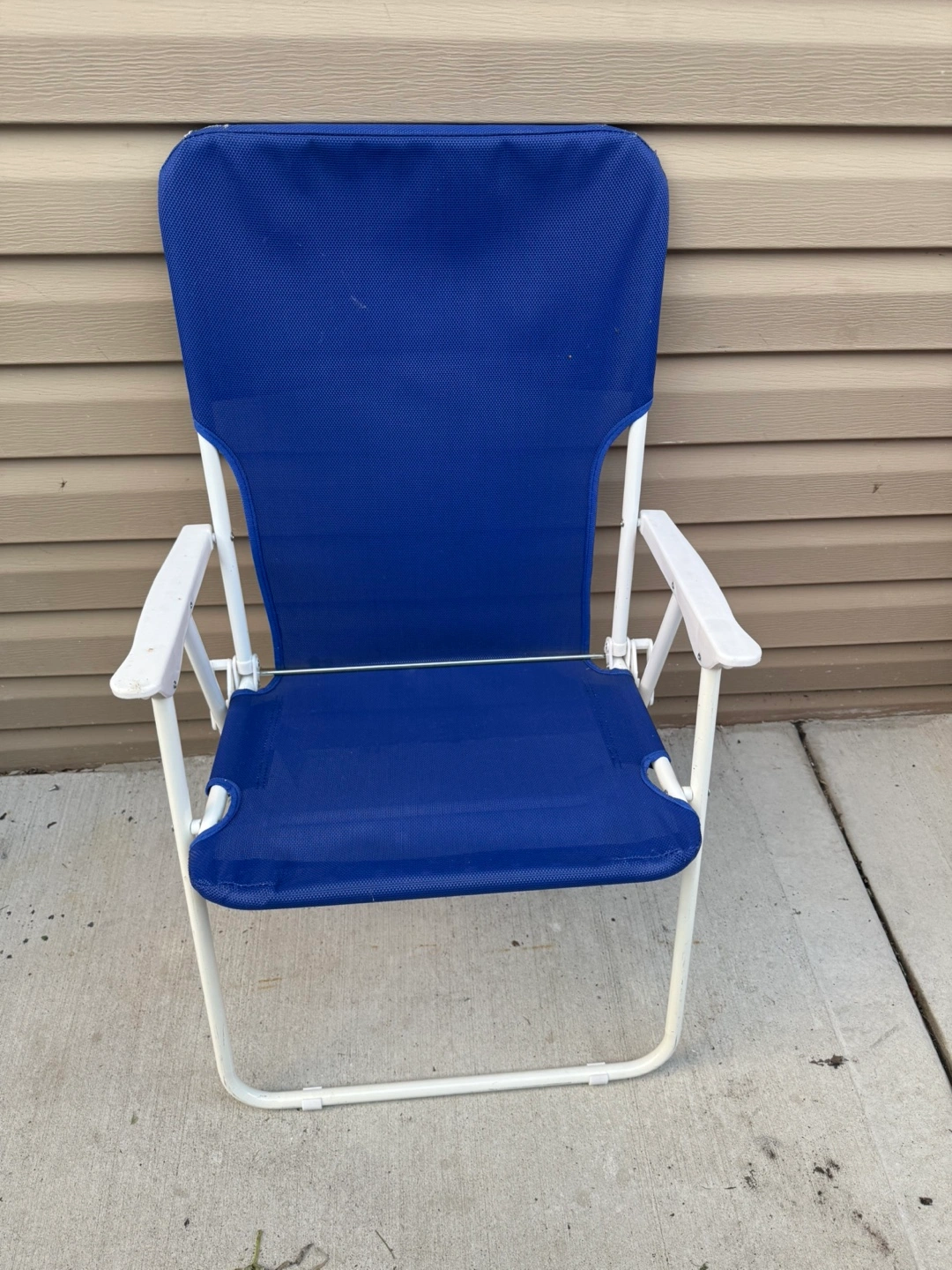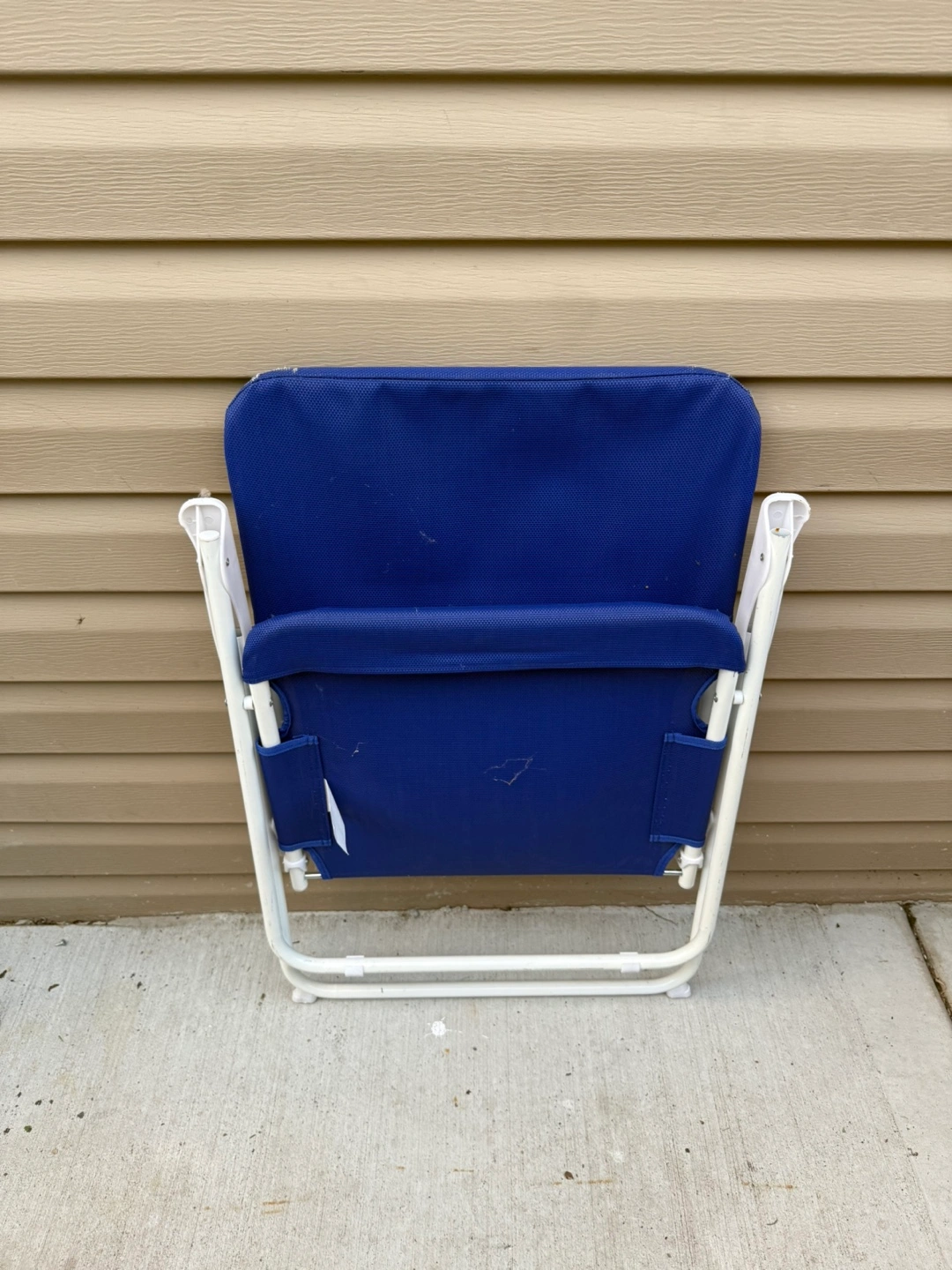 Selling a blue folding beach chair. It's in good condition and perfect for taking to the beach or park. It's lightweight and easy to carry, making it great for outdoor relaxation