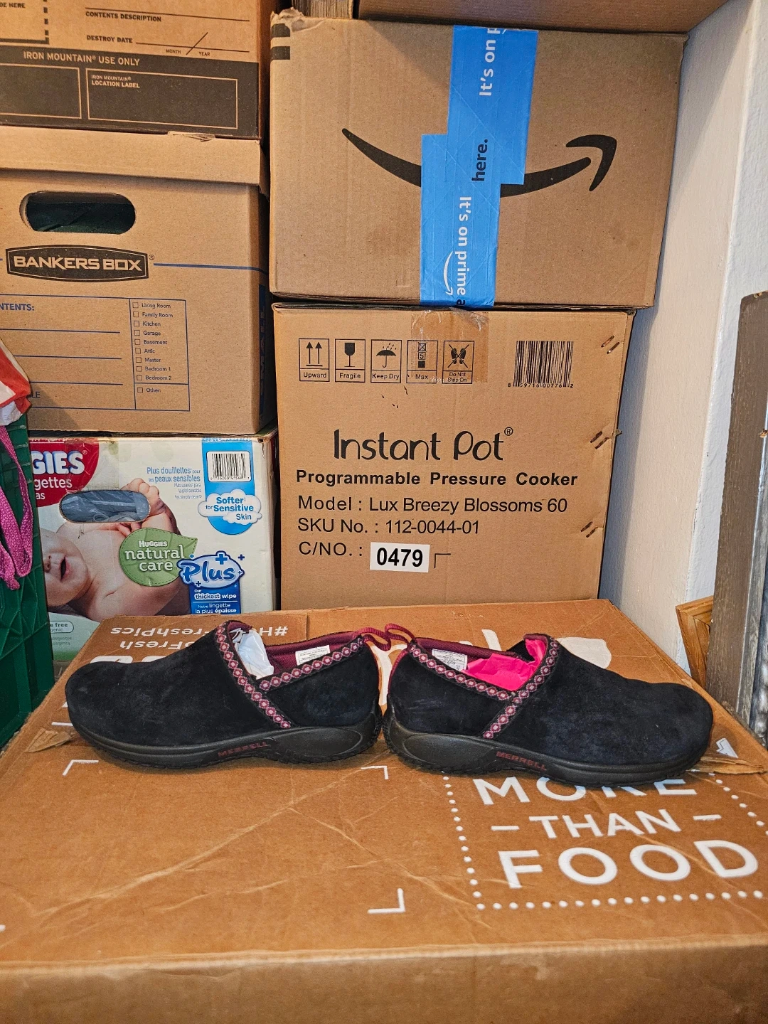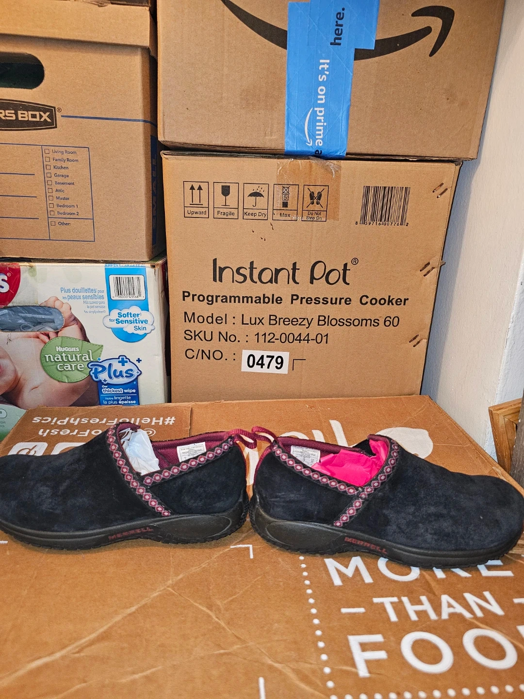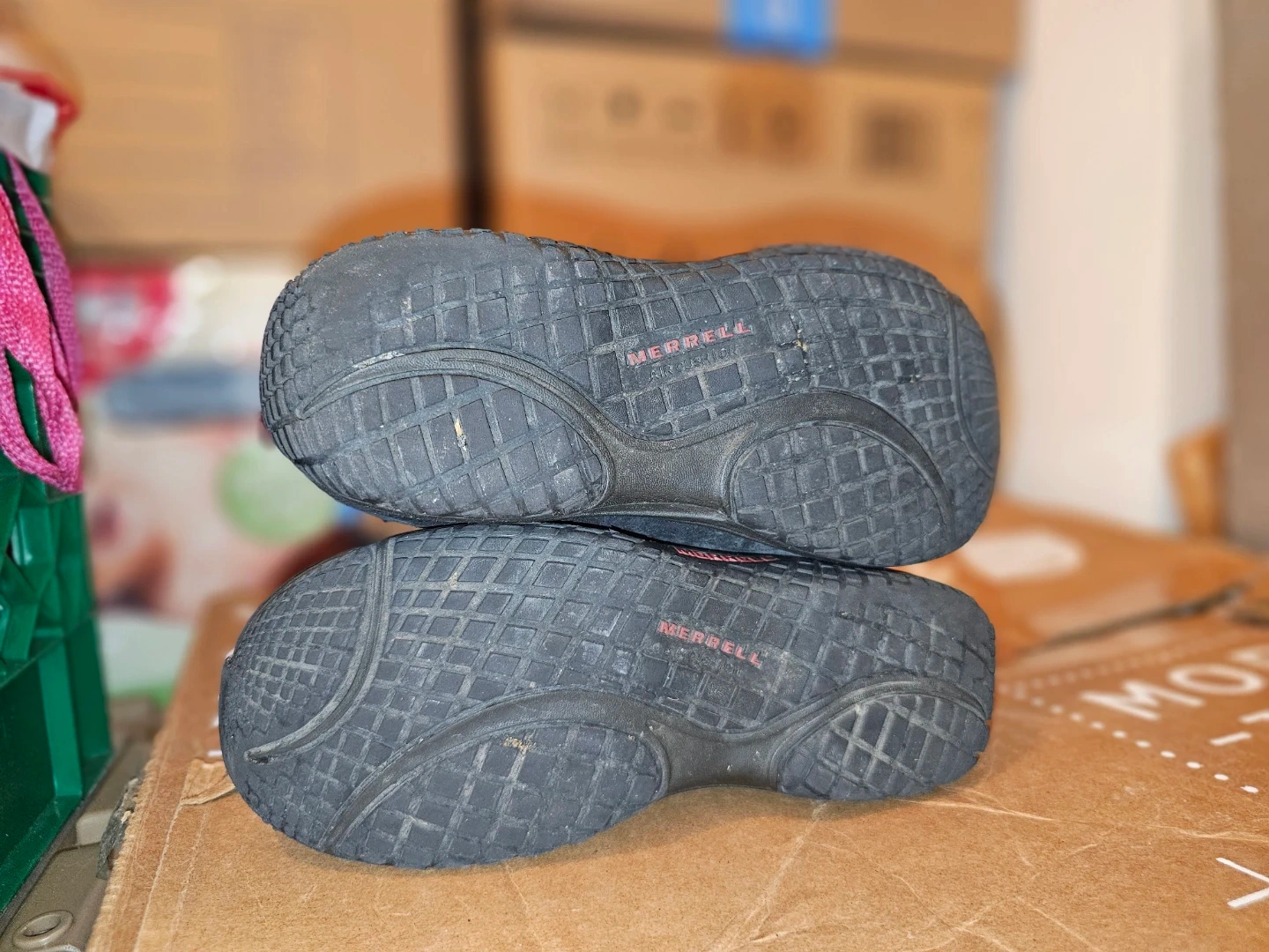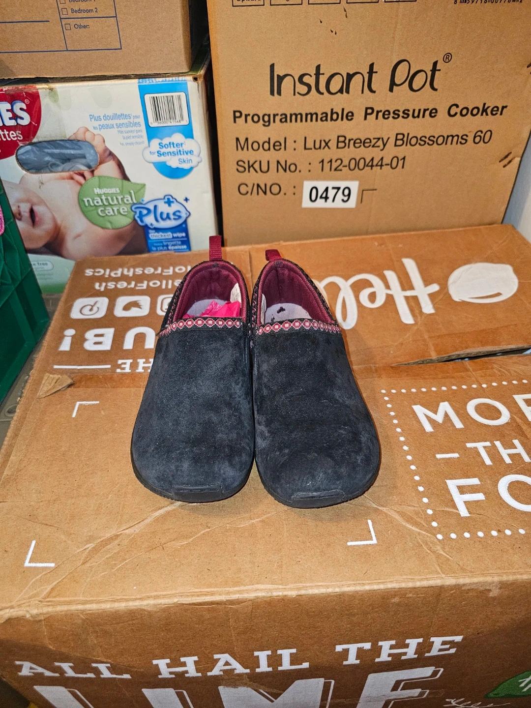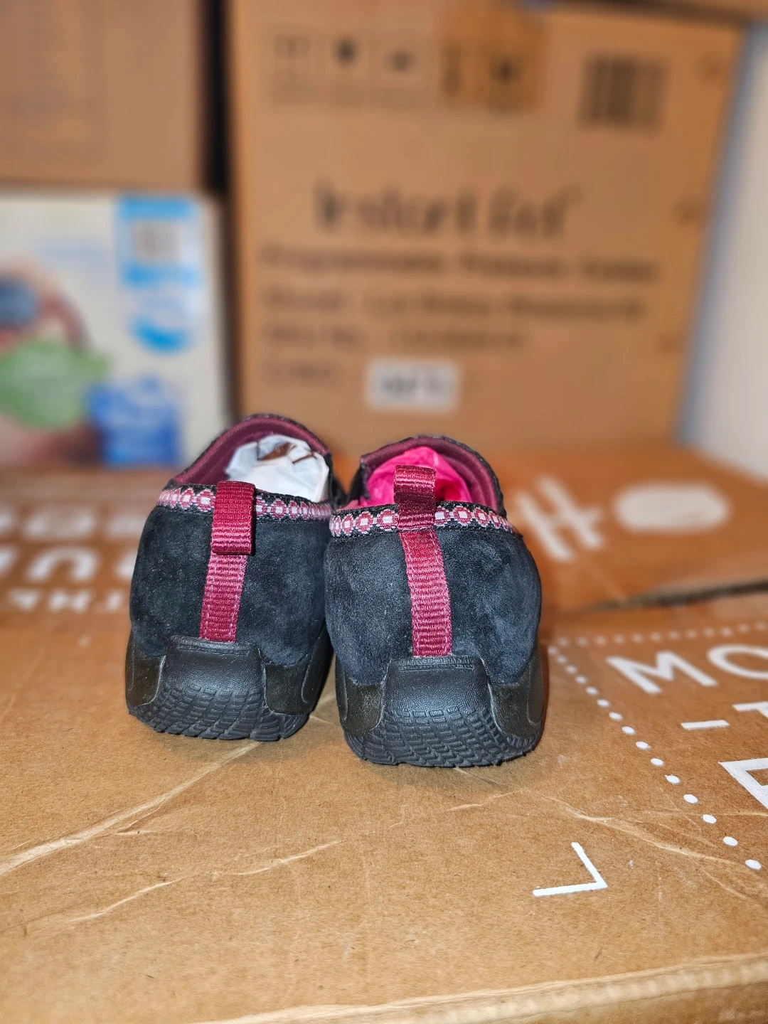 Comfortable Merrell slip-on shoes in black suede. Features a decorative pink and black trim around the opening. These are great for casual wear.