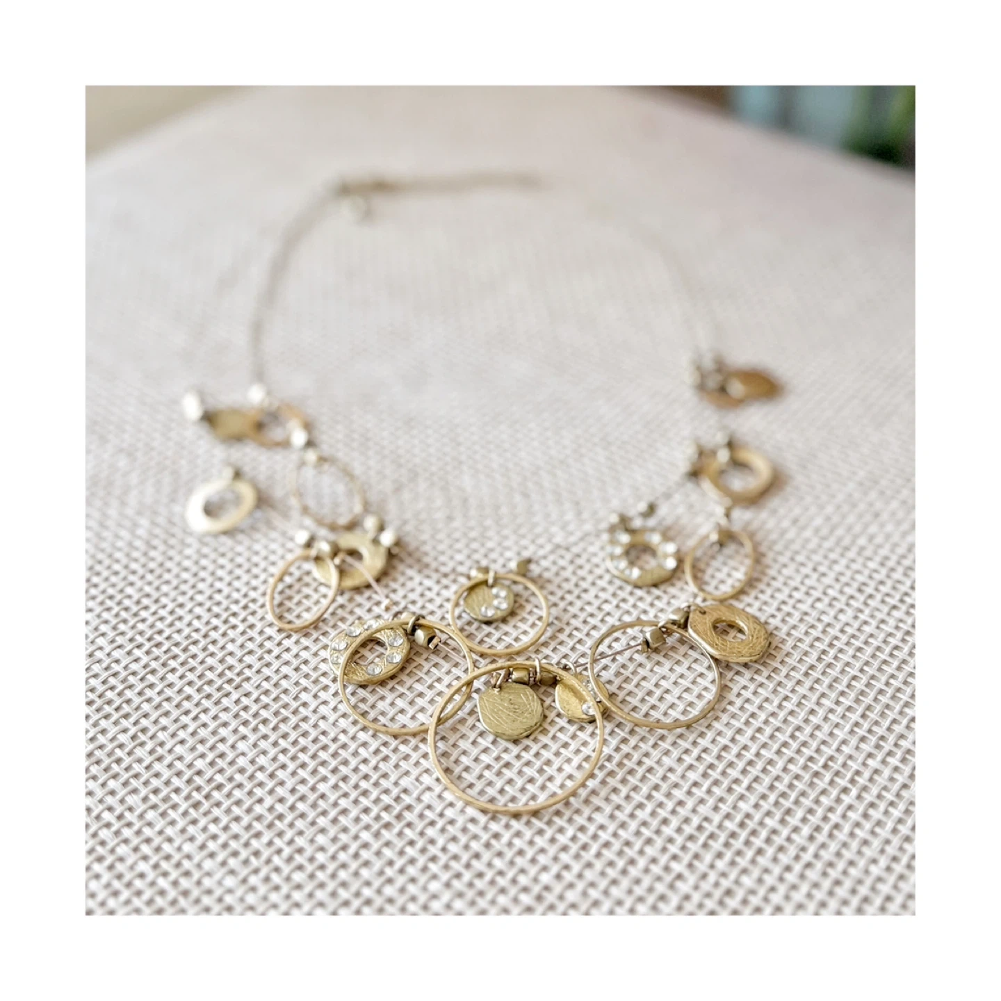Selling a cute gold-tone necklace with circle pendants. It's in great condition and would be a lovely addition to any outfit.