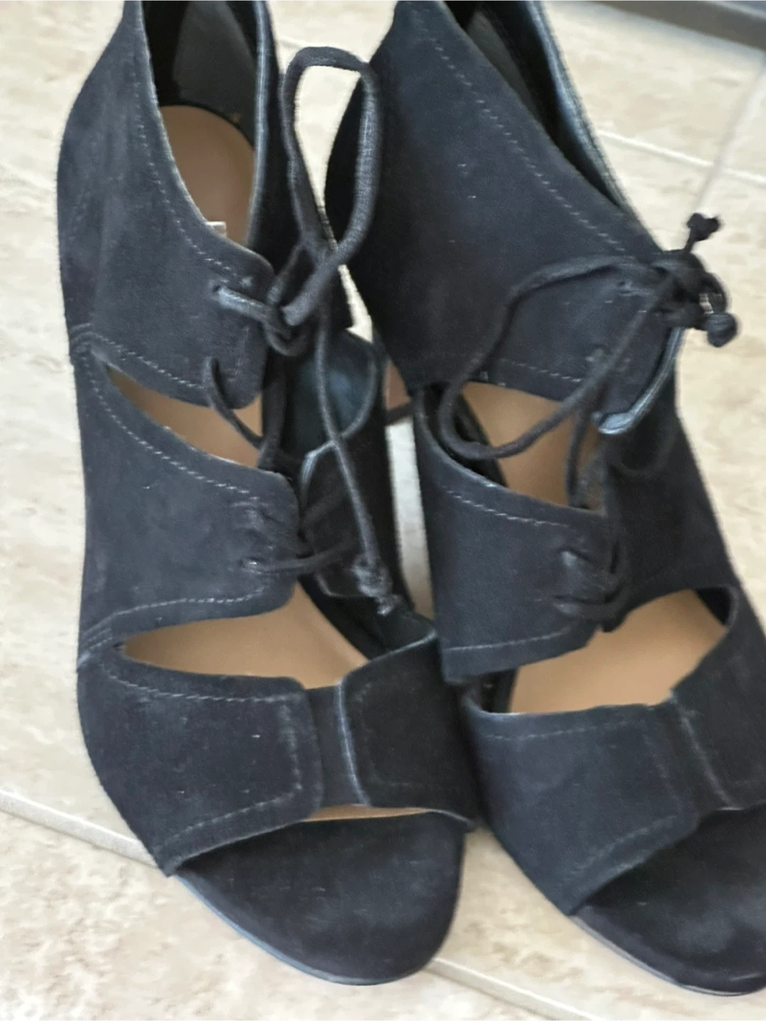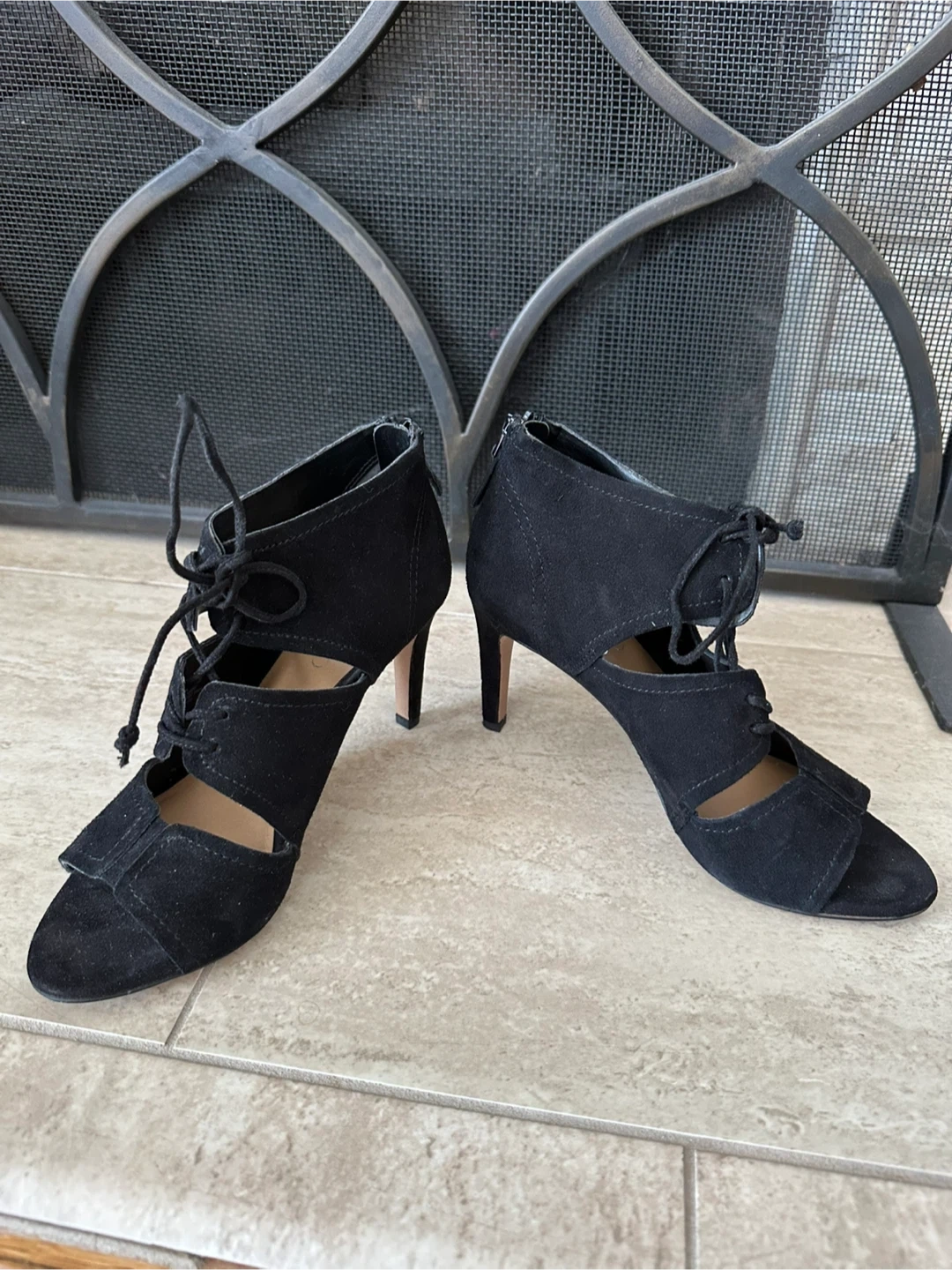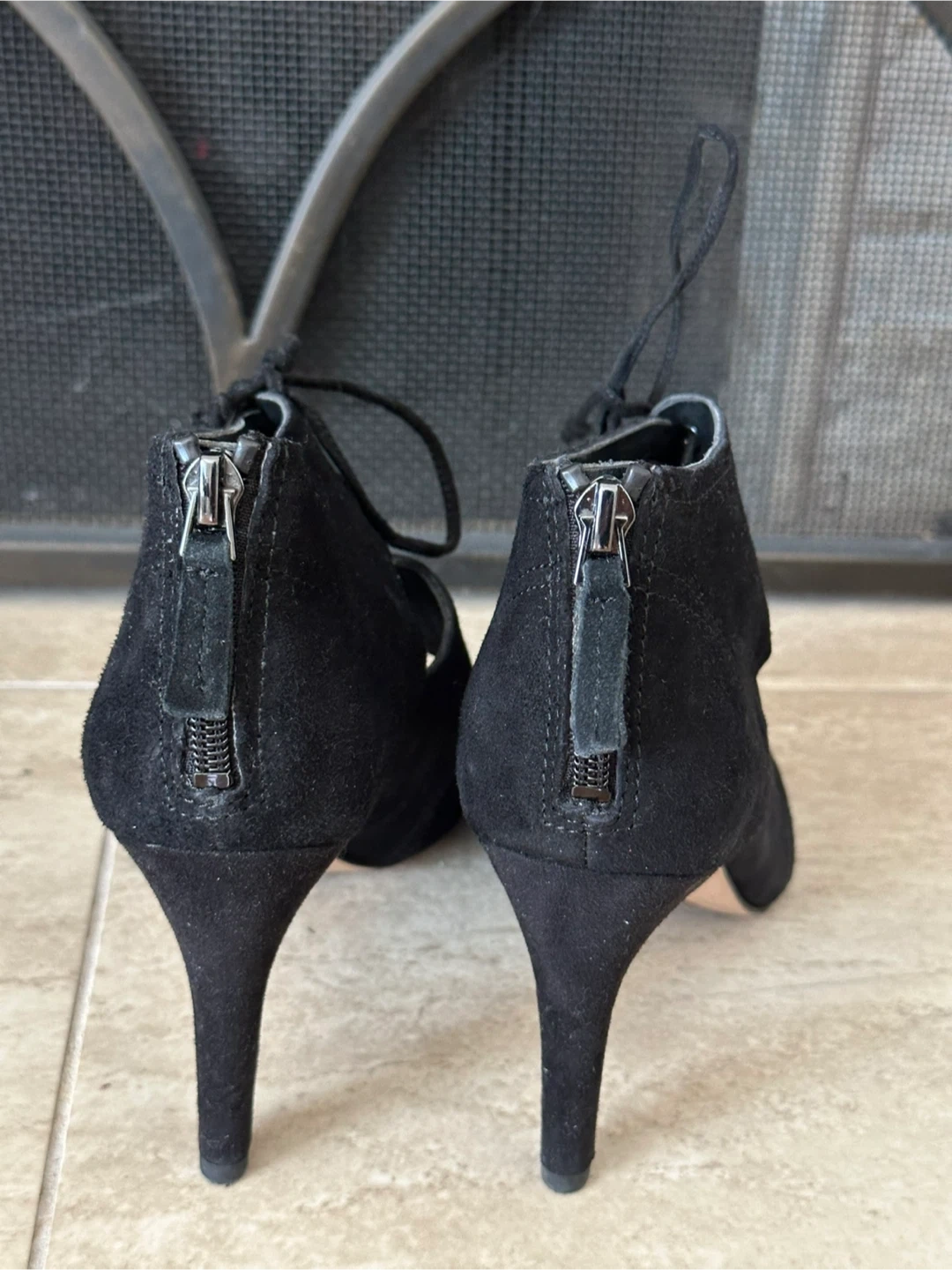 These black heels feature a suede material with lace-up detailing. They have a zipper closure at the back and an open toe design. 3 inch Heel height. Only used once