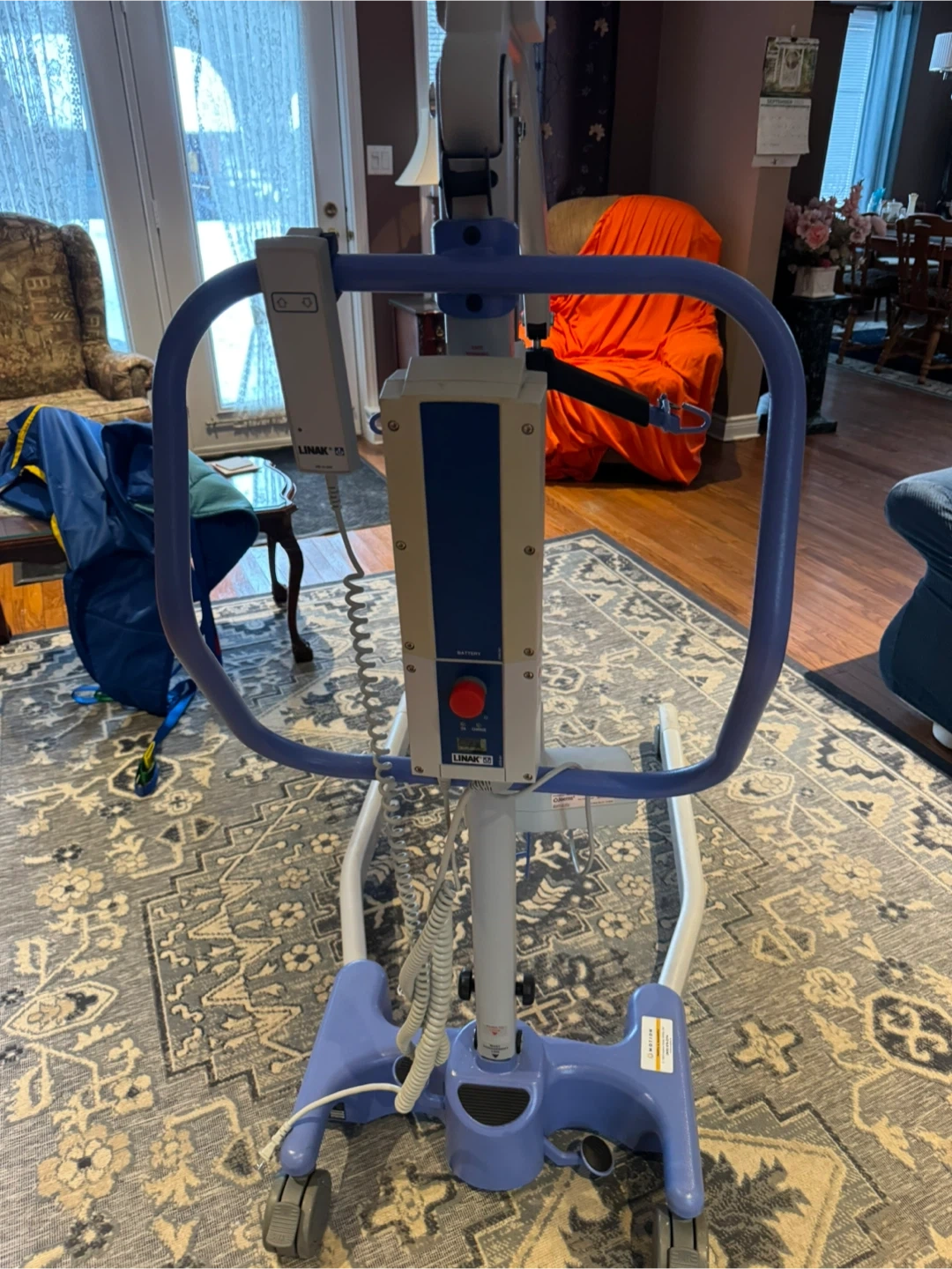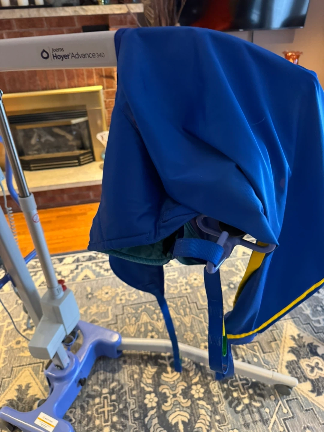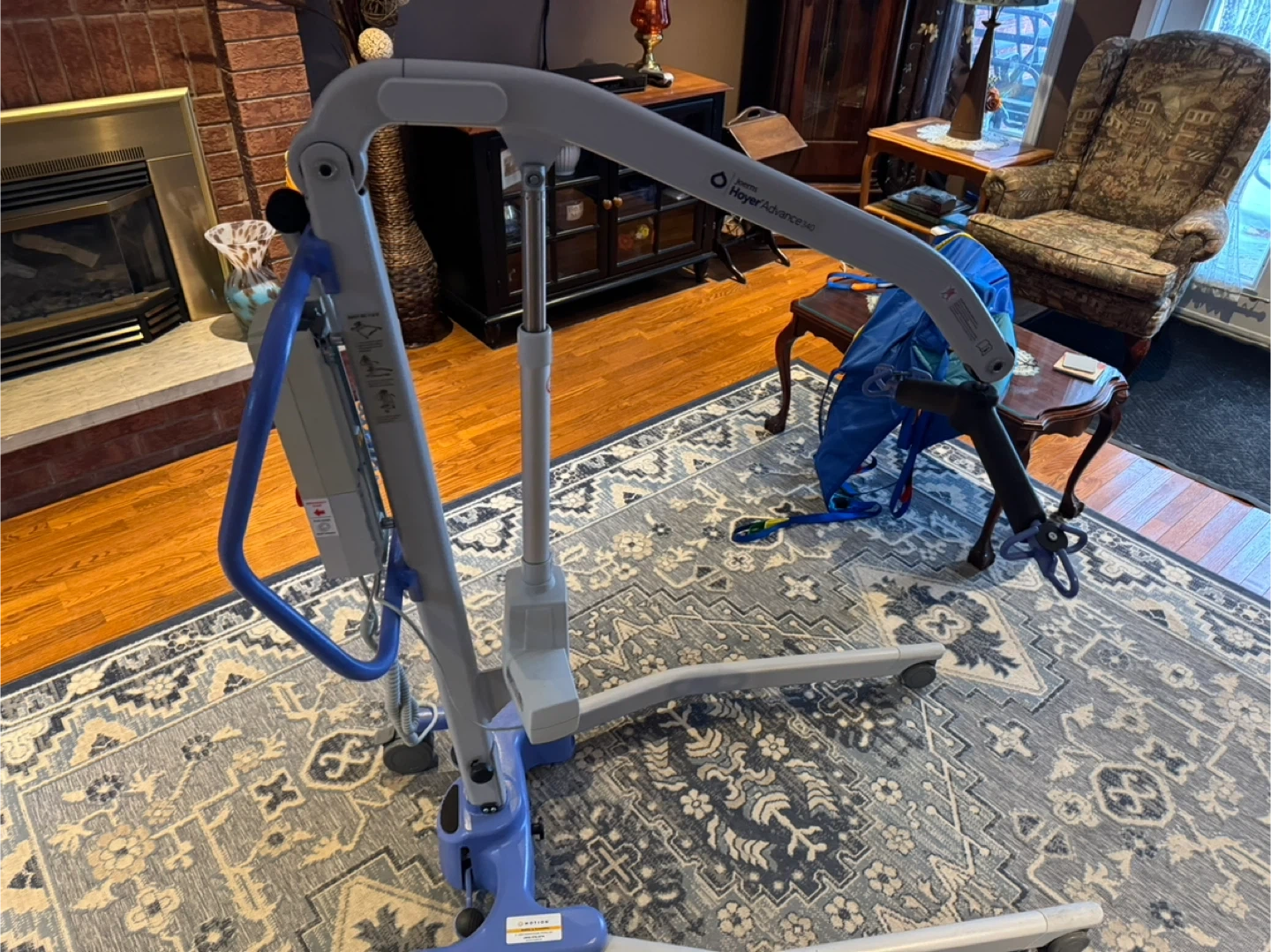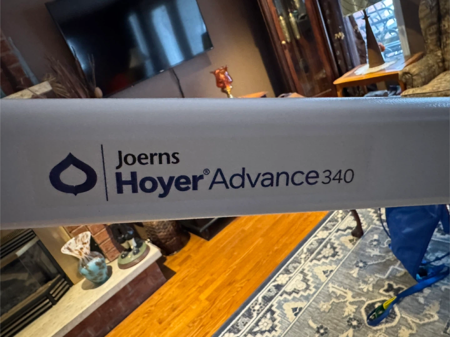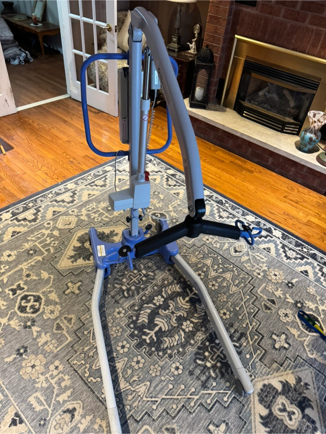 This is a Joerns Hoyer Advance 340 patient lift, designed for safe and comfortable transfers. It's a reliable lift that comes with a blue large sling and all necessary components. Great for home care or assisted living environments!