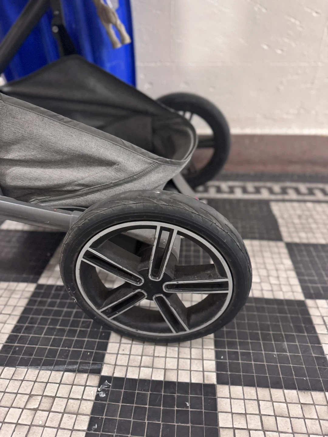 This is a Nuna stroller. It's gray with brown leatherette accents on the handle. Includes a cup holder.