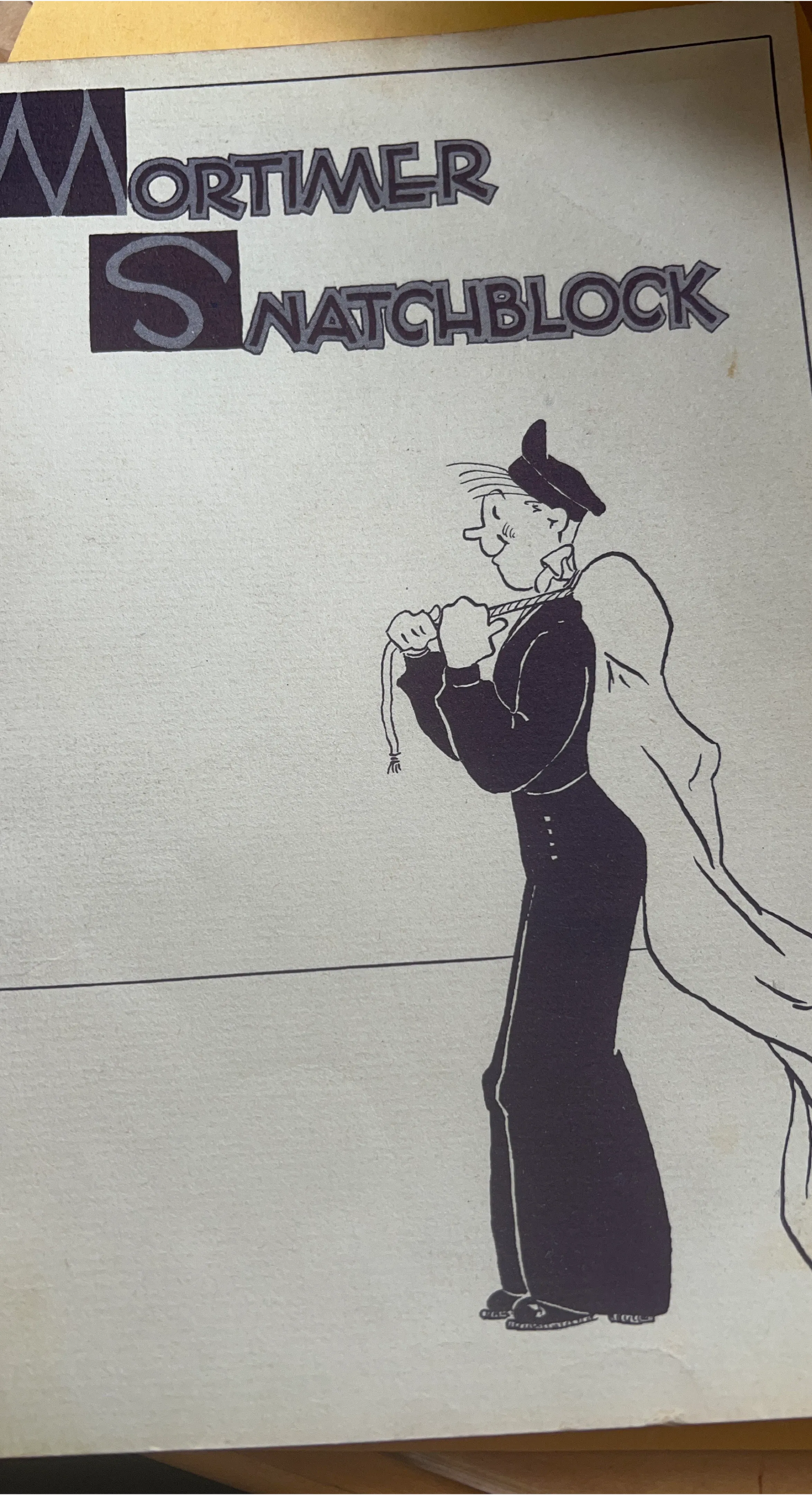 This is a print featuring Mortimer Snatchblock. The artwork depicts a character carrying a sack over his shoulder. It's a black and white illustration with a vintage style. This print would appeal to comic art collectors.