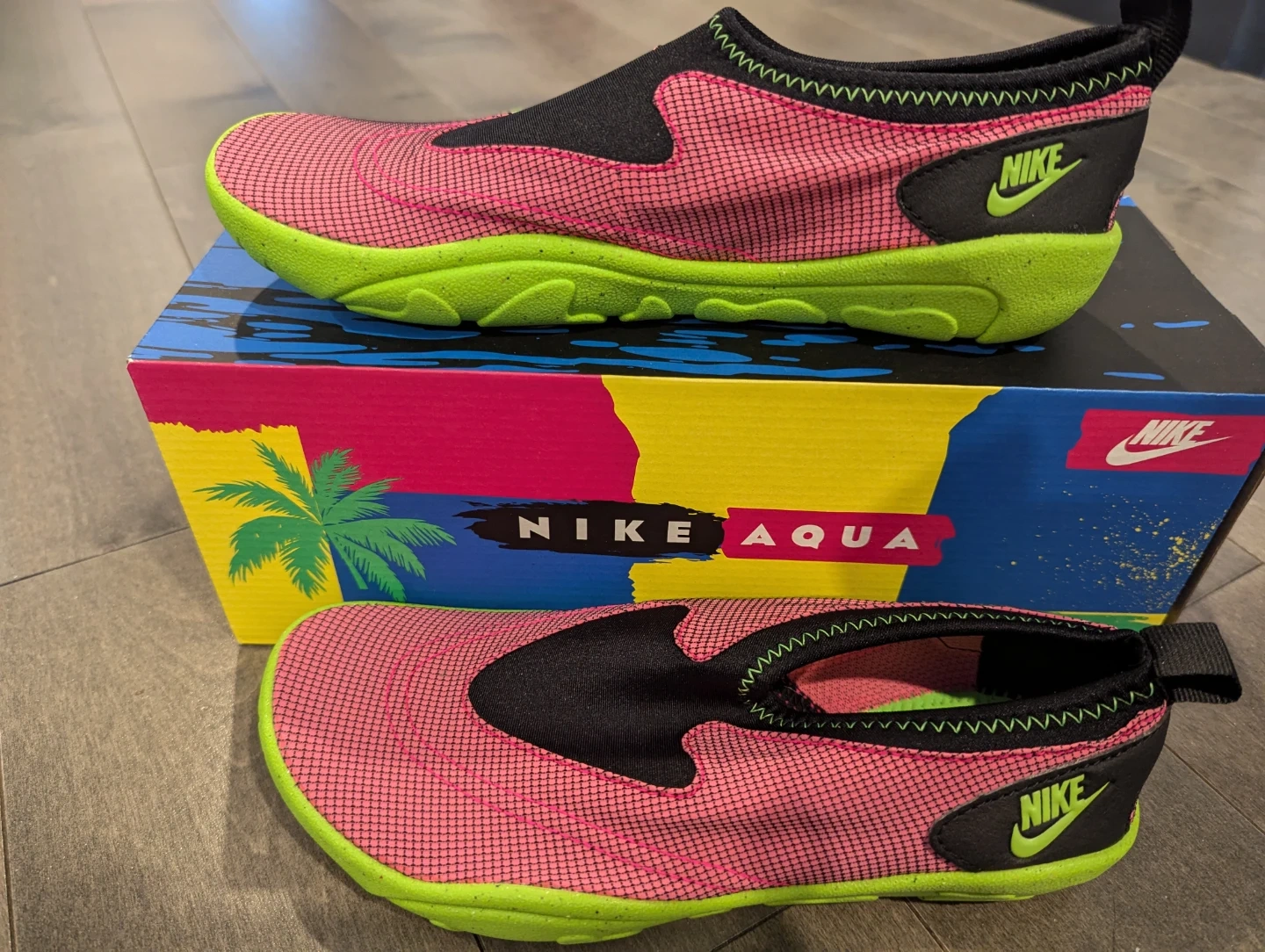 Brand New Nike Aqua Turf shoes in pink and electric green. These water-friendly shoes are designed for comfort and performance. Includes original box. Great for water sports and beach activities!