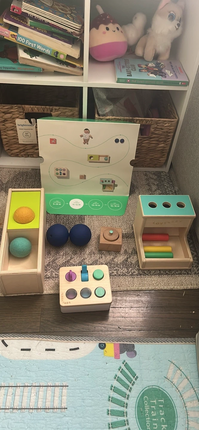 This set includes a variety of Lovevery wooden play items. Features includes a drop box, a pound and play ramp, and sorting toys. Recommended for ages 9-18 months. It js missing the doll and book