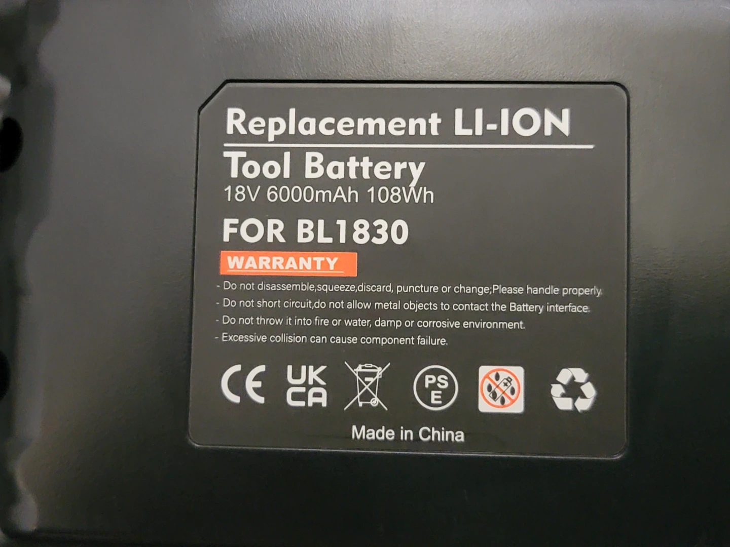 Aftermarket Makita 18V 6.0Ah 108Wh Li-Ion tool battery for BL1830. Works great and is in like new condition. Nice upgraded size 6000 mah.