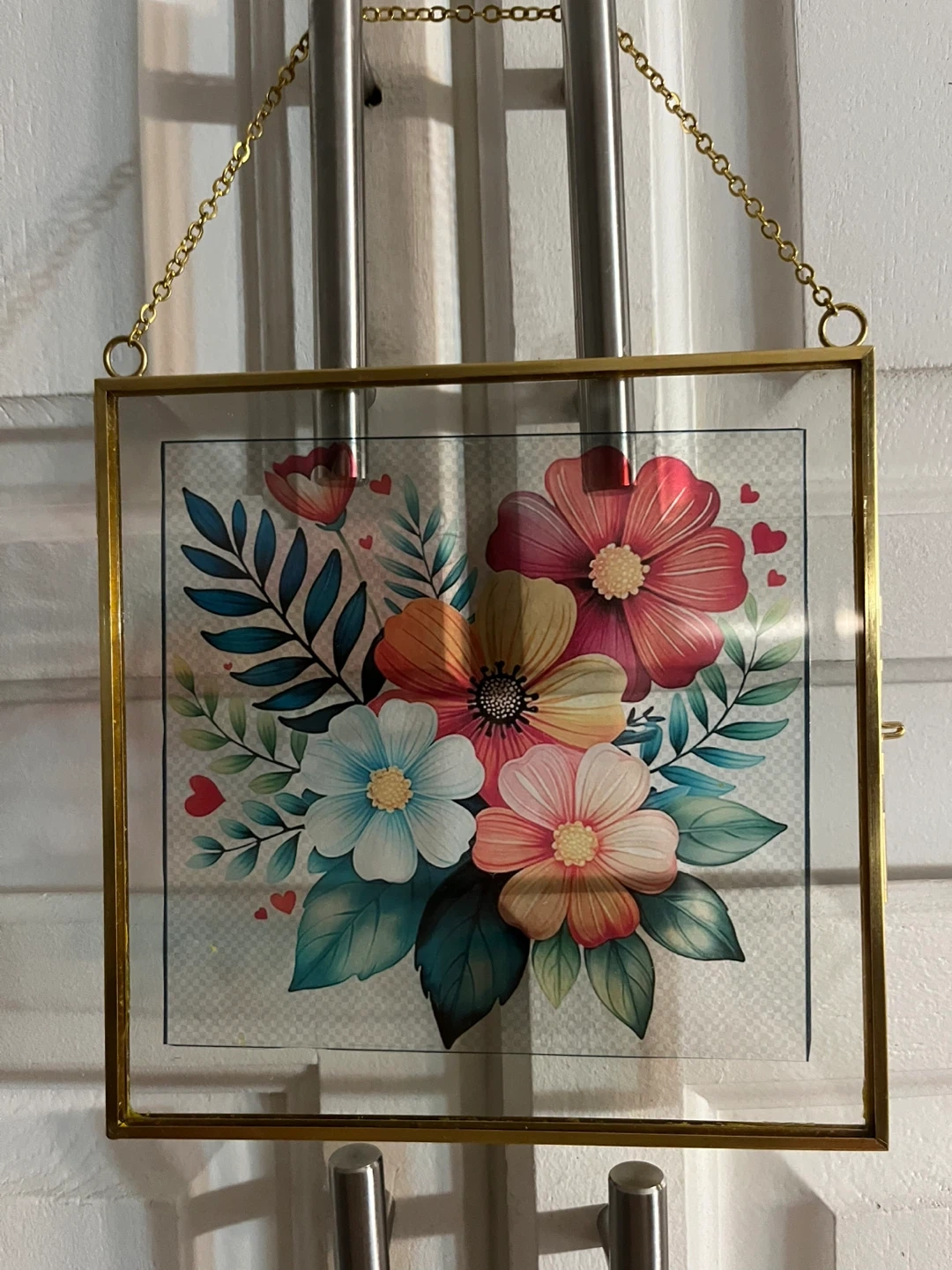 This decorative frame features a vibrant floral print behind glass. It's encased in a gold-tone metal frame with a hanging chain. Great for adding a pop of color to any room!