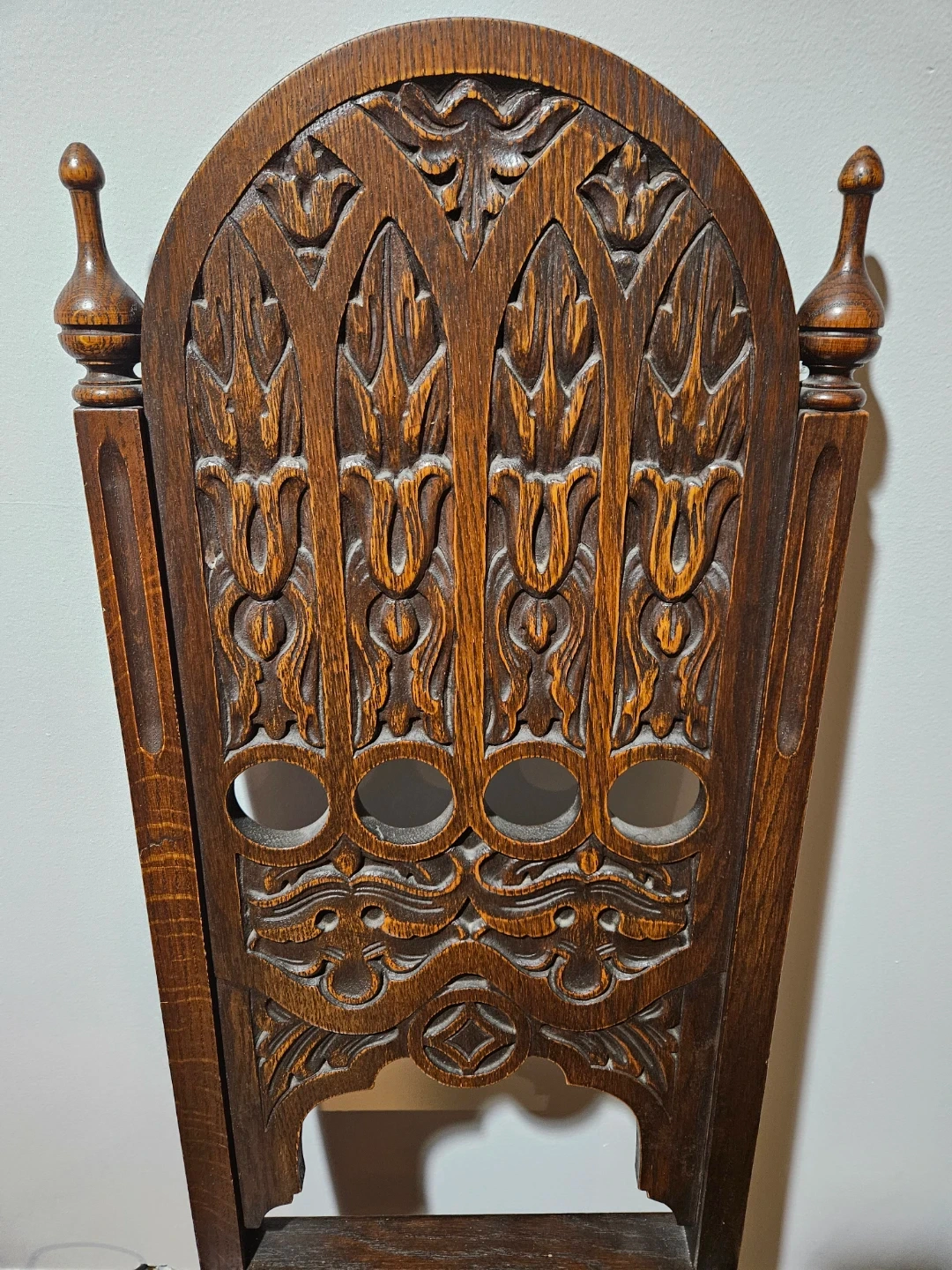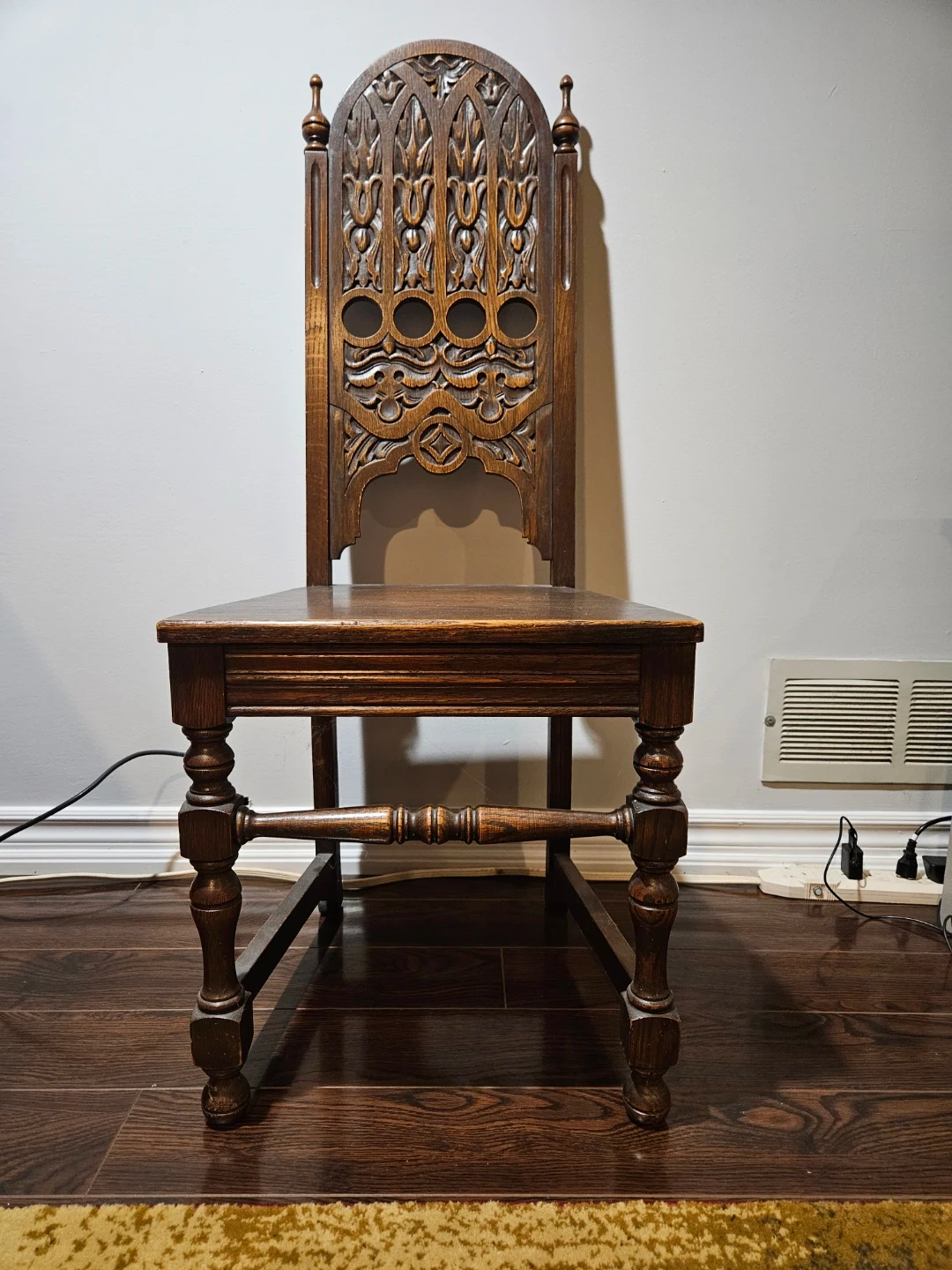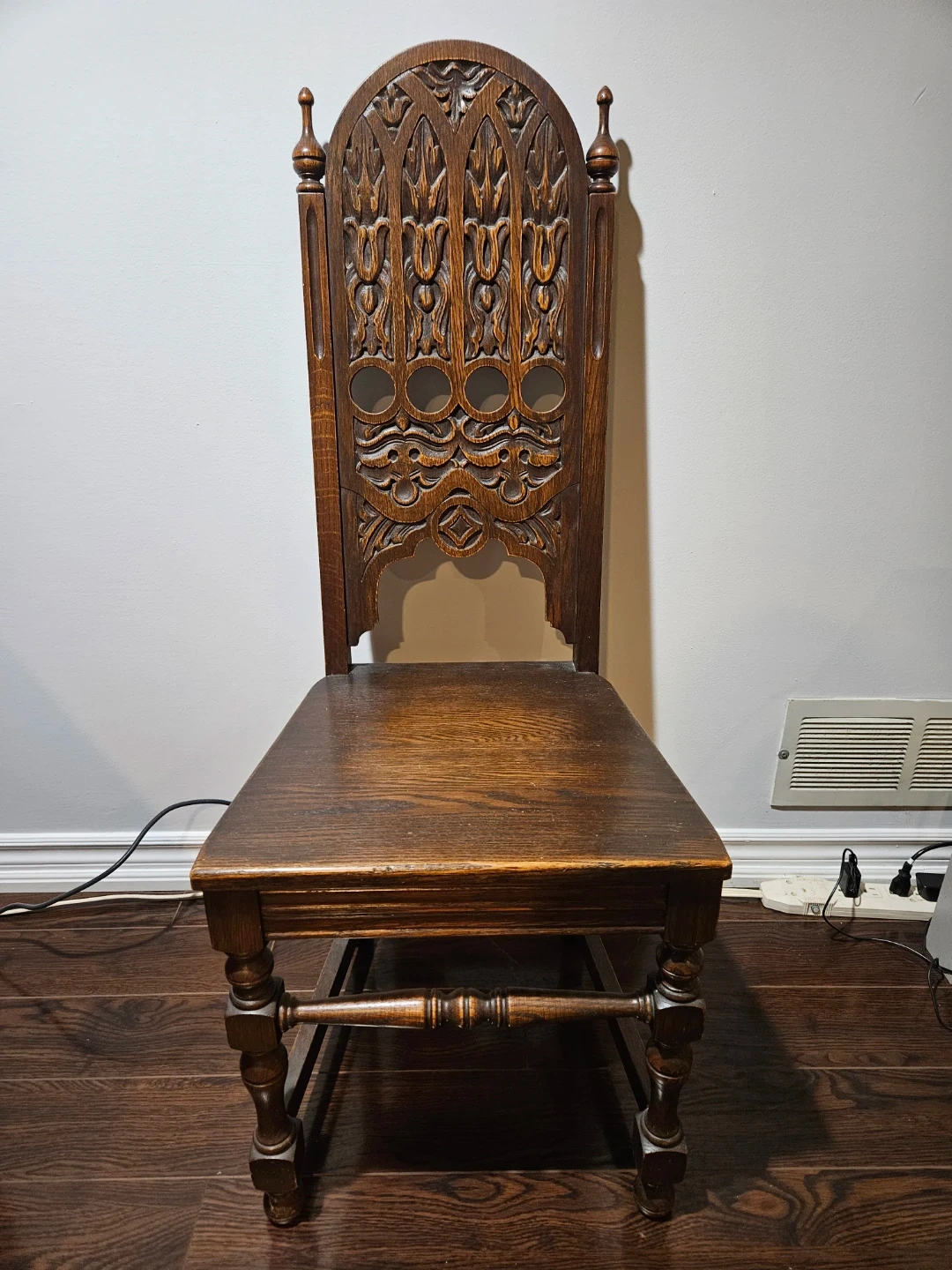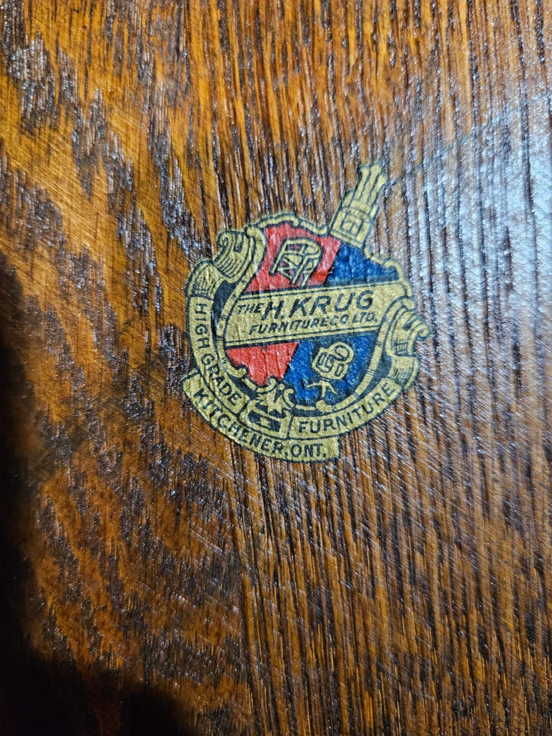 This is a beautiful vintage oak dining chair from The H. Krug Furniture Co., a high-grade furniture maker in Kitchener, Ontario. It features intricate carvings on the backrest and sturdy turned legs with a support stretcher. This chair is crafted from solid oak wood.