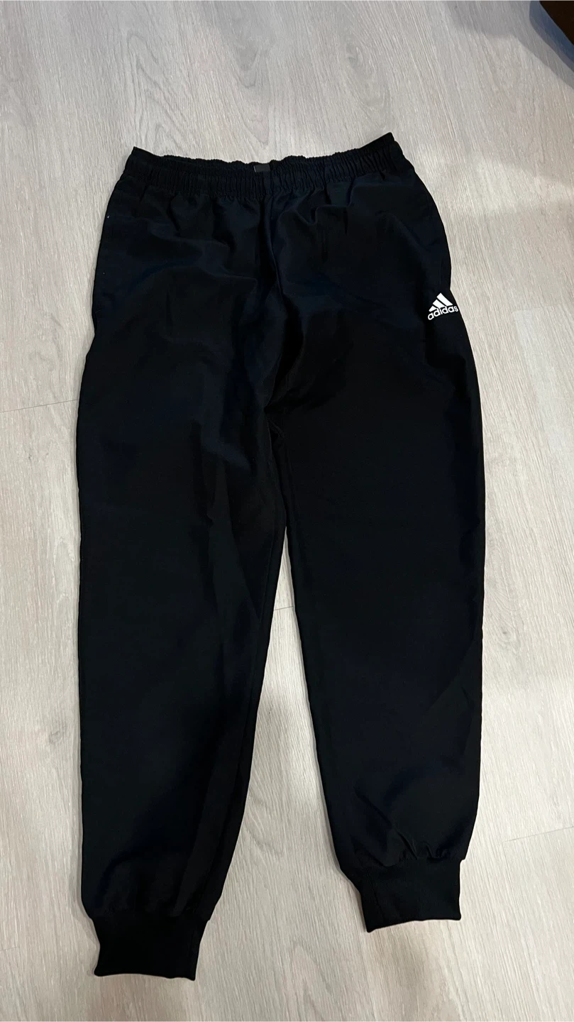 These are black Adidas joggers with an elastic waistband and cuffed ankles. They're made of a lightweight material. These joggers are good for casual wear or light workouts.