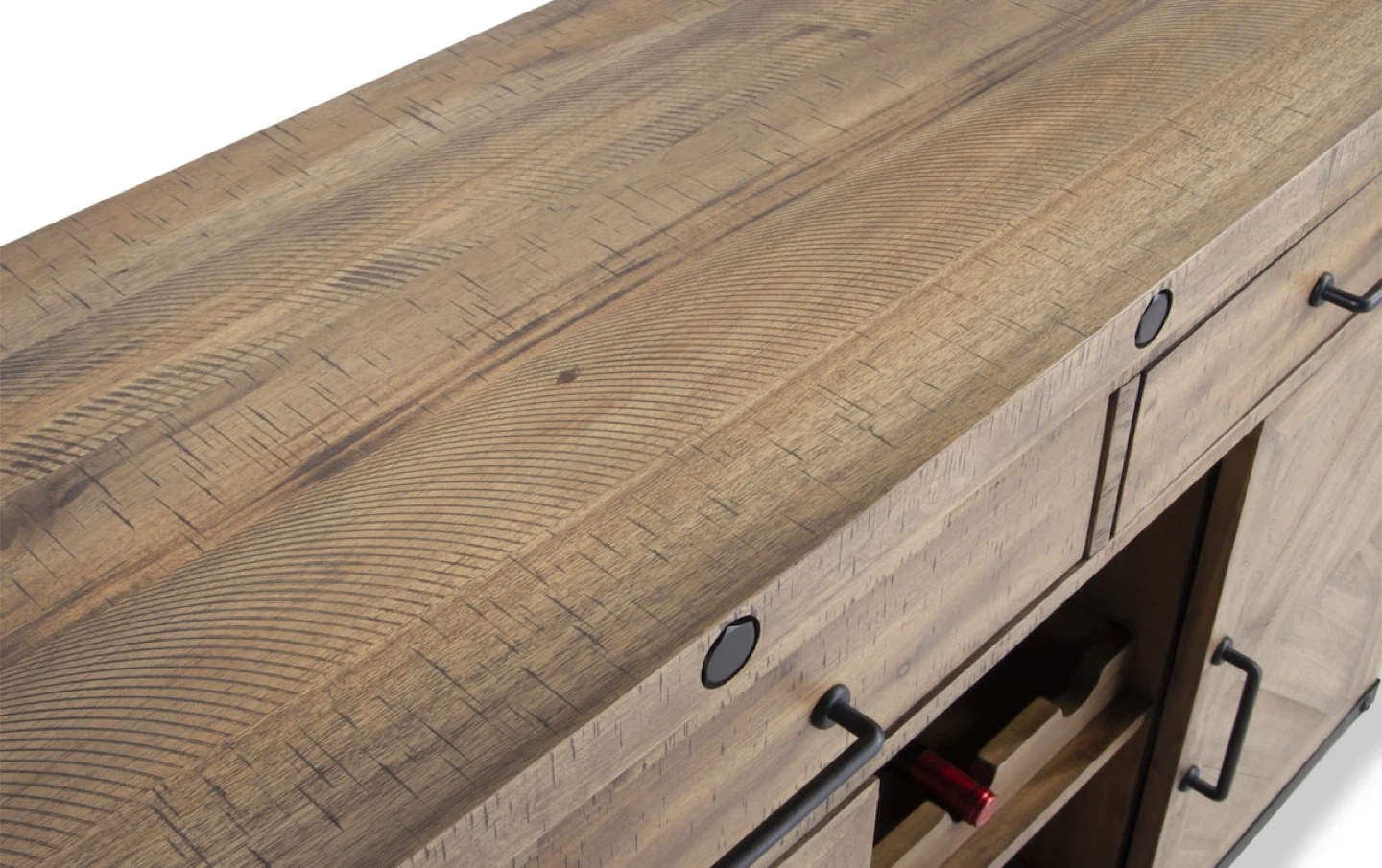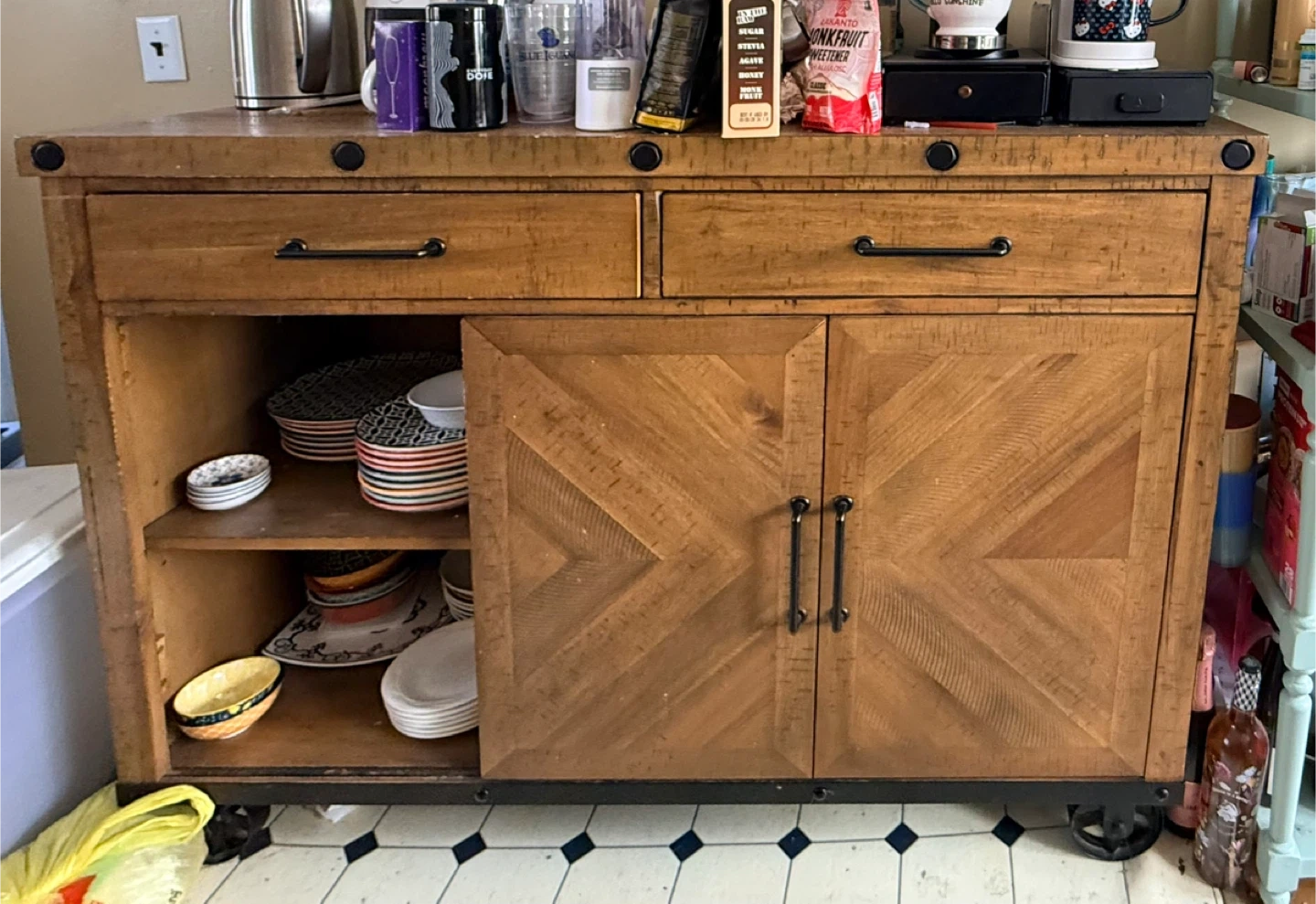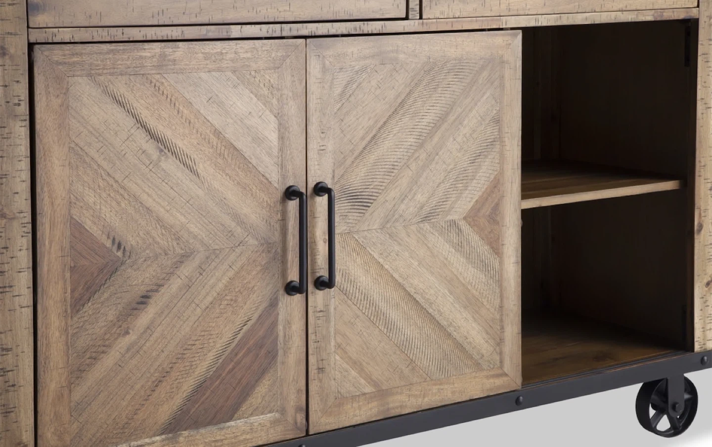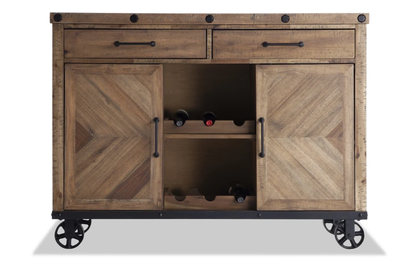 Rustic wood bar cabinet on wheels. Features two doors with chevron design, two drawers, and open shelving for wine bottles and storage. Its sturdy construction and versatile design make it a functional addition to any space.