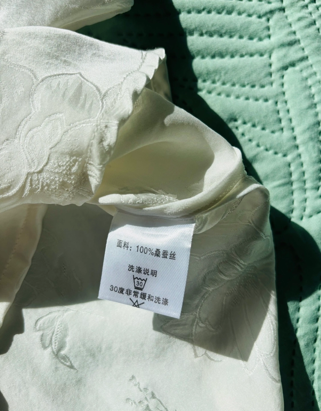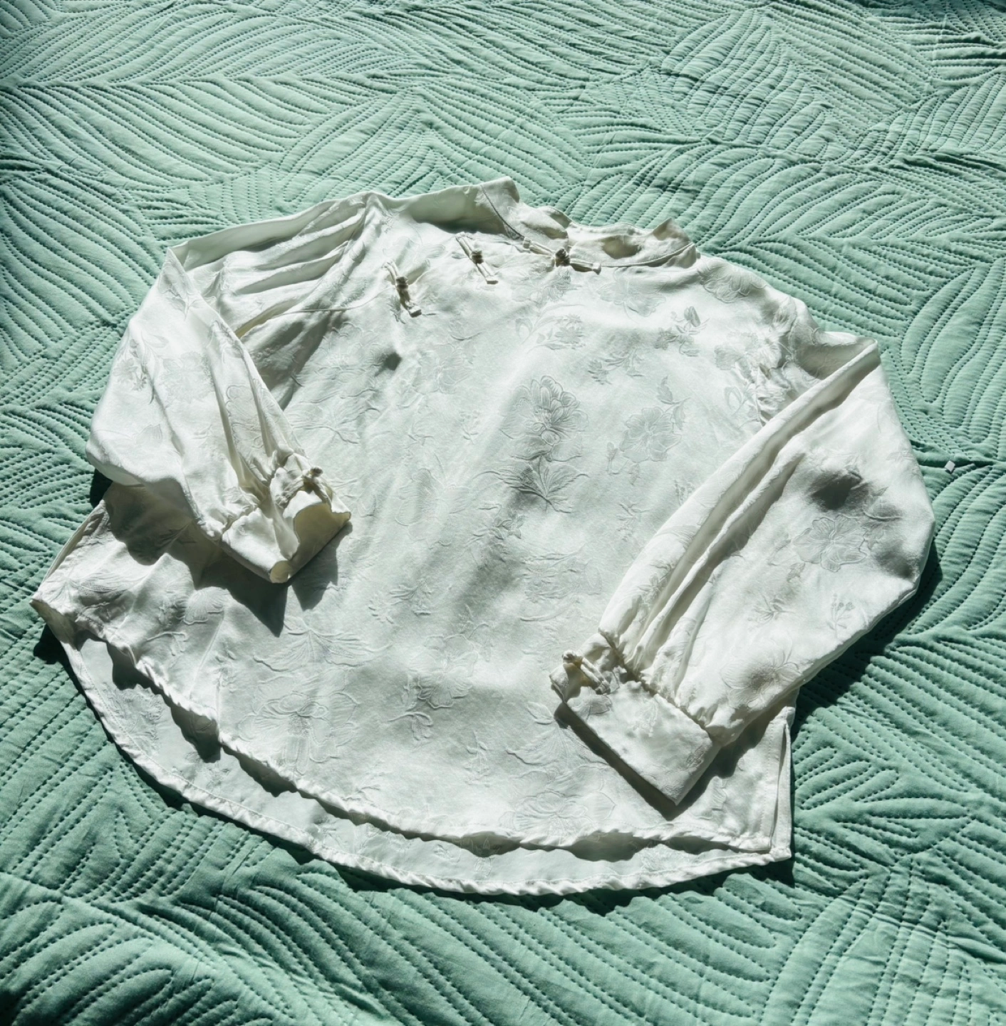 Beautiful pearl tone silk blouse. Features a mandarin collar, long sleeves, and delicate floral jacquard. 100% silk. Never wore it , welcome to come and try!😊💝🤝