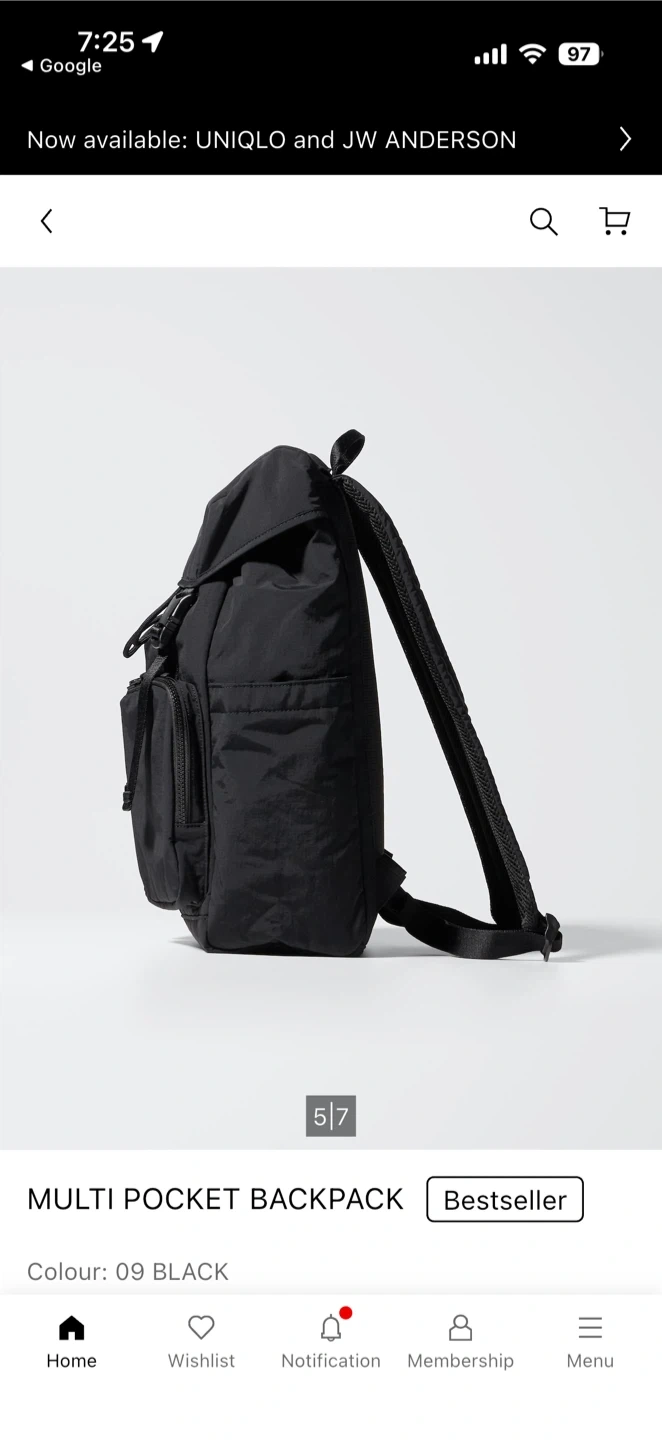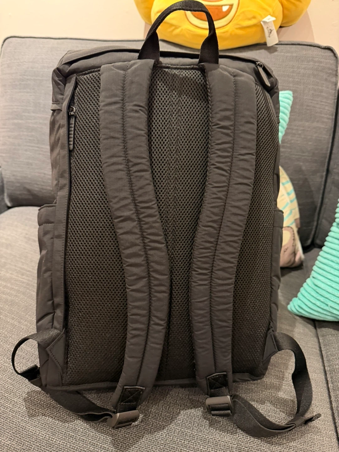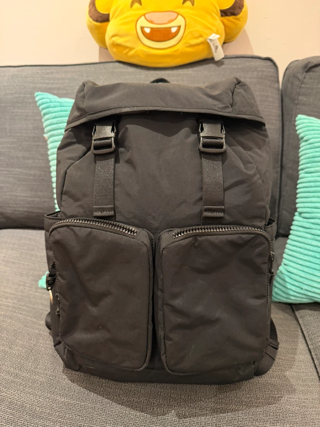 Uniglo Black backpack with mesh back panel and padded straps. It features a flap closure with buckles and multiple zippered pockets. Only used for a couple of weeks.