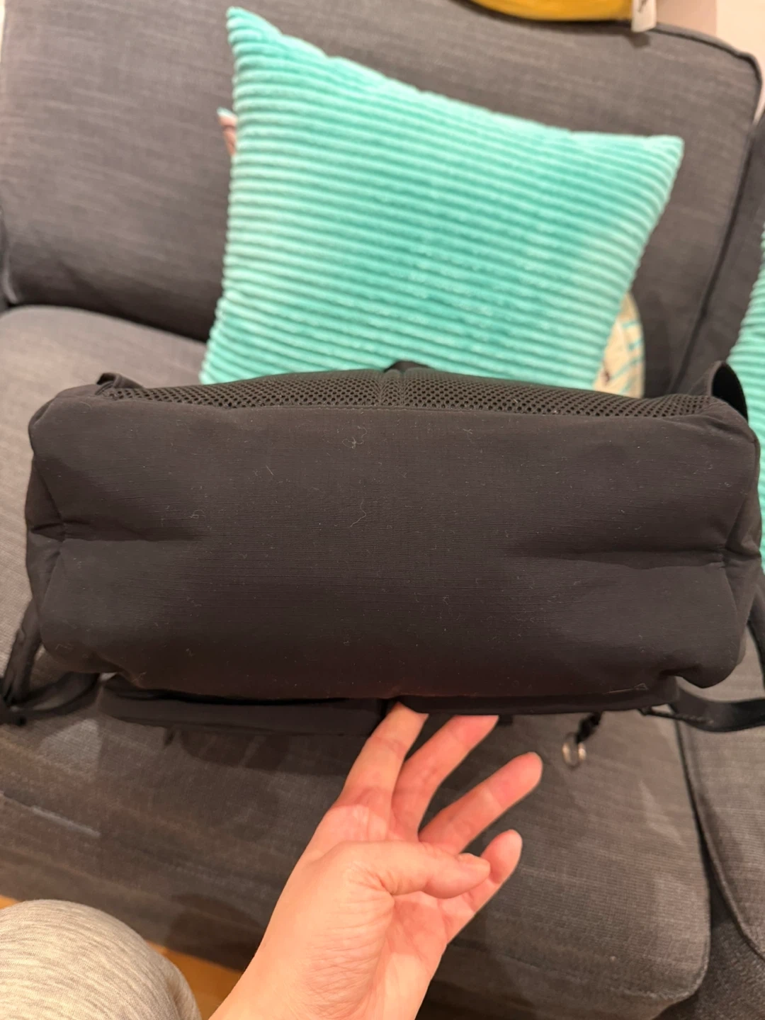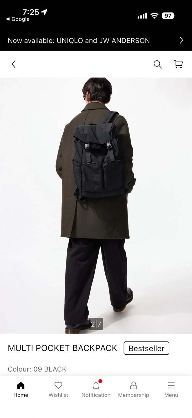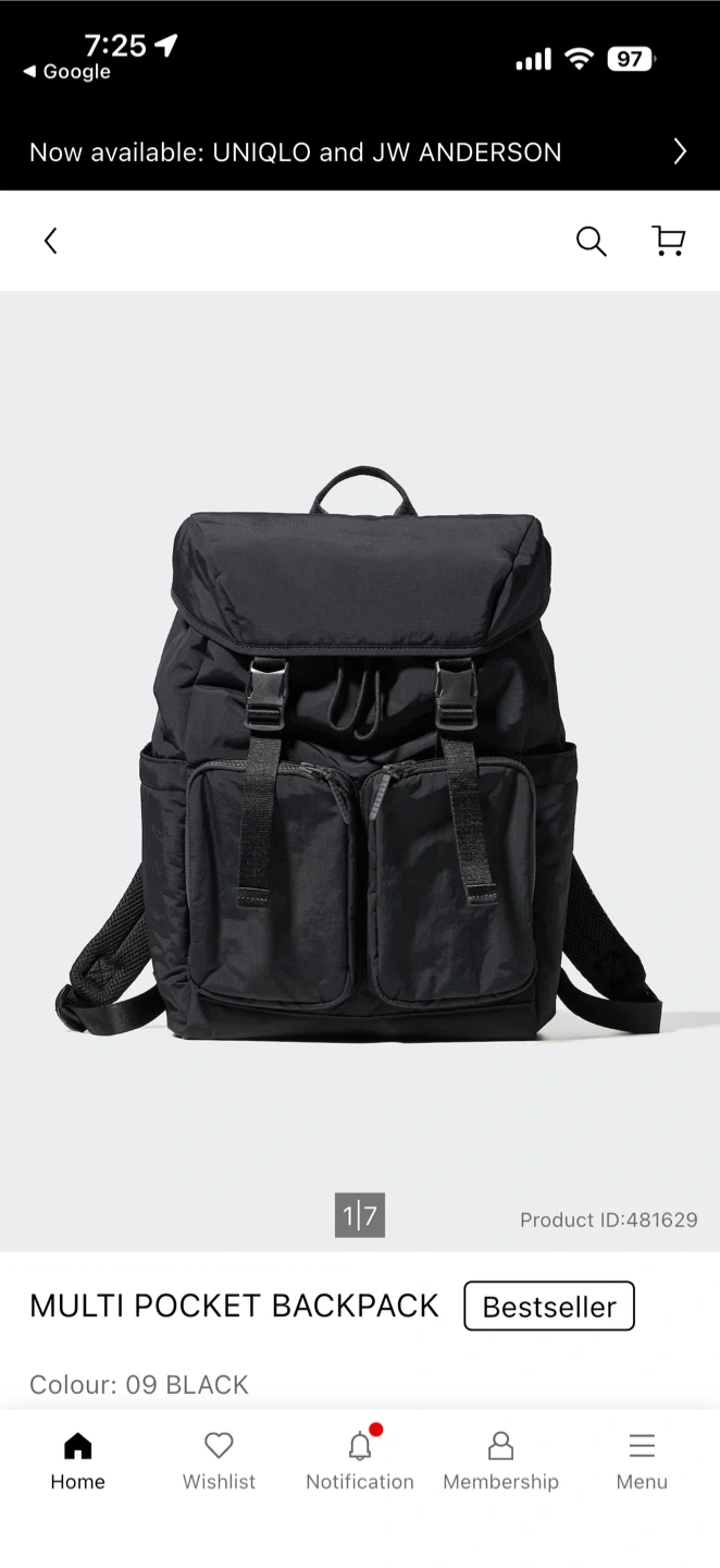 Uniglo Black backpack with mesh back panel and padded straps. It features a flap closure with buckles and multiple zippered pockets. Only used for a couple of weeks.