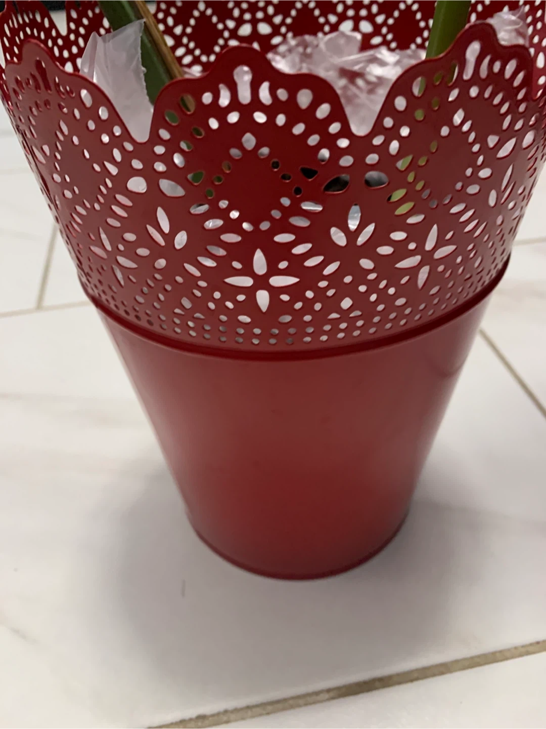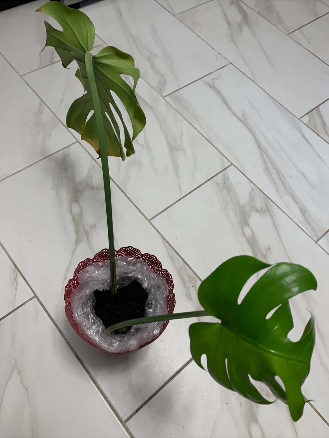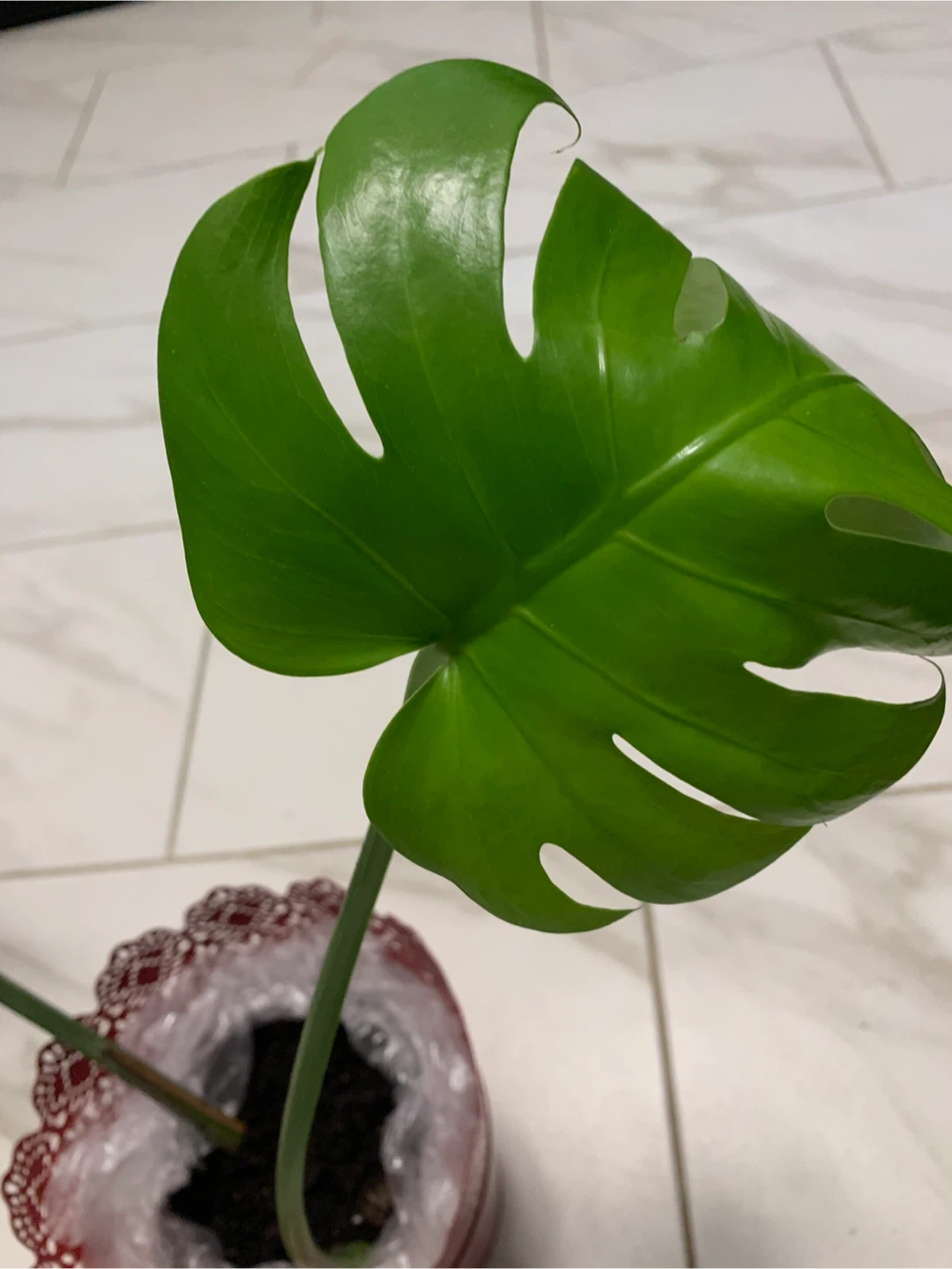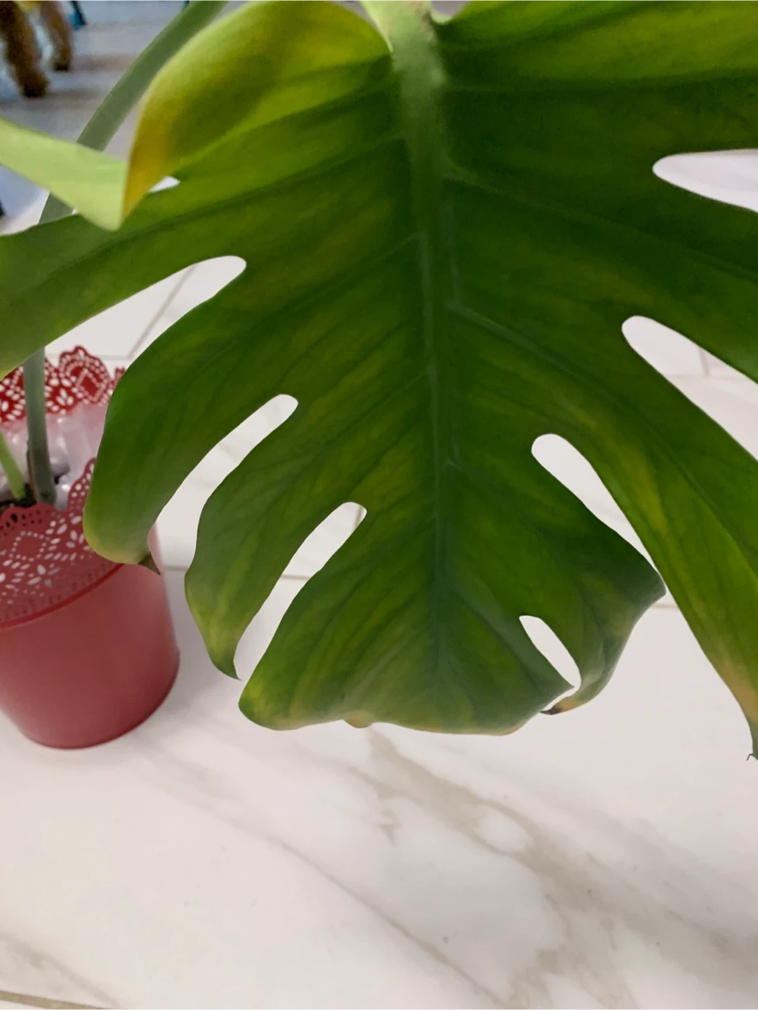This is a Monstera deliciosa plant. It's in a decorative red pot. Ready to add some tropical vibes to your space!