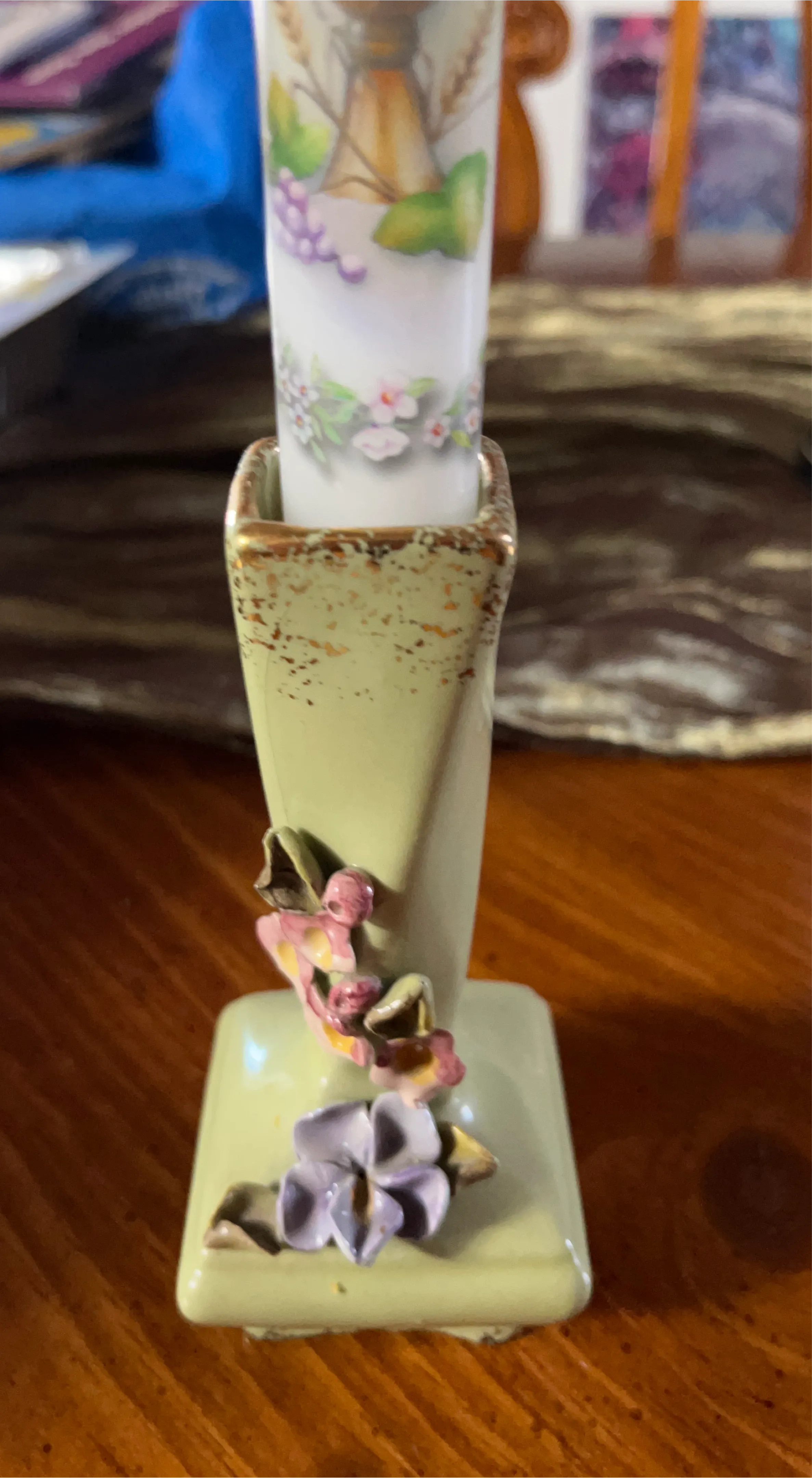 This is a lovely vintage ceramic bud vase. It's a pale green color with gold trim accents. The vase features delicate floral appliques and a painted design of grapes and wheat stalks near the top. It's a charming piece for a small floral display!