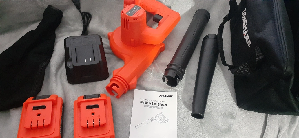 Lightweight and powerful Mini cordless leaf blower. Includes two batteries, charger, hose, small vacuum debris sack and carrying bag. Great for quick cleanups. Instructions included