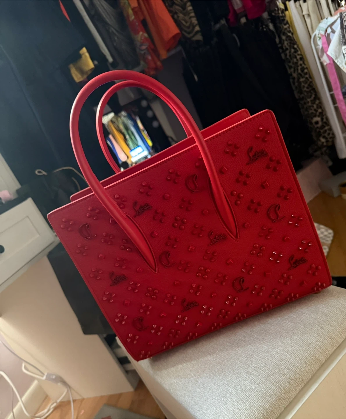 This is a Christian Louboutin red tote bag with signature spikes and logos. It's a structured design with top handles. Red leather interior.