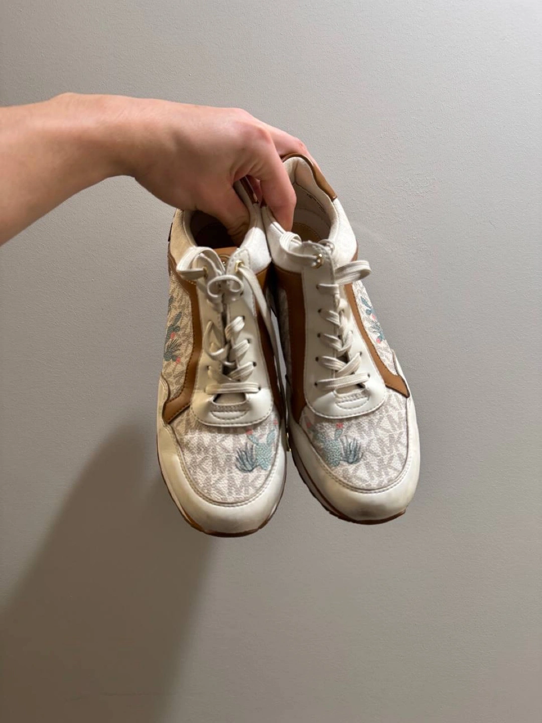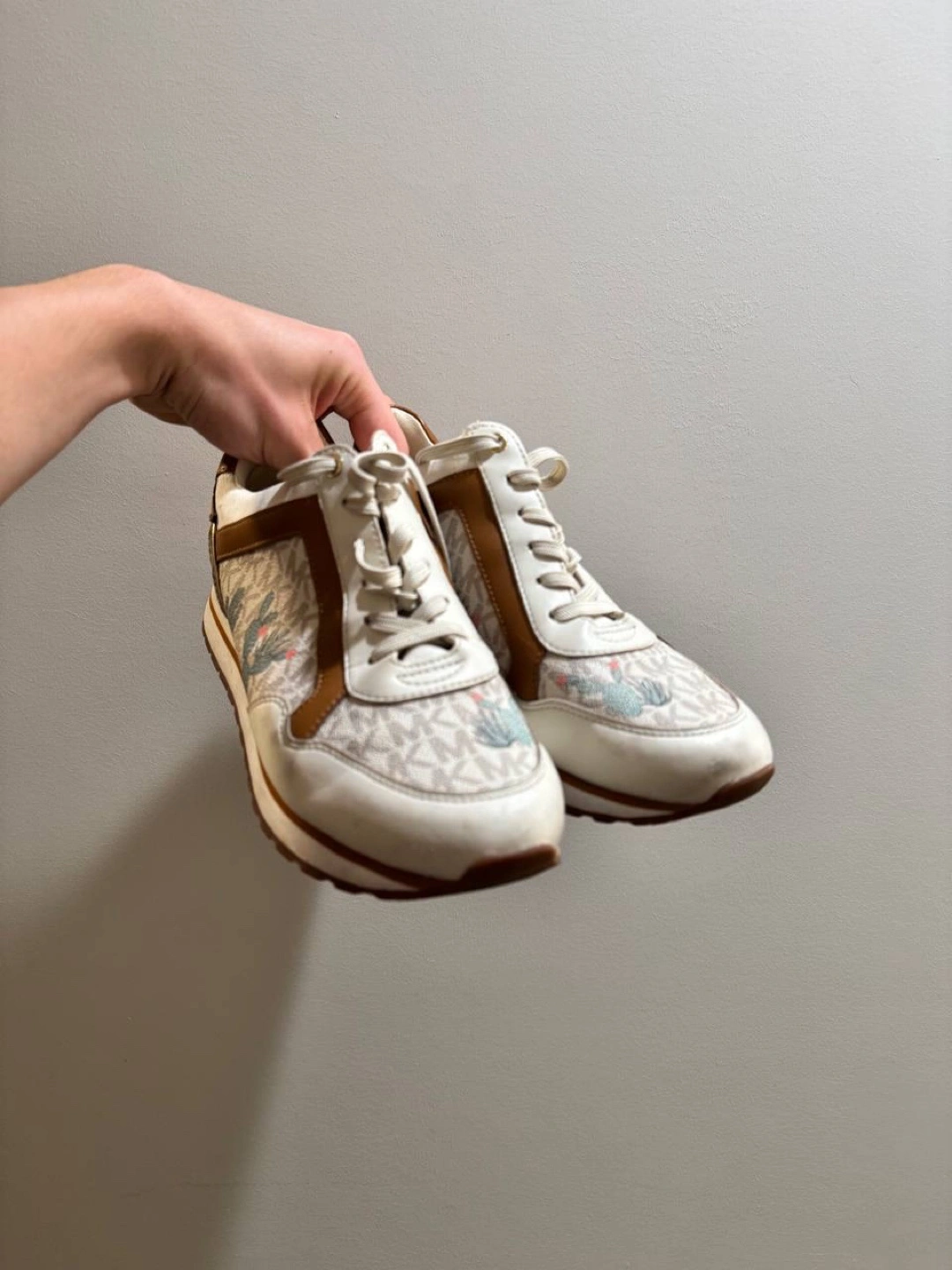 Selling a pair of Michael Kors women's / man’s sneakers. They're white with brown accents and feature a cute cactus design. They have some signs of wear but are still in good condition and ready for a new home!