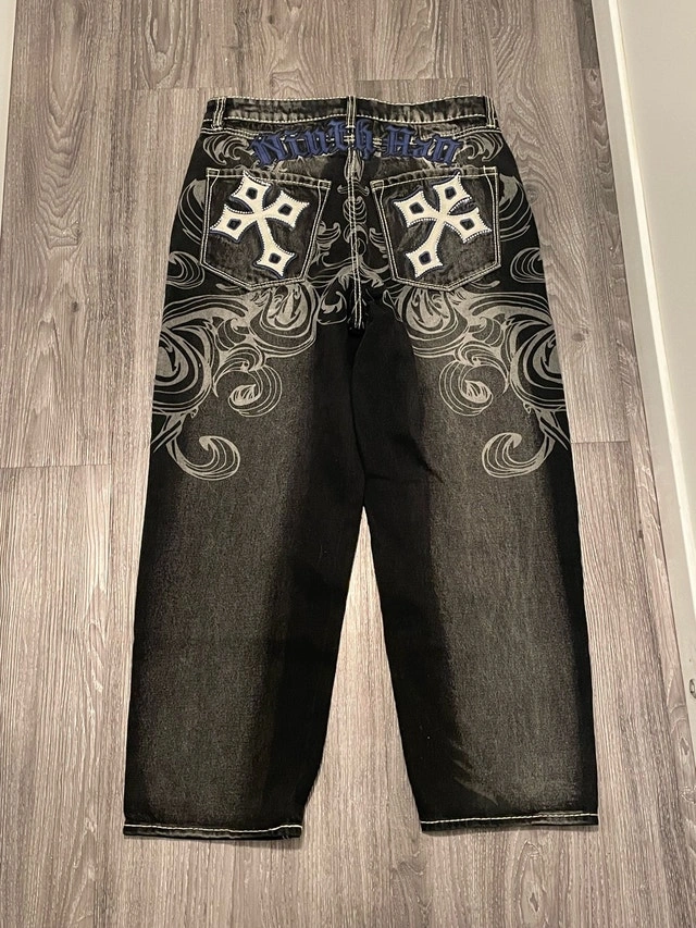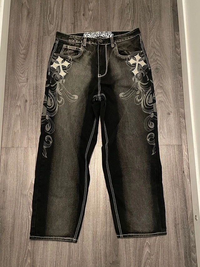 Bringing a designer vibe with religious undertones, the Ambush Royal Cross jeans are offered in a black denim build with a faded wash treatment and a roomy, loose fit. Outlined by bold white contrast stitching, the stylish pants feature embroidered Crosses near each pocket framed by shimmering rhinestones for a blessed, flashy look. With bold Old English branding embroidered across the seat, the durable jeans employ five pockets and a button fly for a classic design. y2k . goth . affliction . alternative . Condition: New. For Sale By: Owner.