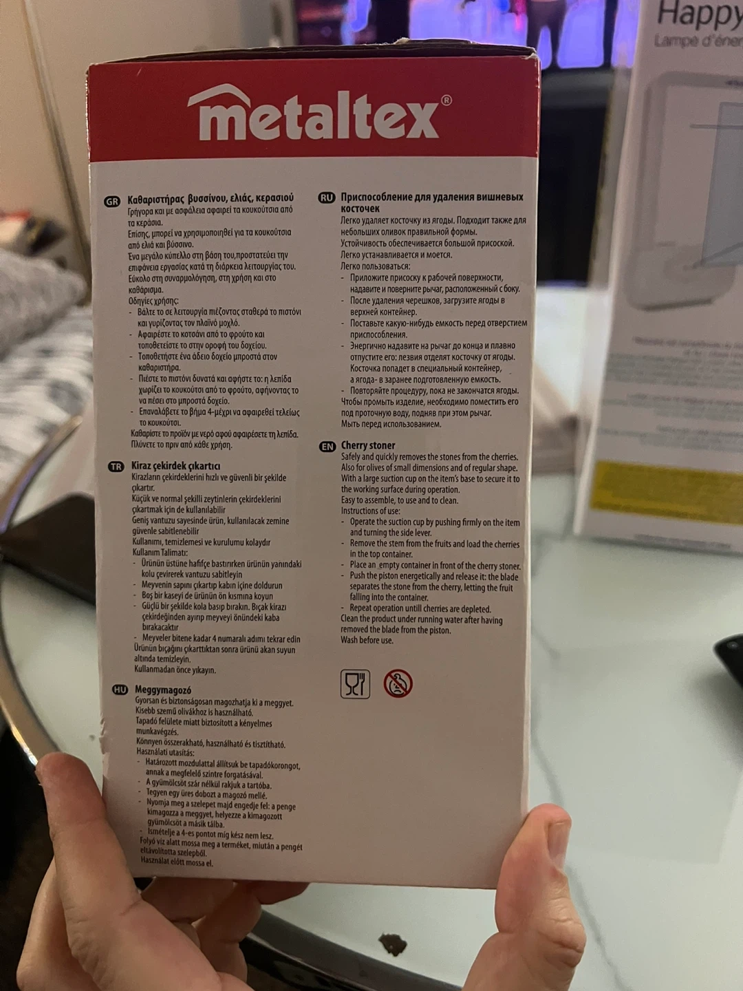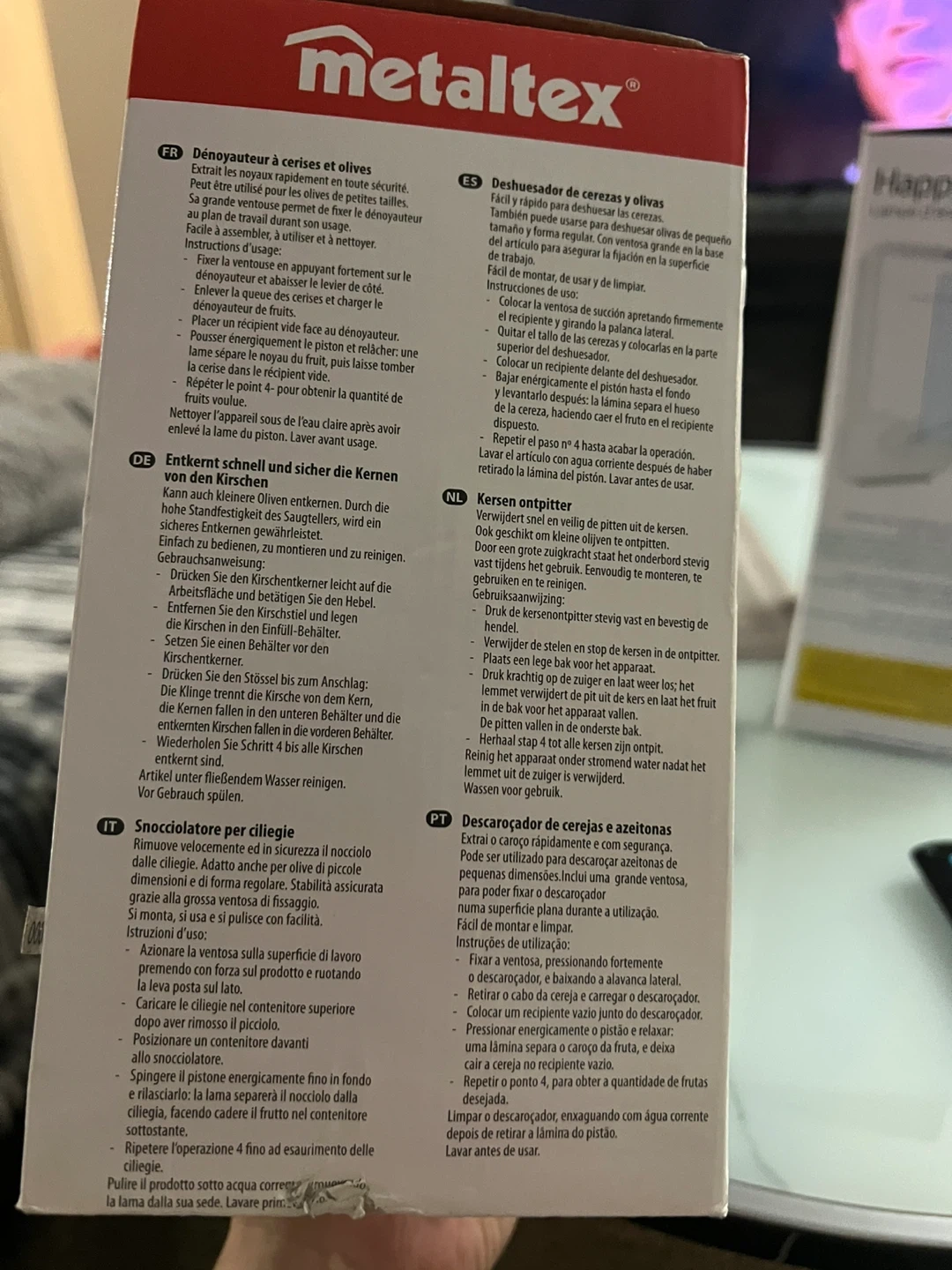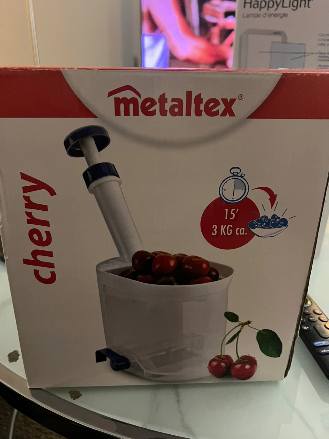 This is a Metaltex cherry pitter. It's designed for quick and easy pitting of cherries. Works with a large suction cup base for stability.