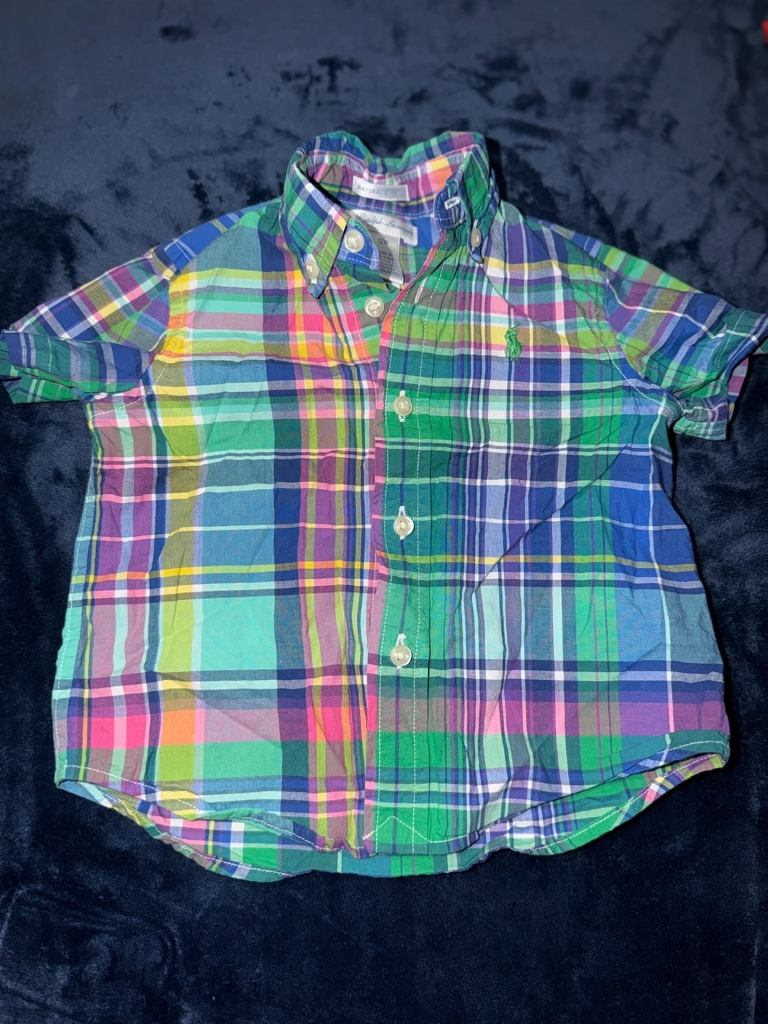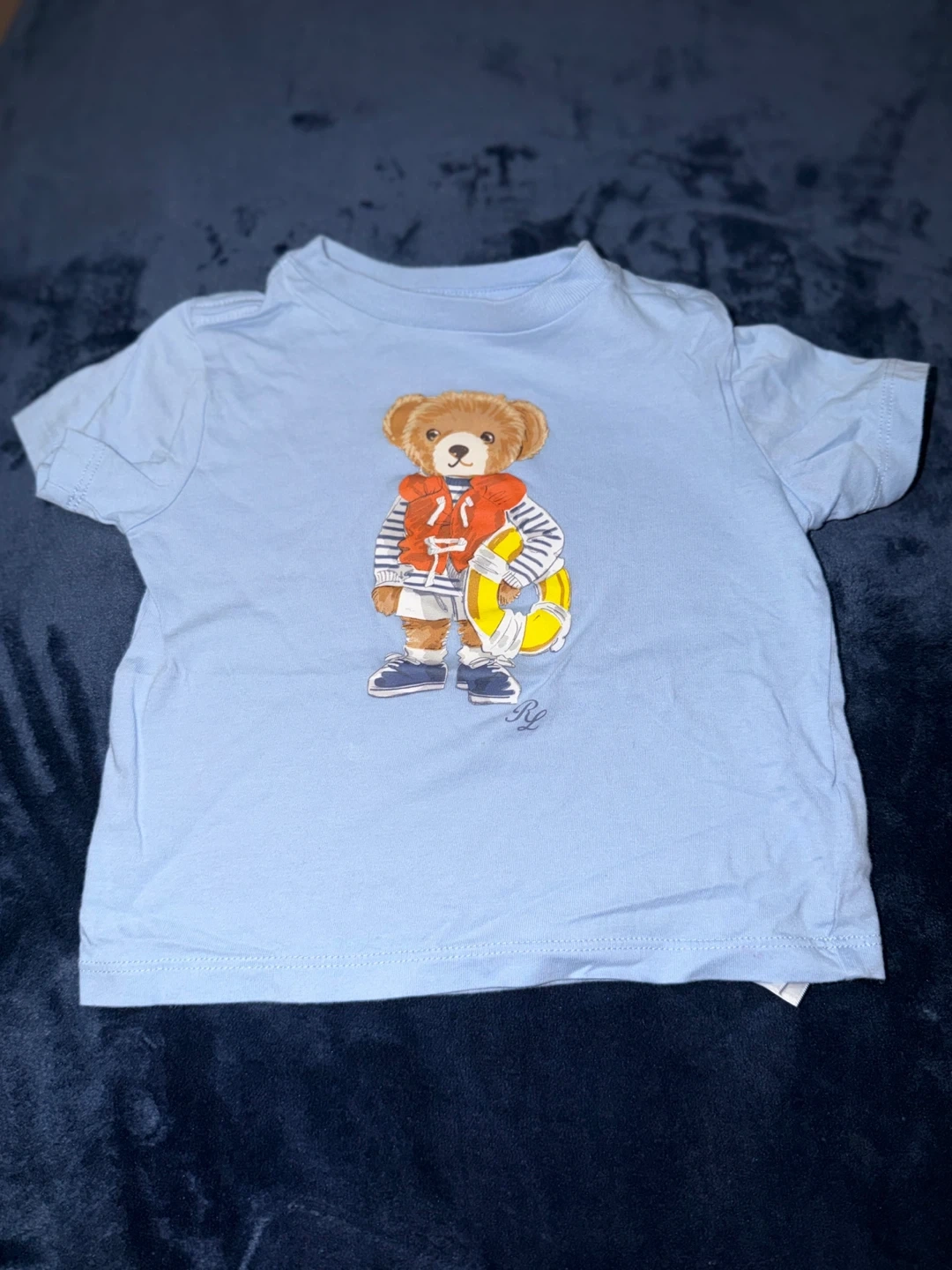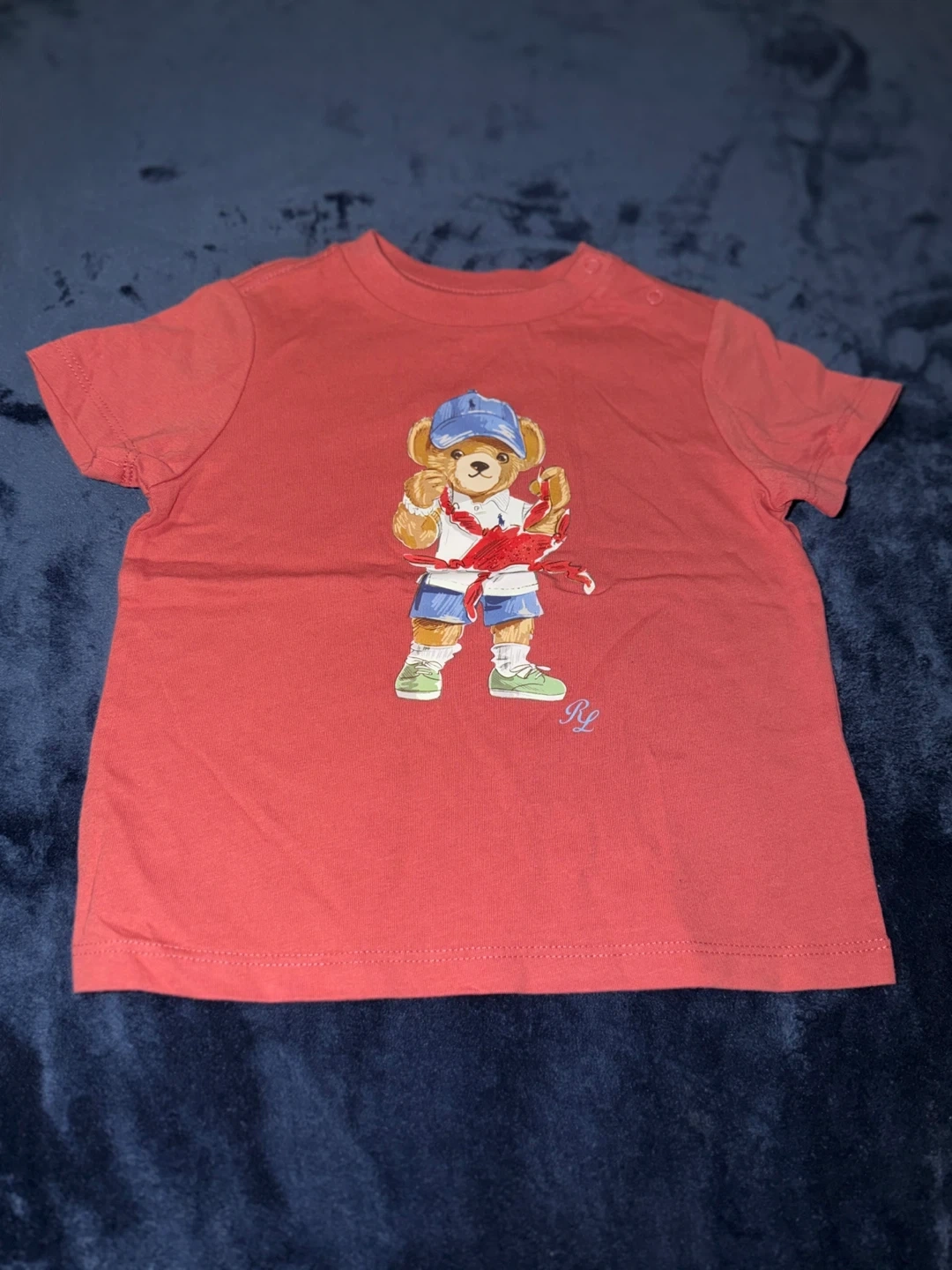 Bundle includes a blue Ralph Lauren t-shirt with a polo bear graphic, a white polo shirt with the iconic polo player logo, a coral t-shirt with a polo bear graphic, a multicolor plaid button-down shirt, and light blue swim trunks. All are size 9-12 months