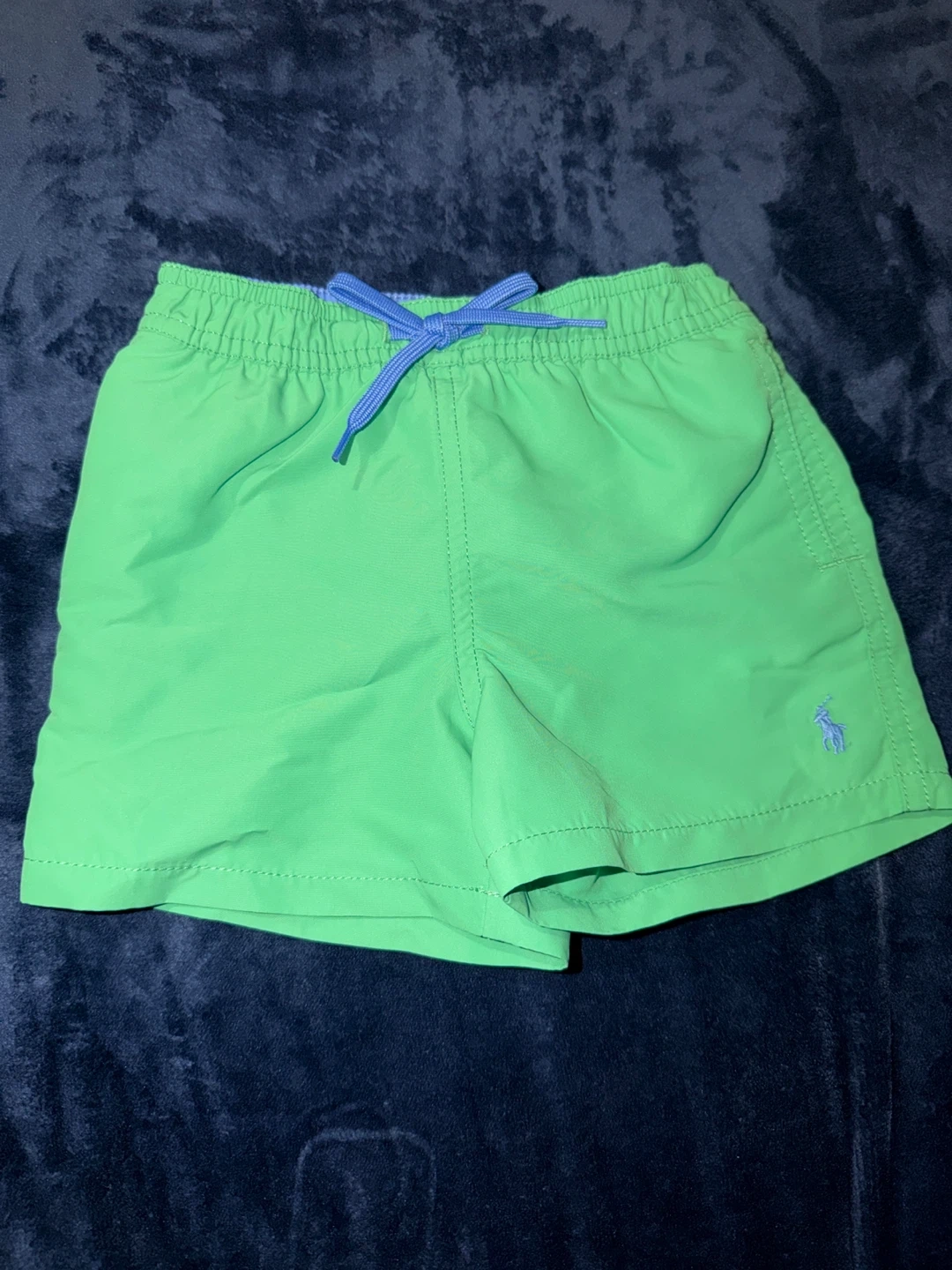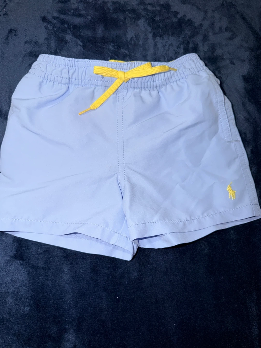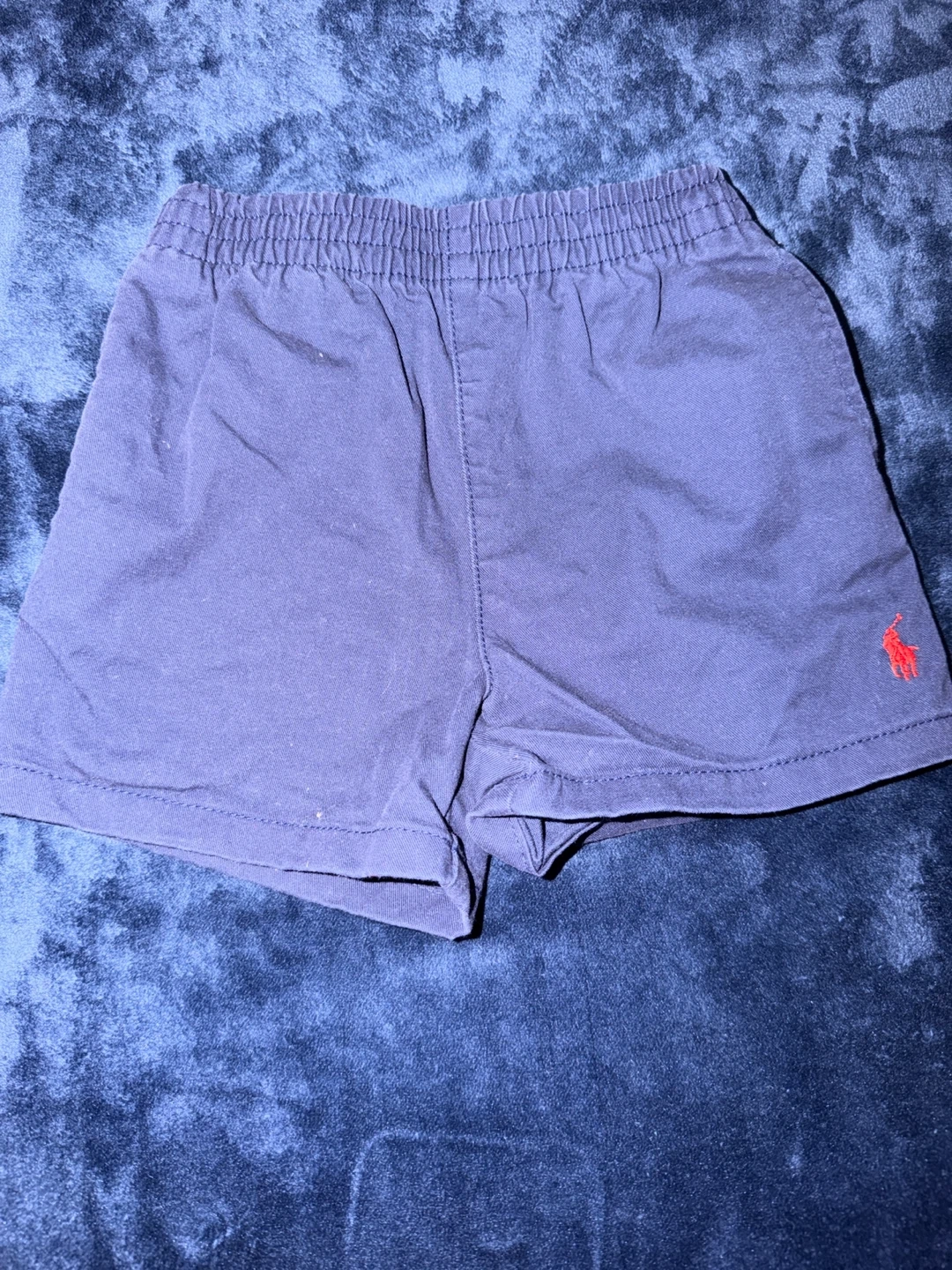 Bundle includes a blue Ralph Lauren t-shirt with a polo bear graphic, a white polo shirt with the iconic polo player logo, a coral t-shirt with a polo bear graphic, a multicolor plaid button-down shirt, and light blue swim trunks. All are size 9-12 months