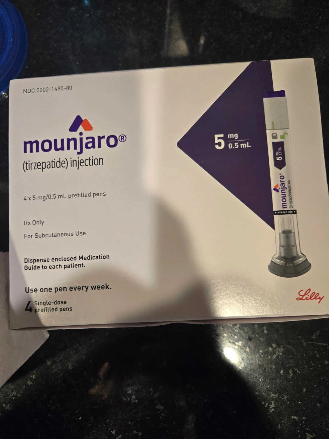 Mounjaro (tirzepatide) injection for subcutaneous use. It comes as 4 single-dose prefilled pens, with each pen containing 5mg. Use one pen every week. Brand new unsealed box.