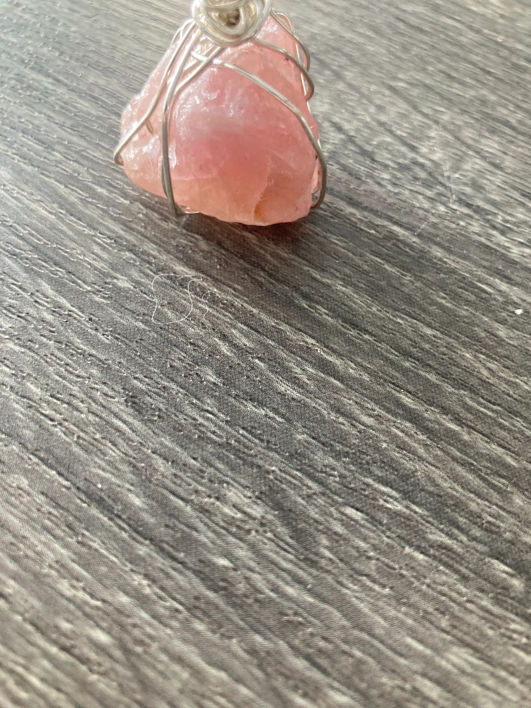 This pendant features a raw stone wrapped in silver-toned wire. A Canadian quarter is shown for scale. It's a unique piece ready for a necklace chain.
