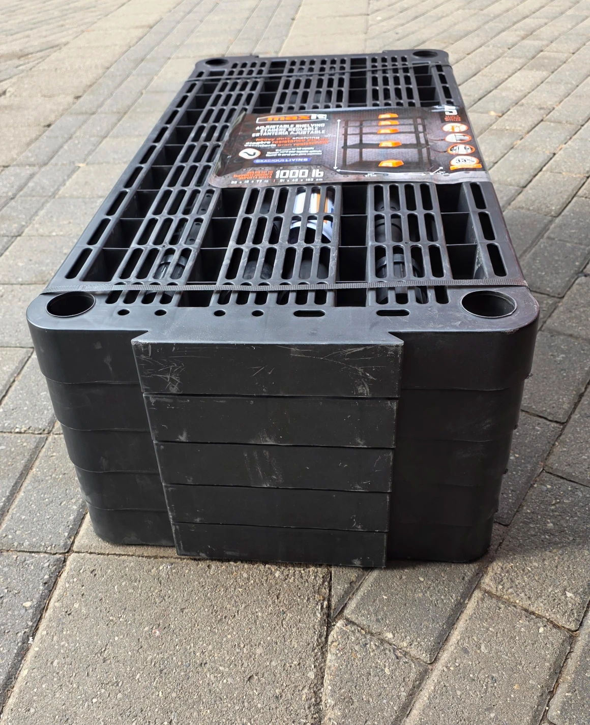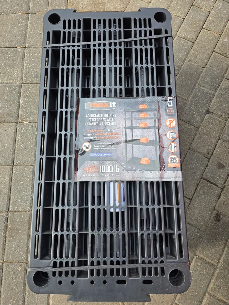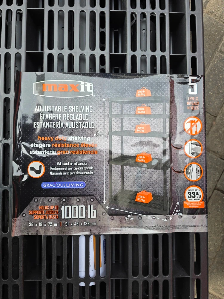 Selling a Max It adjustable shelving unit. It's a heavy-duty shelving system that can hold up to 1000 lb. The dimensions are 36 x 18 x 72 in (91 x 45 x 183 cm). It has 5 levels.
