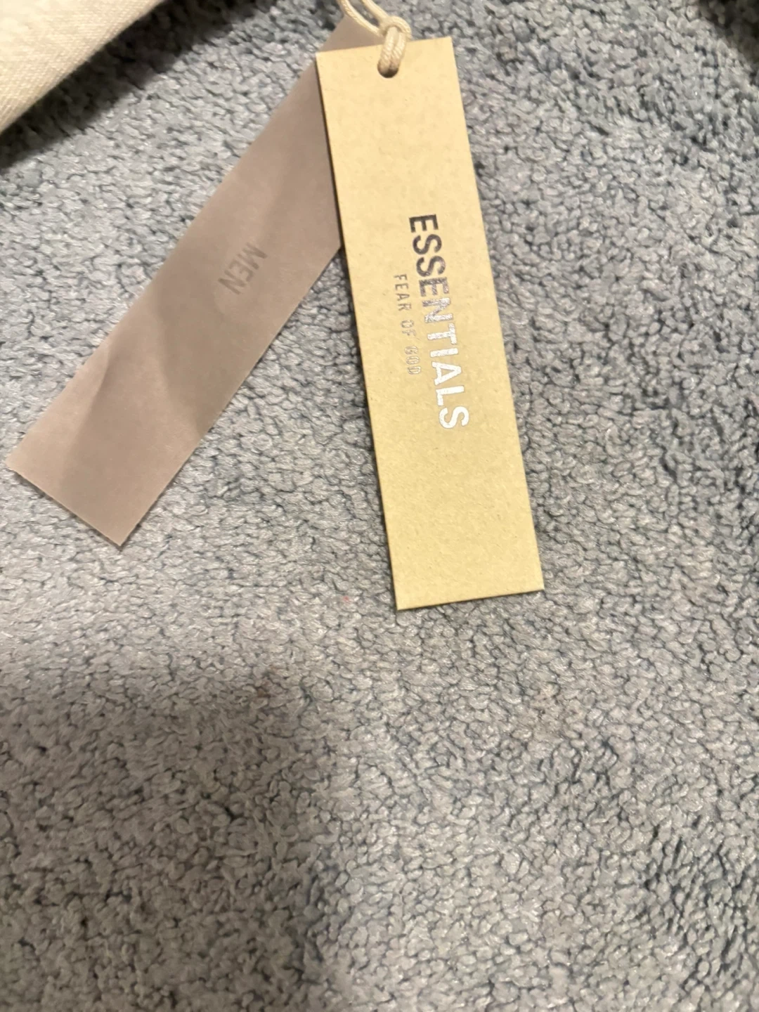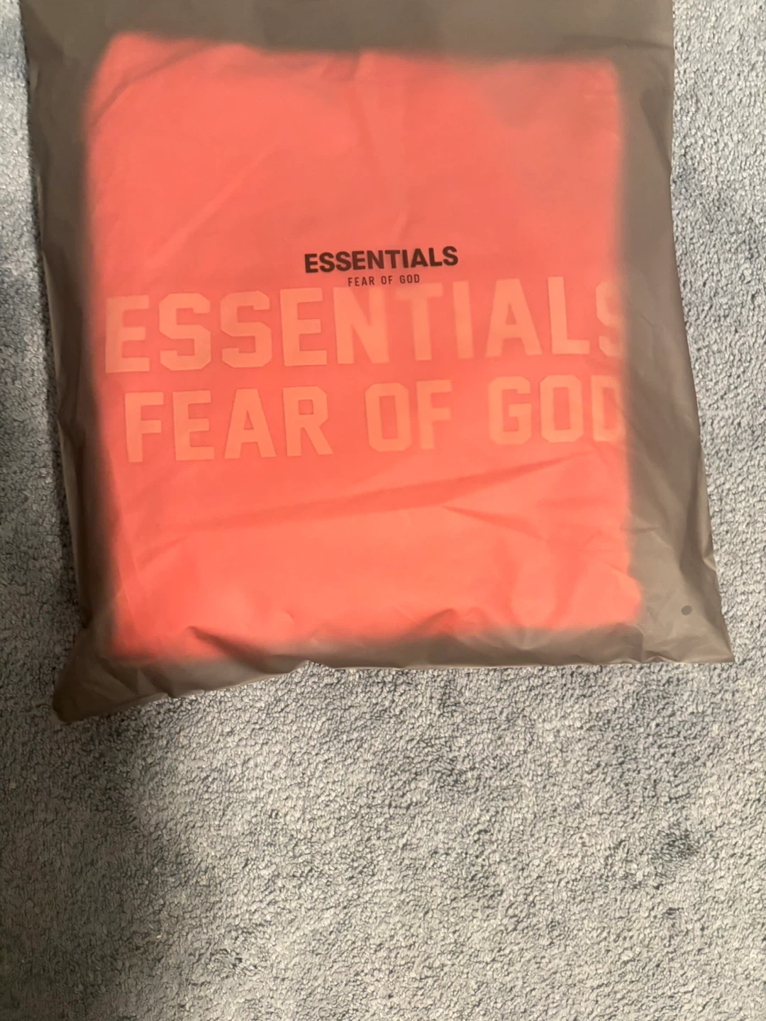 This is a brand new Fear of God Essentials hoodie in a vibrant coral orange colour. It's made of a soft cotton blend. The hoodie comes in its original packaging and has the brand's signature embossed logo on the chest.size: S M XS available