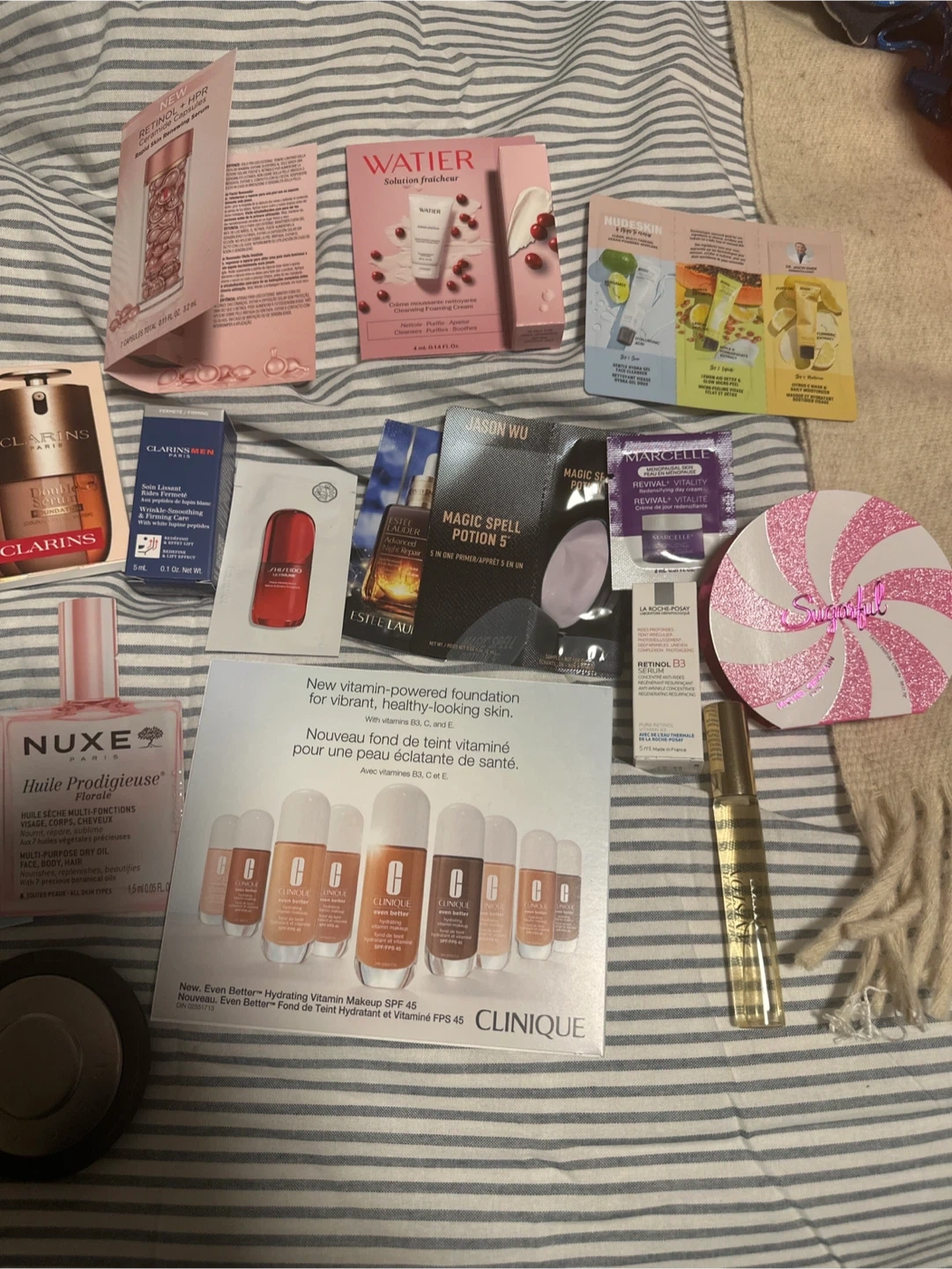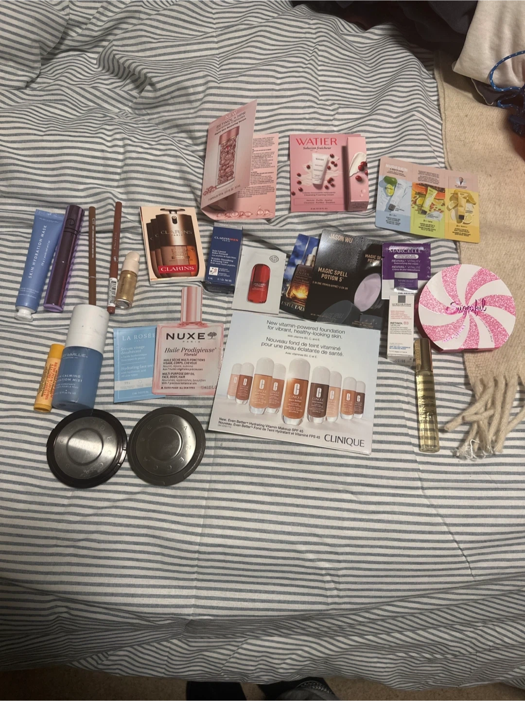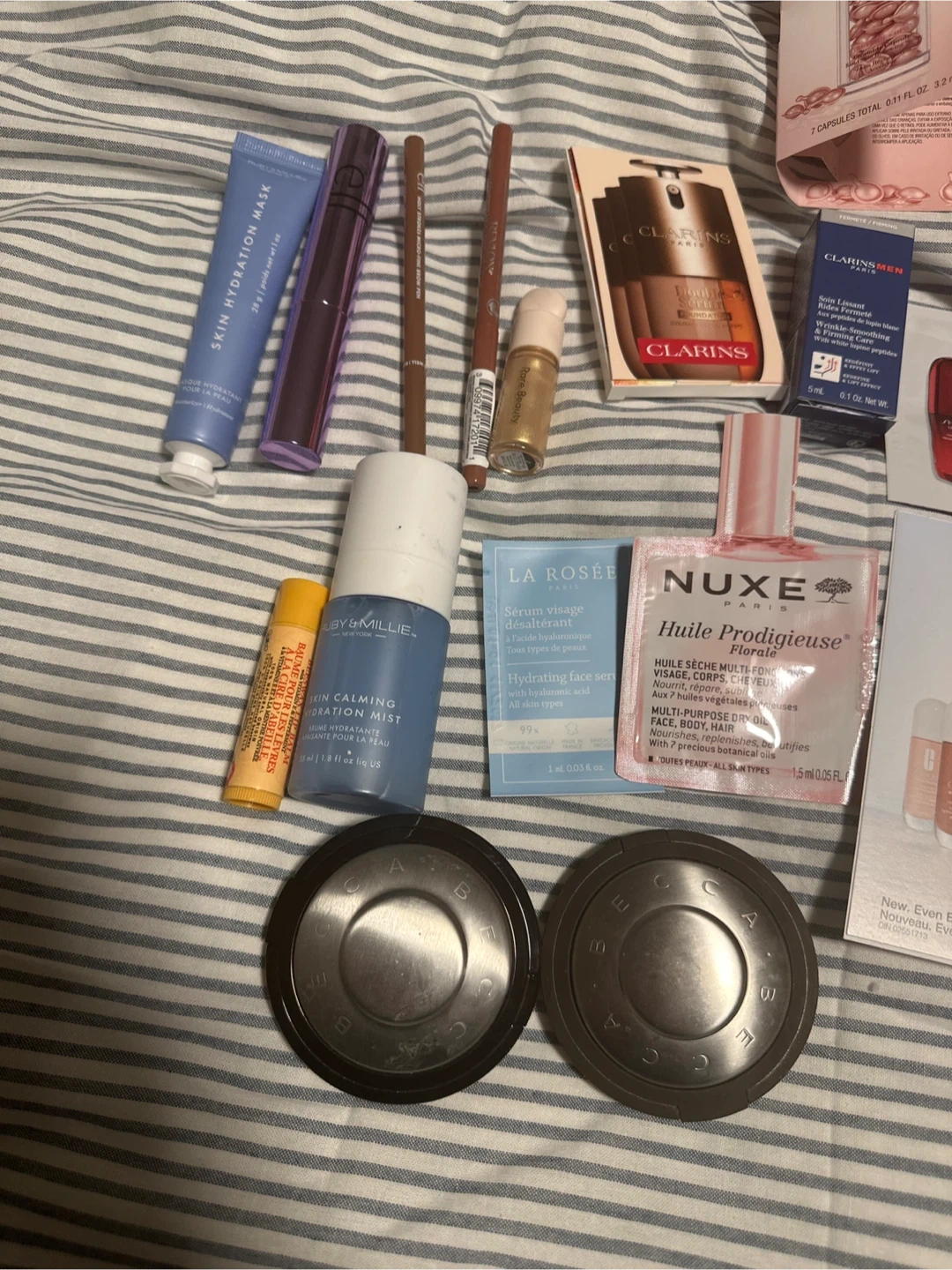 Includes samples from various brands like Clarins, La Rosée, Clinique, and NUXE. Some full-size items are also present, such as a First Aid Beauty Skin Hydration Mask and a Rubyface Skin Calming Glow Mist. These items are great for trying new skincare and makeup.