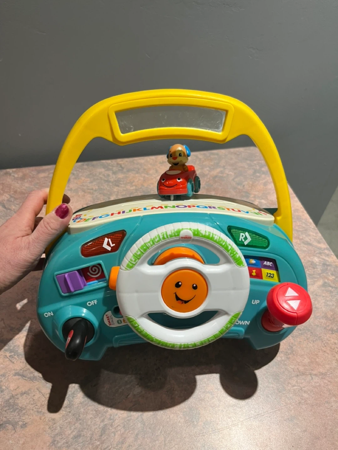 Fisher-Price Laugh & Learn Smart Stages dashboard toy with steering wheel and buttons. It teaches ABCs, numbers, and weather. Comes with a little dog in a car accessory. Perfect for little ones learning to explore!