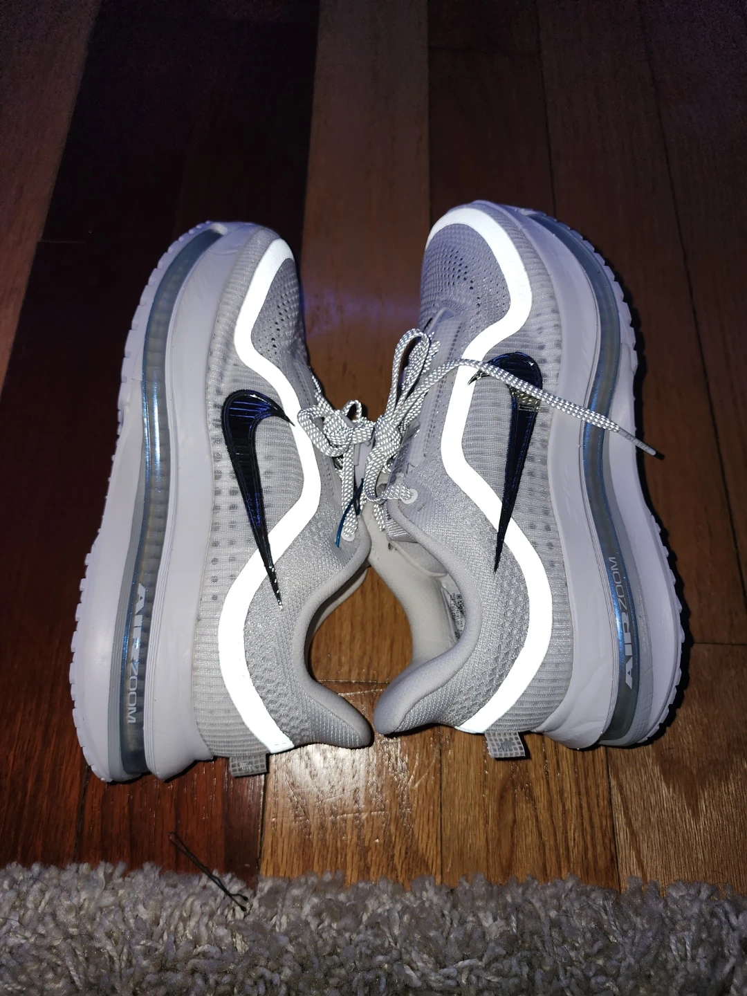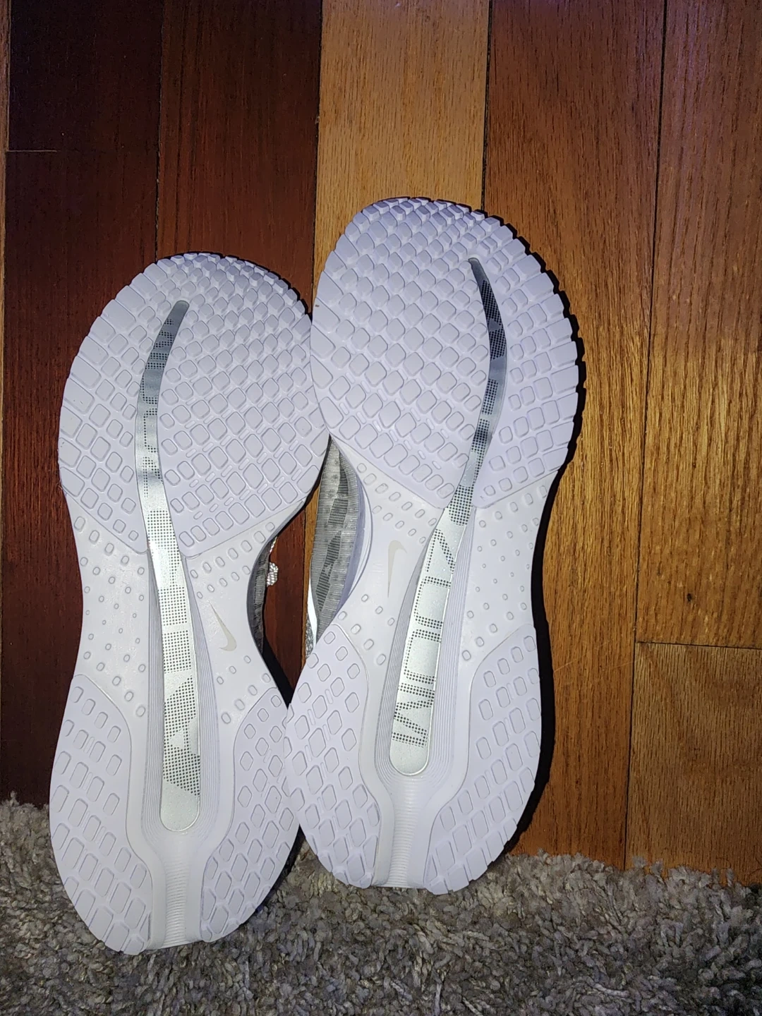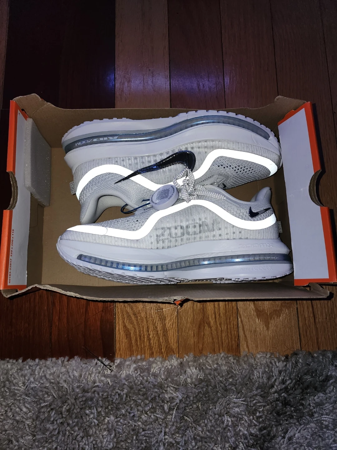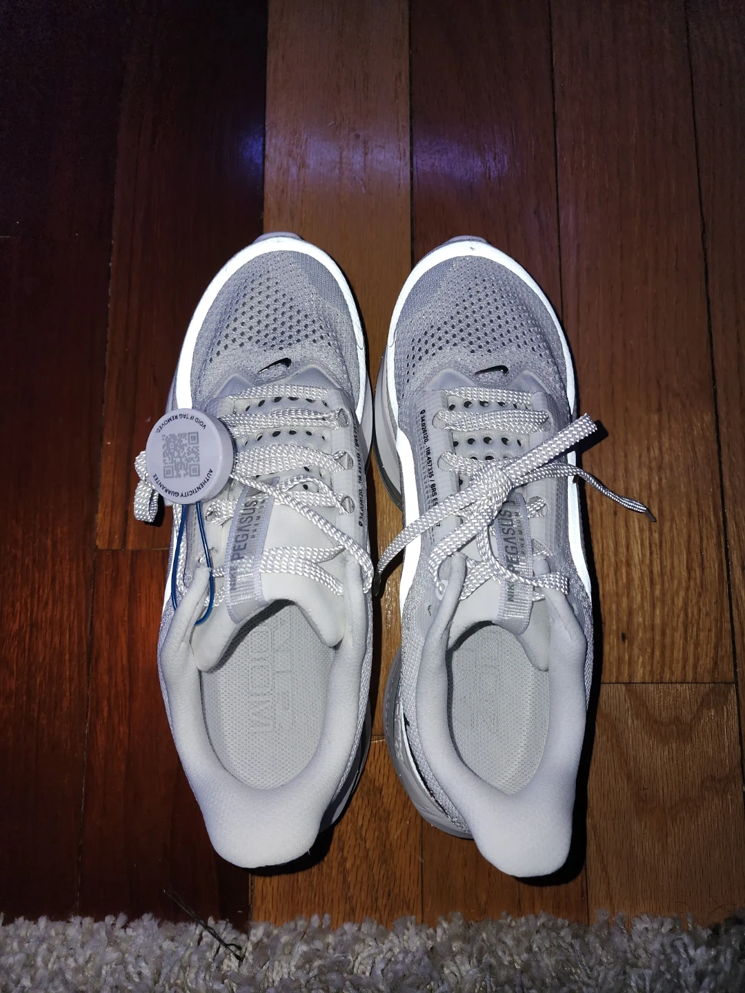 These Nike Air Zoom Pegasus running shoes are white with reflective accents. They feature a breathable mesh upper and visible Zoom Air units in the sole for responsive cushioning. The shoes come with their original box. No lid and authenticated. Brand new and never worn.
