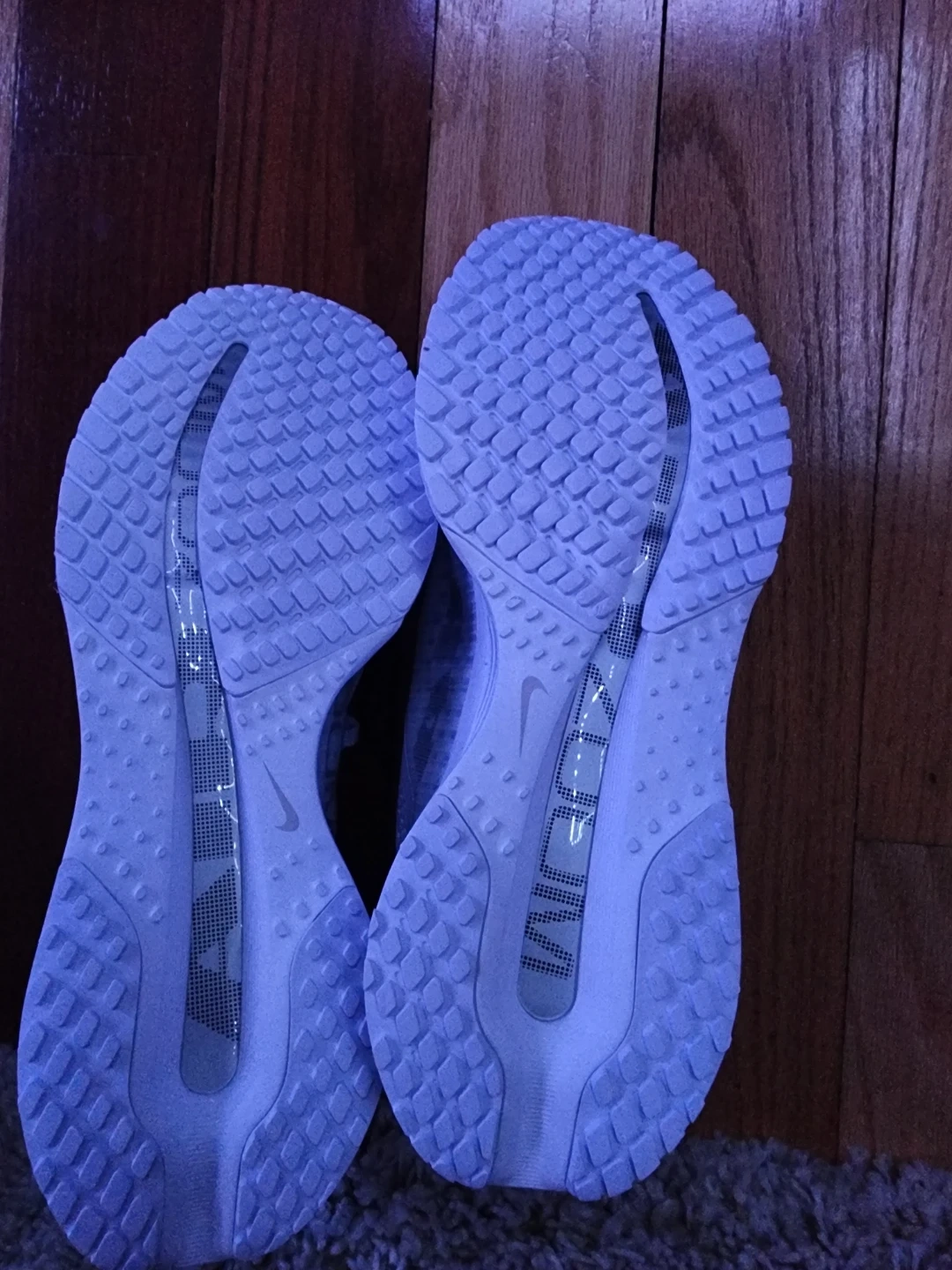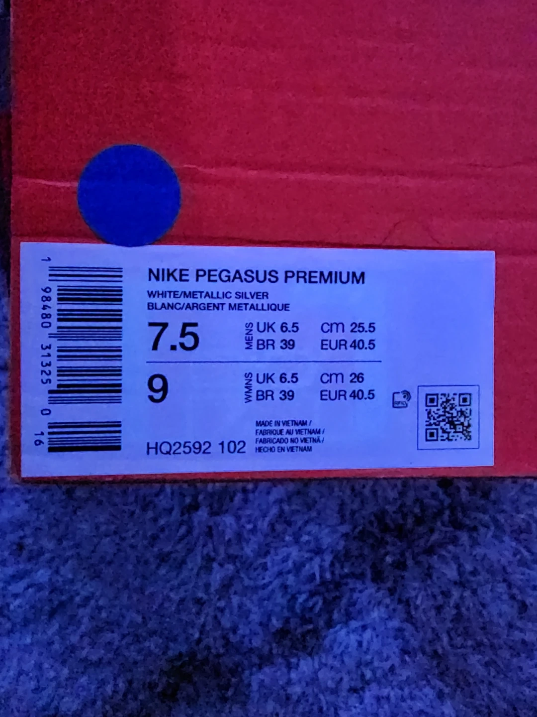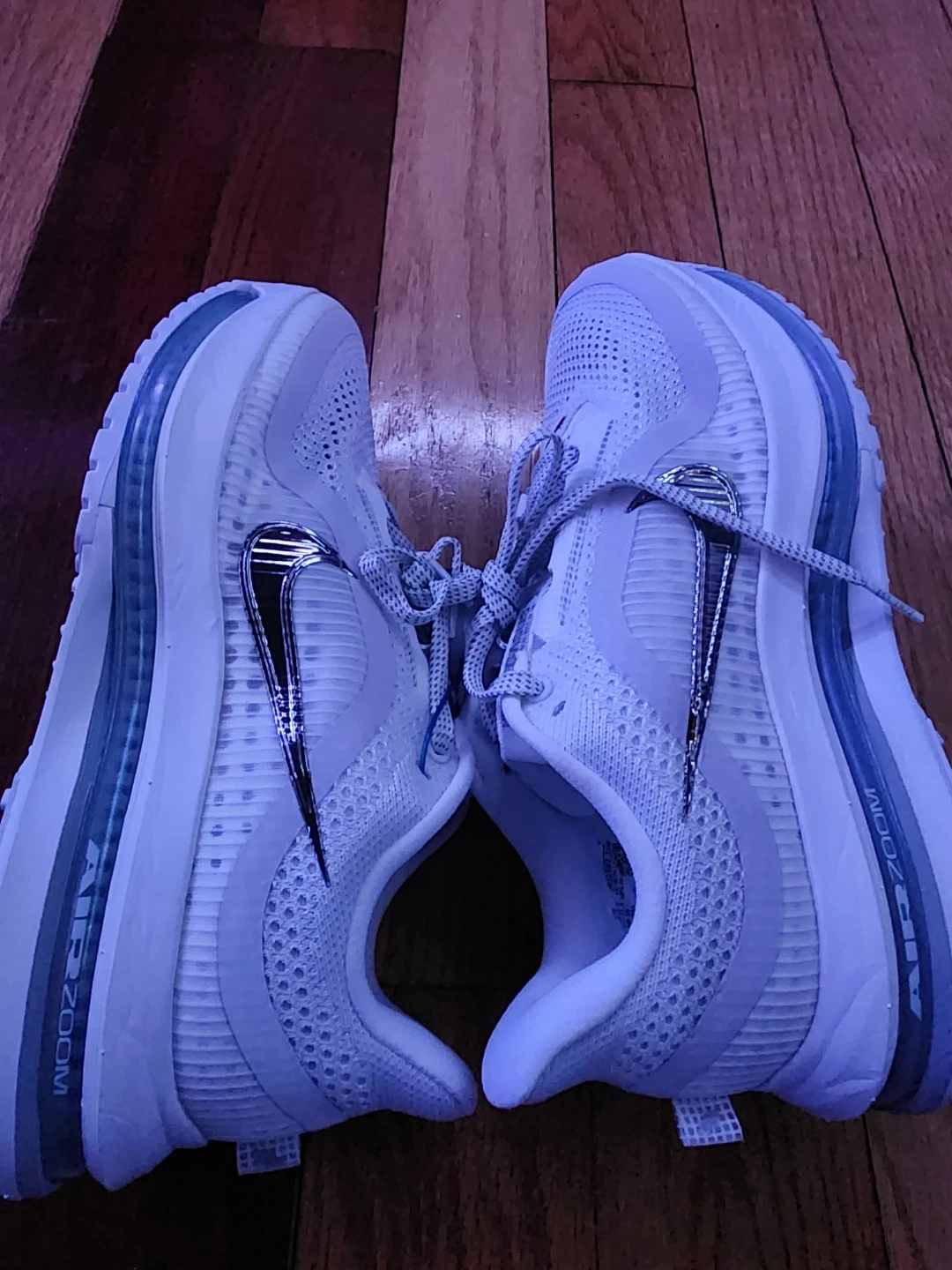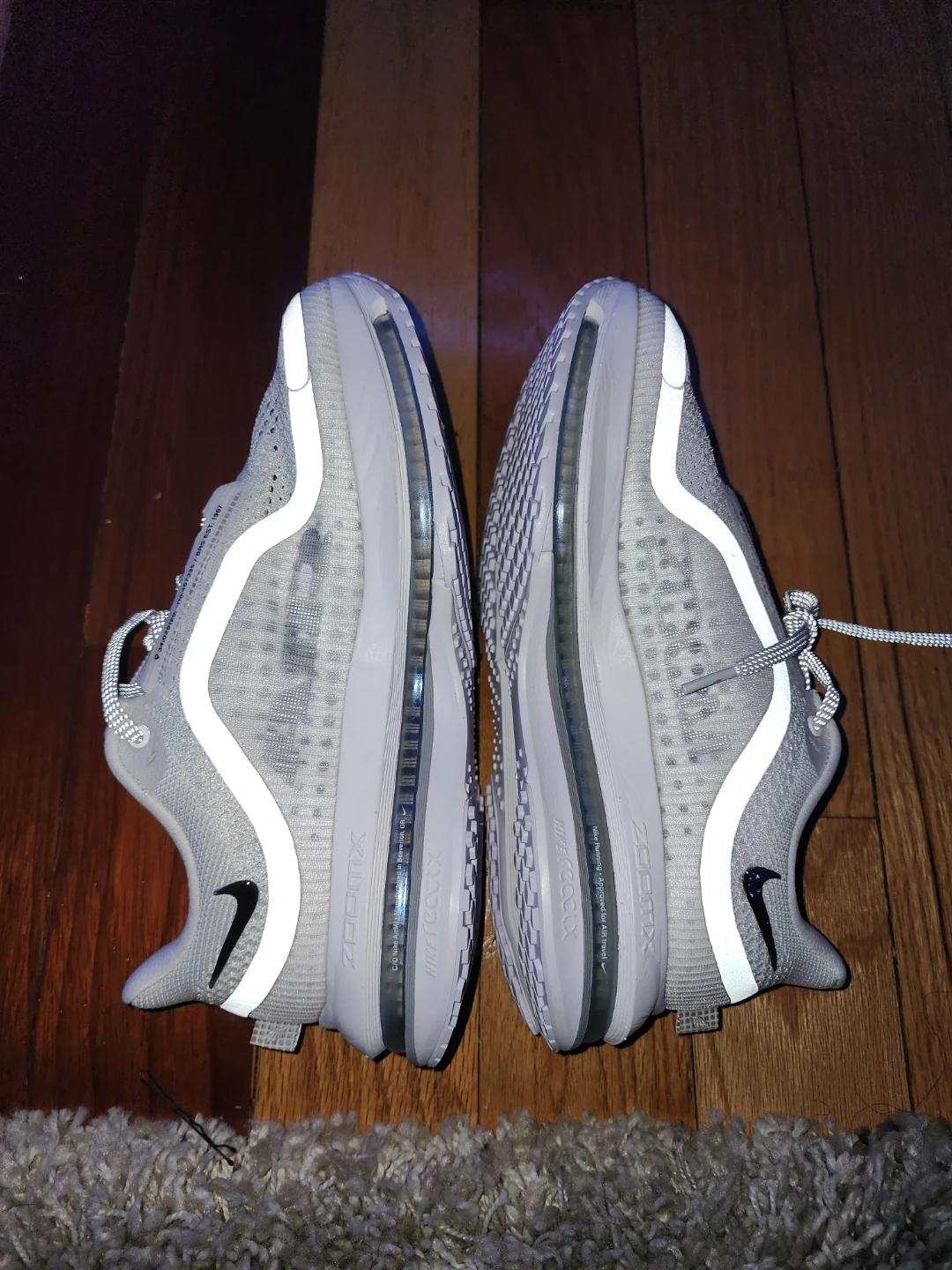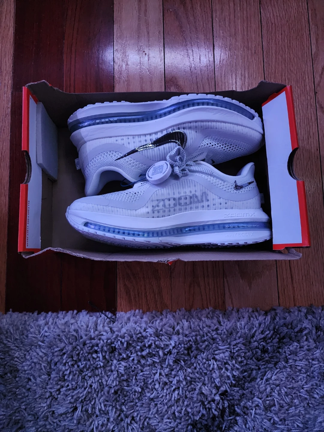 These Nike Air Zoom Pegasus running shoes are white with reflective accents. They feature a breathable mesh upper and visible Zoom Air units in the sole for responsive cushioning. The shoes come with their original box. No lid and authenticated. Brand new and never worn.