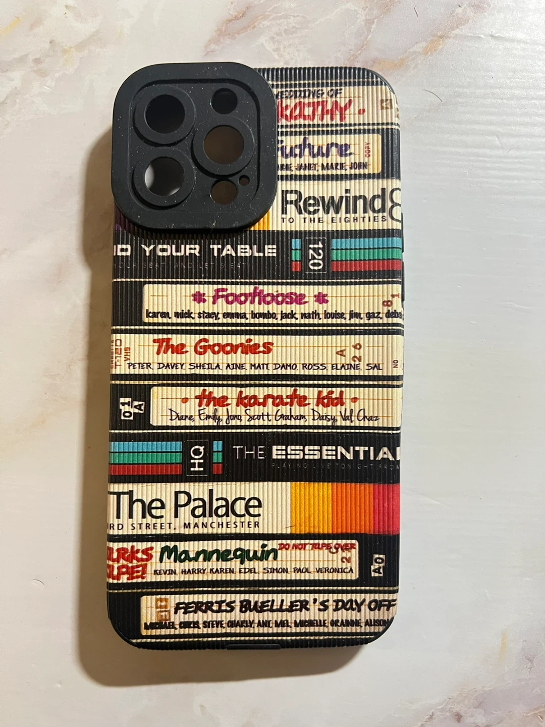 Fun retro iPhone case that looks like a stack of VHS tapes! Features titles like Footloose, The Goonies, The Karate Kid, and Ferris Bueller's Day Off! Great for anyone who loves the 80s