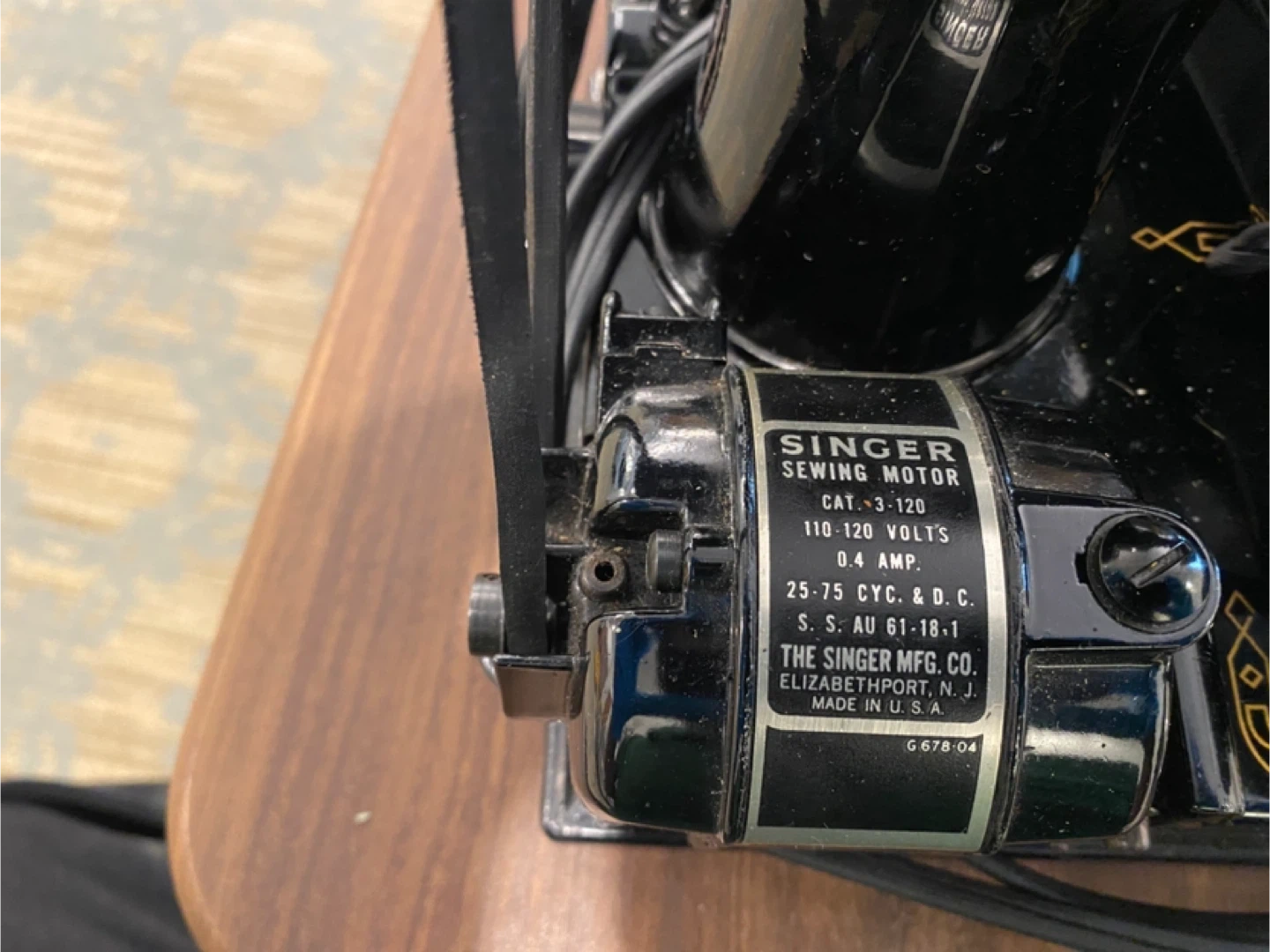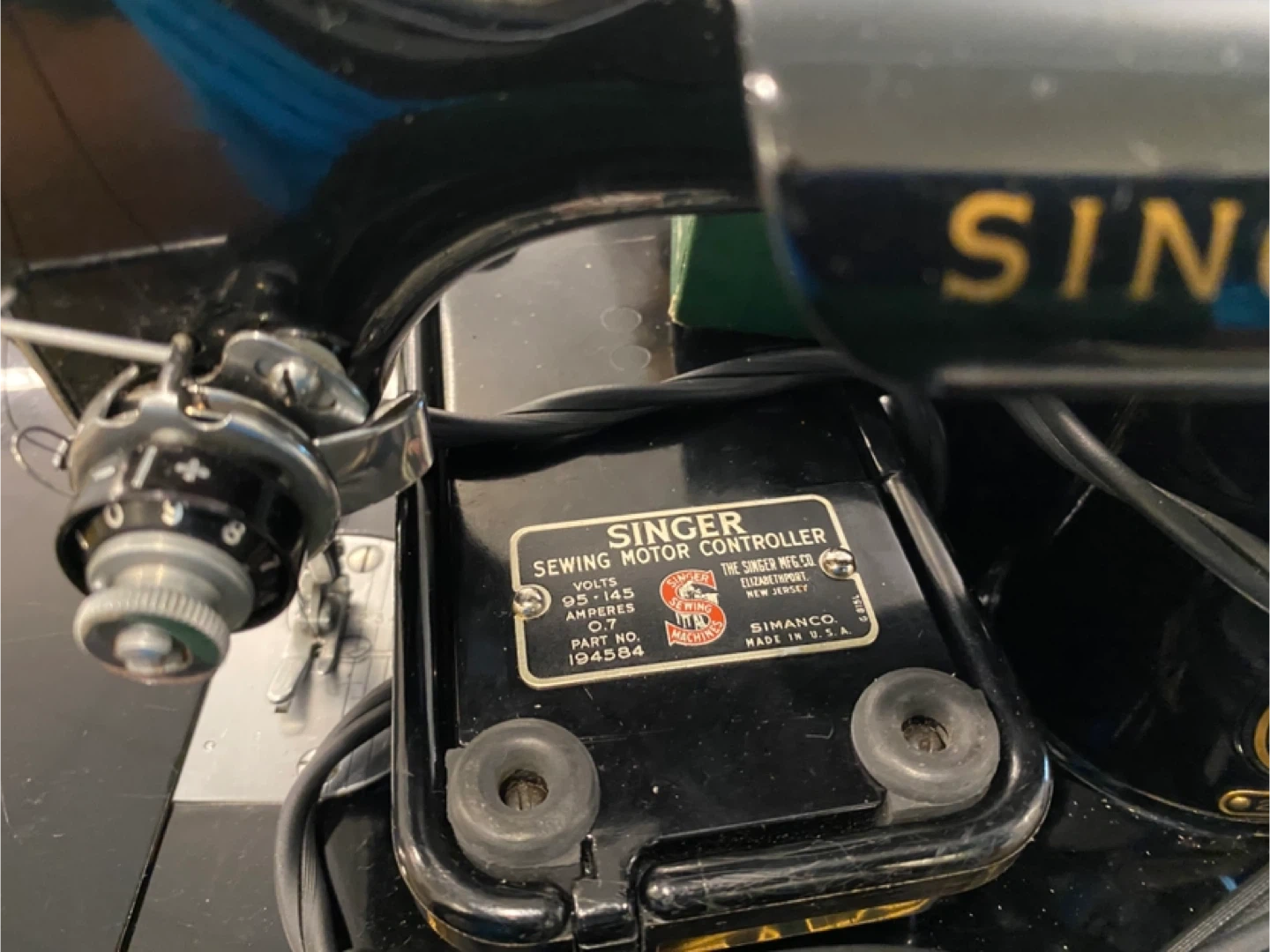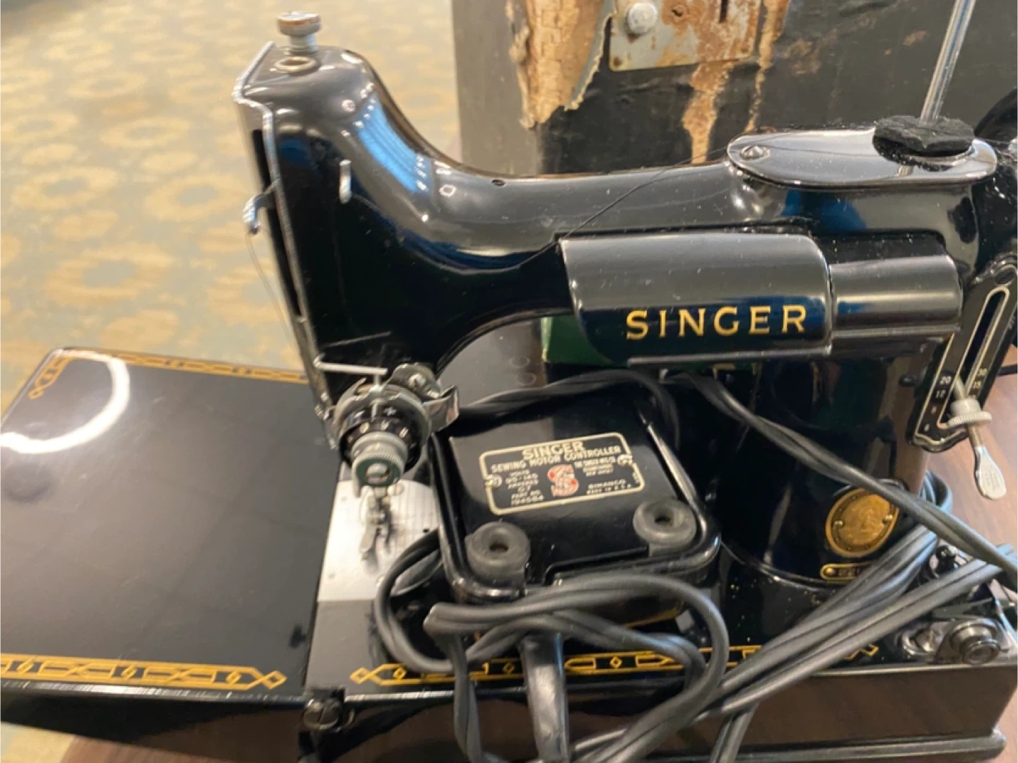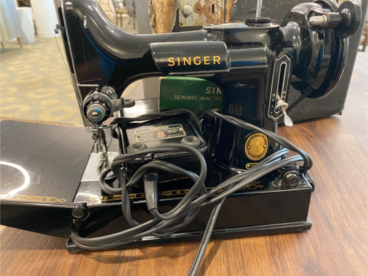 This is a vintage Singer sewing machine. It's black and has the Singer logo on the side. The motor specifications are 110-120 volts, 0.4 amp, 25-75 cyc. & D.C. It's made in the U.S.A.!