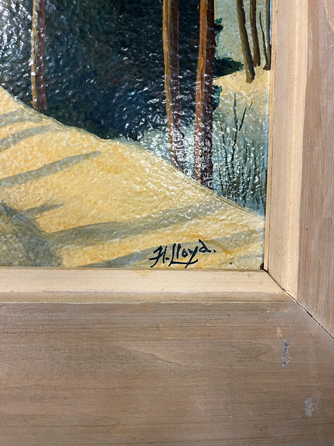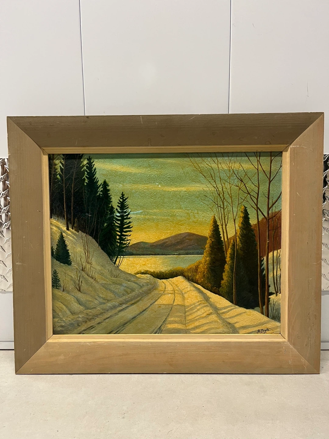 This is a framed vintage painting of a snowy winter landscape with trees and a lake. It's a beautiful piece for any home! The painting is approximately 25x21 inches. Signed by artist.
