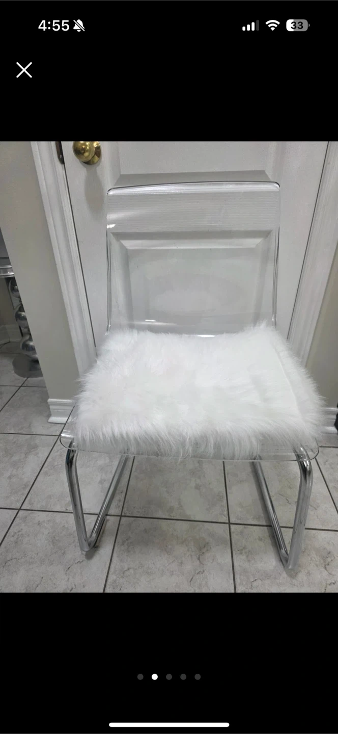 Stylish accent chair featuring a clear acrylic frame and chrome legs. It comes with a removable fluffy white faux fur seat cushion for added comfort 🤍✨ This chair is great for a vanity or as a decorative accent piece!
