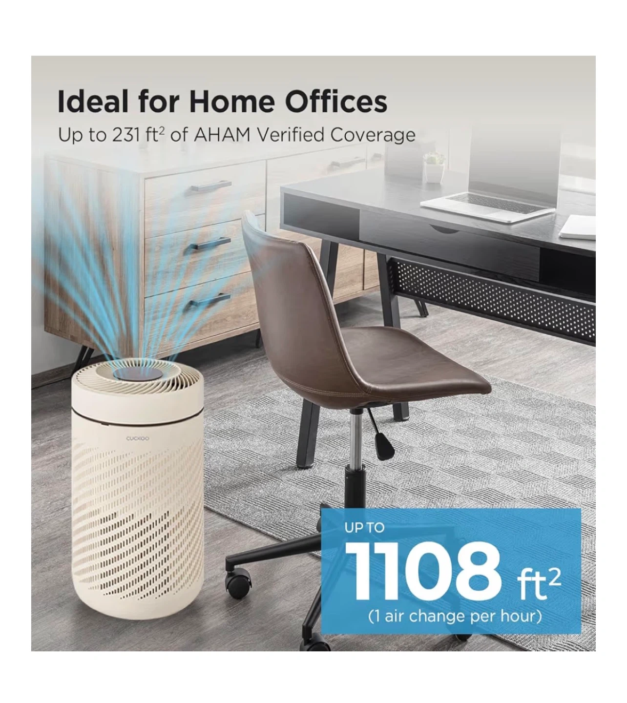 This CUCKOO air purifier is ideal for home offices. It offers AHAM Verified coverage up to 231 ft². It can cover up to 1108 ft² with one air change per hour. This unit's design makes it great for improving air quality in your living or working space.