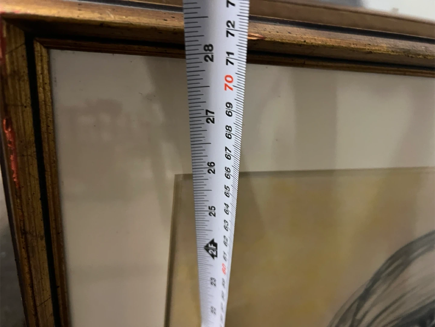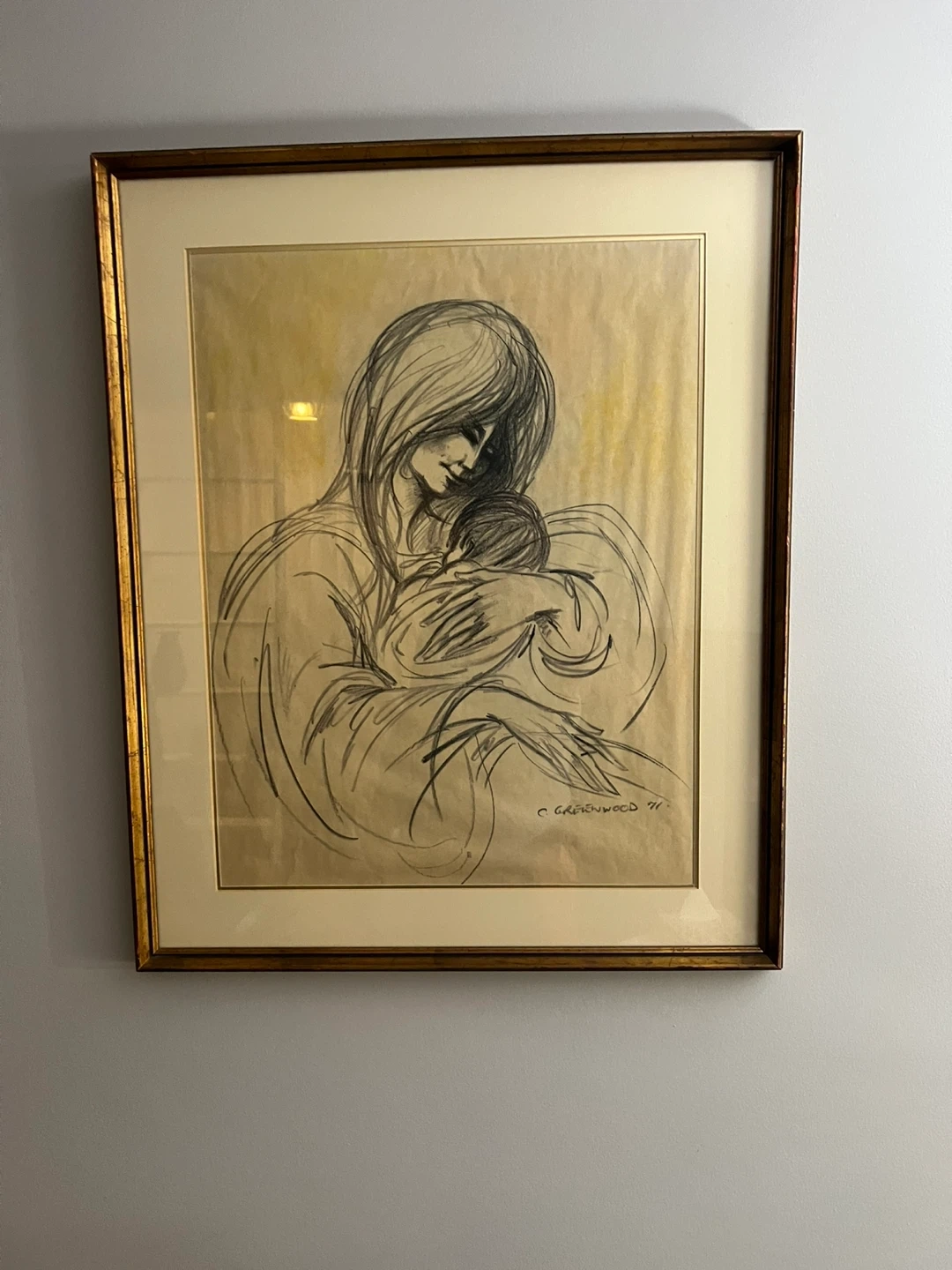 Used Charming framed sketch of a mother holding her baby, signed C. Greenwood and dated '77. It's rendered in charcoal on textured paper with a subtle yellow wash background. The artwork comes in a simple gold-toned frame, ready to hang. This piece would add warmth to any nursery or living space.