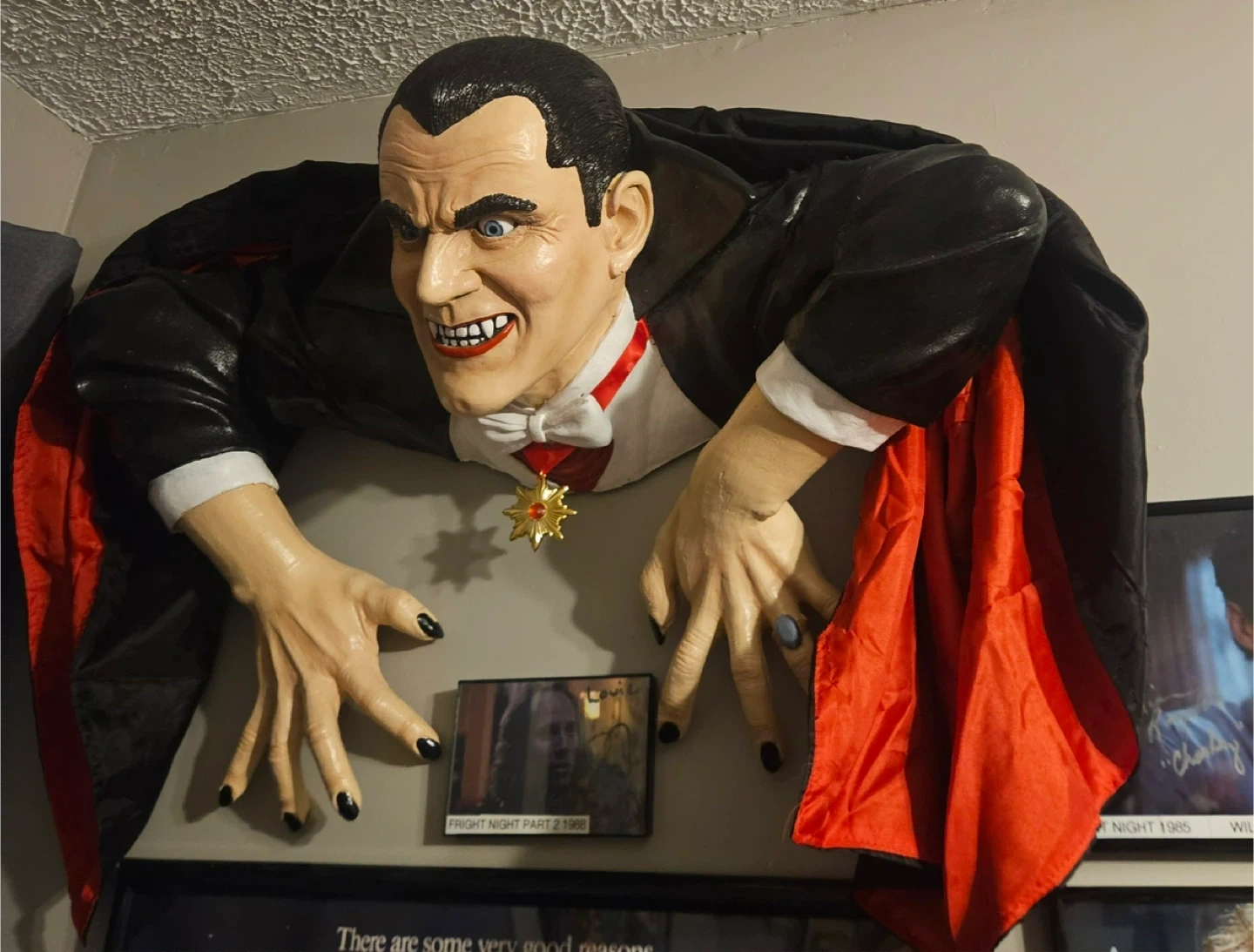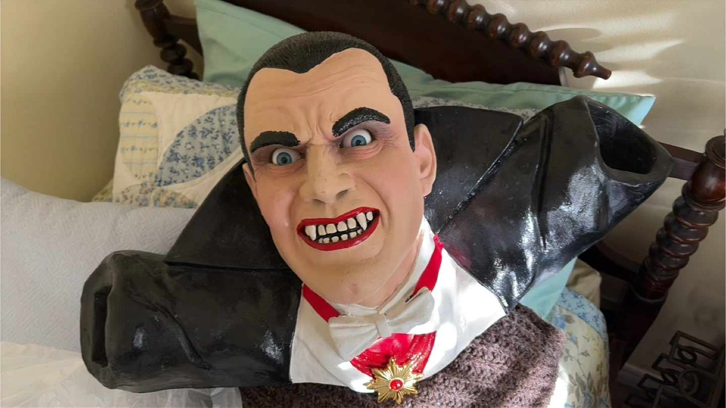 This is a fantastic spooky Dracula figure bust. It's styled wearing a suit and has black painted fingernails with a ring on one finger.This would be an amazing decoration for Halloween or any horror movie fan!