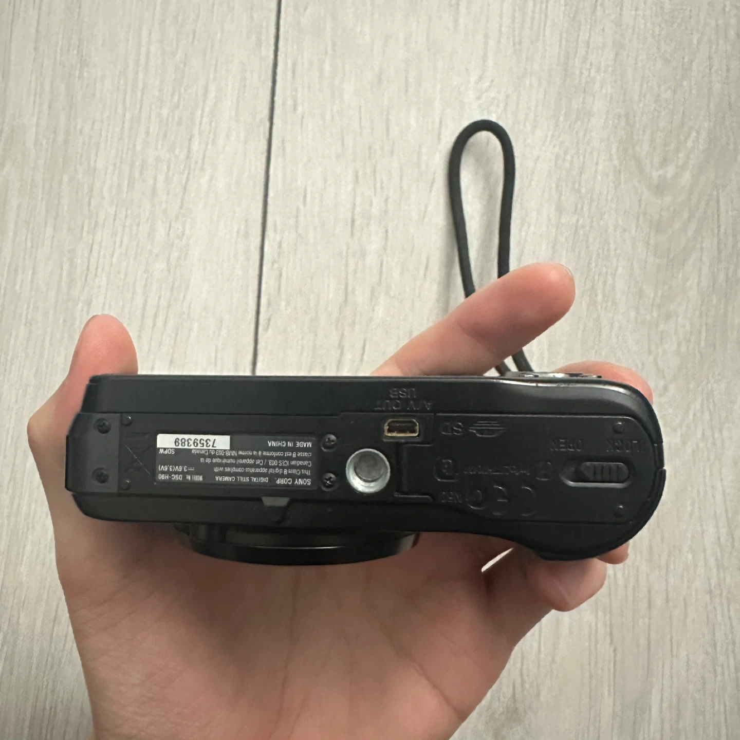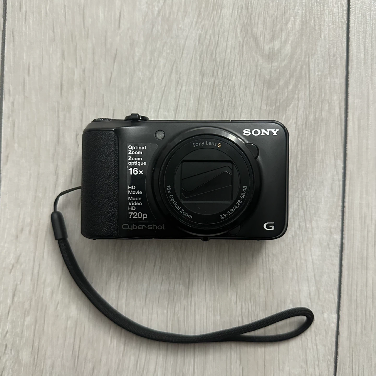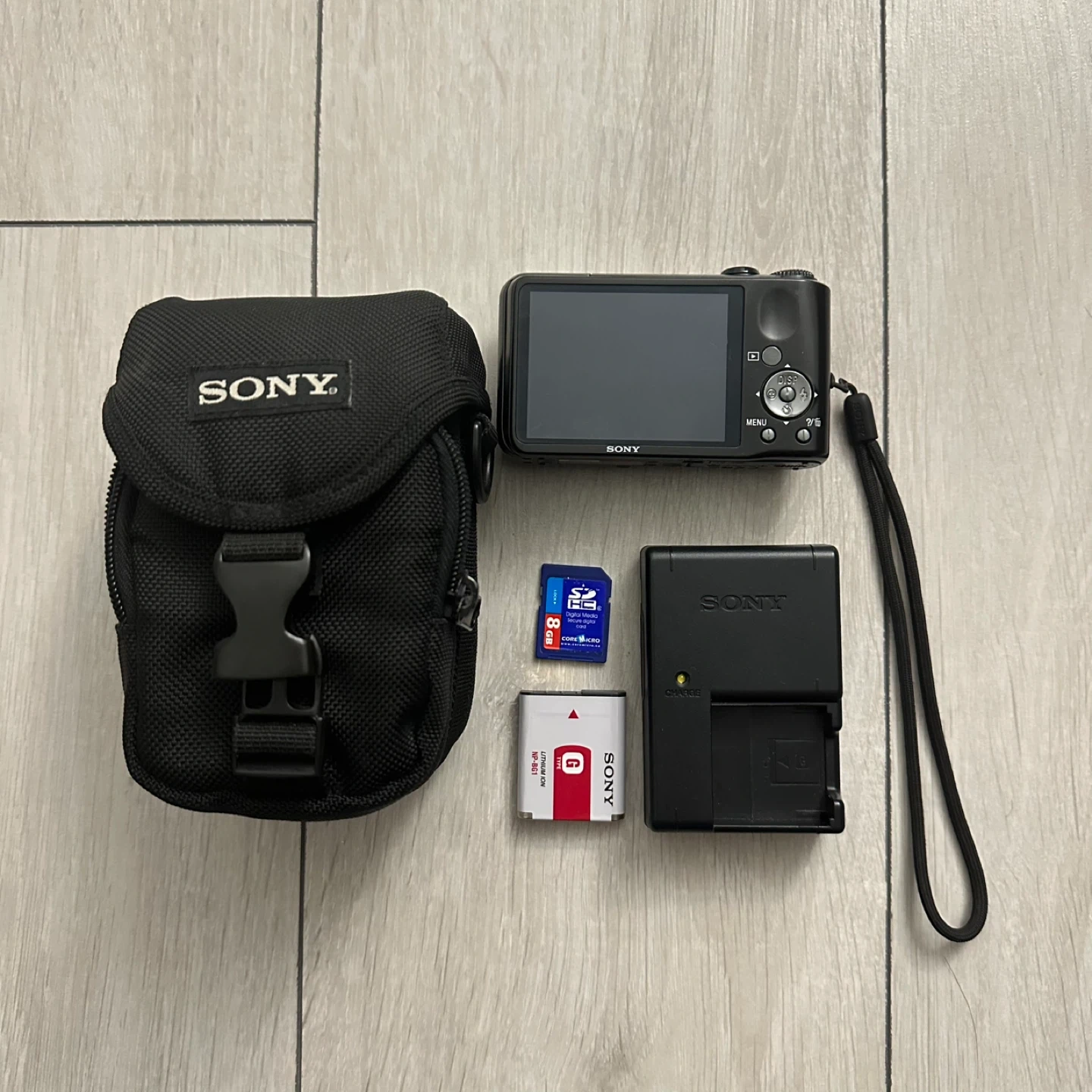 This is a Sony Cyber-shot DSC-H90 digital camera. It comes with a protective case, a 8 gb SD card, a battery, and a wall charger. The camera is in mint condition and performs perfectly in every aspect.