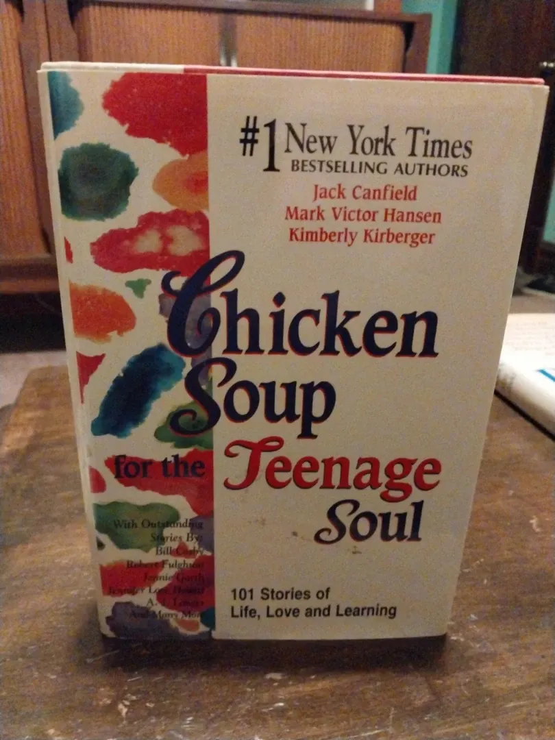 This book is "Chicken Soup for the Teenage Soul." It's a collection of 101 stories about life, love, and learning. The book features contributions from numerous authors.